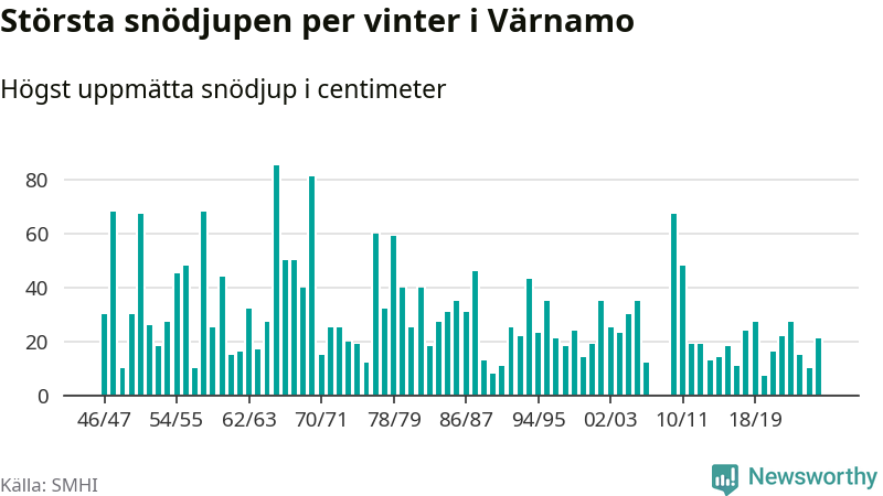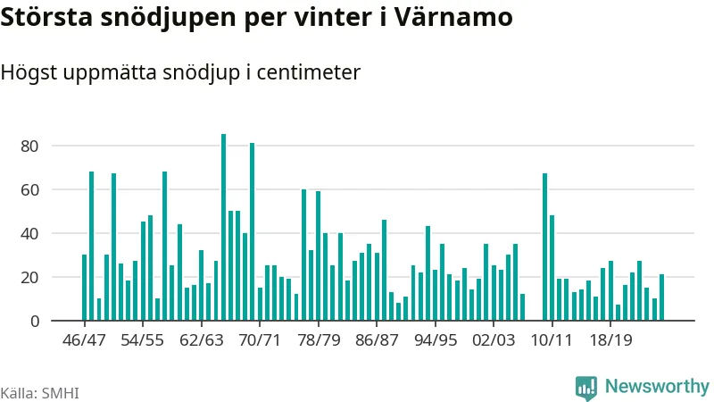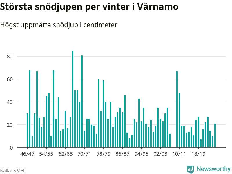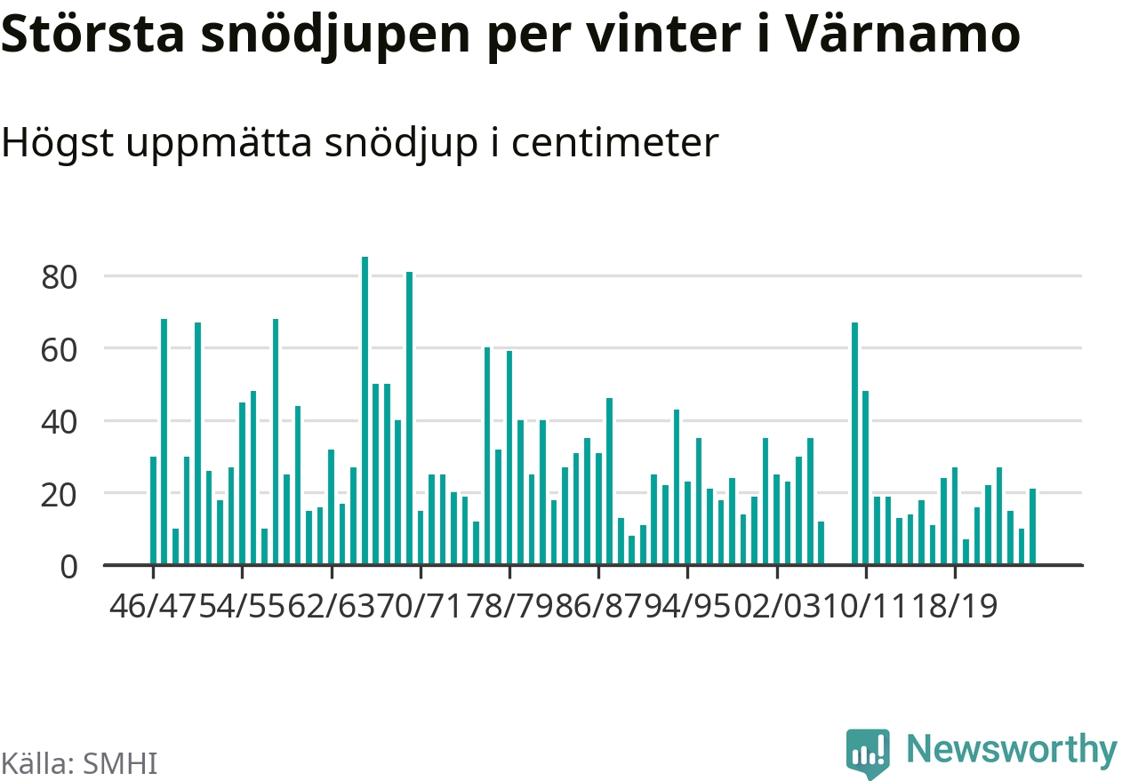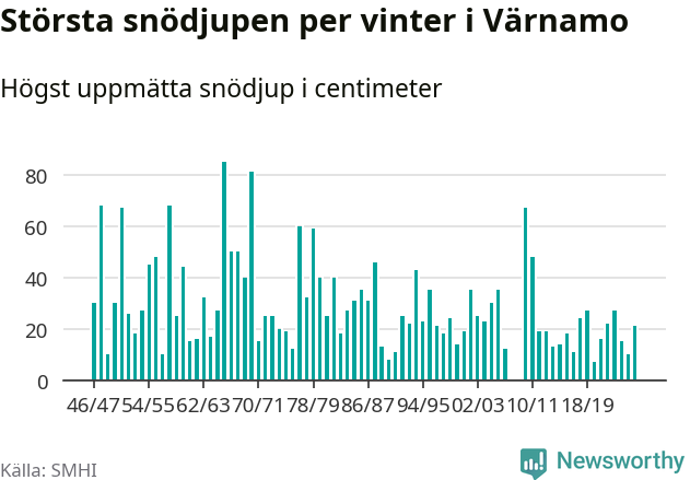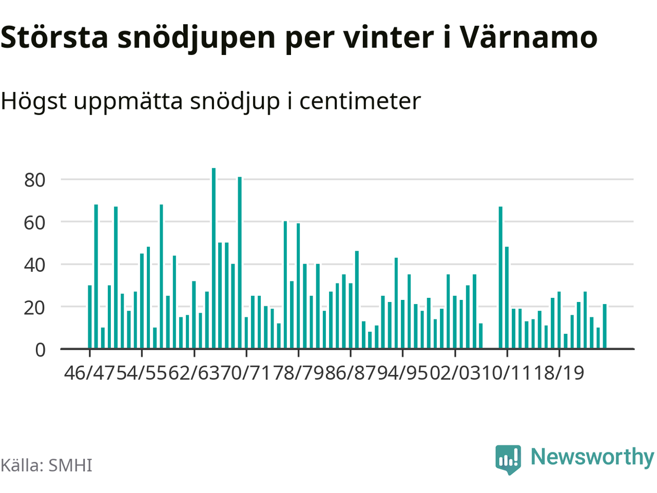 Men hur står sig det snödjupet historiskt sett? Newsworthy har tittat på det största snödjup som SMHI har uppmätt i Värnamo kommun varje år sedan vintern 1946/47 – och hittills tar sig årets vinter inte in bland de 25 vintrarna med störst uppmätt snödjup i kommunen.
