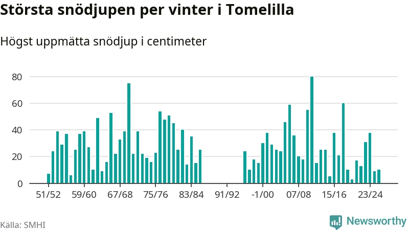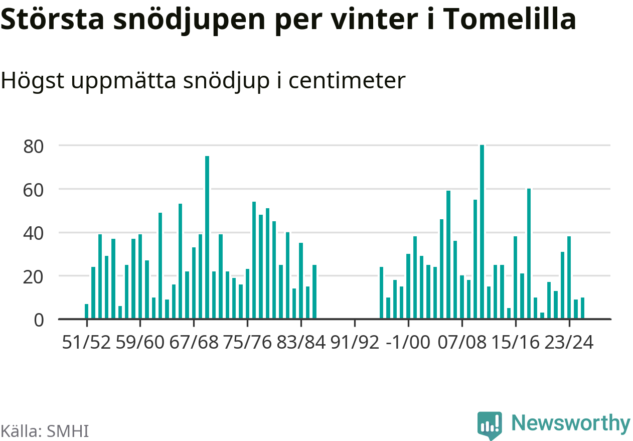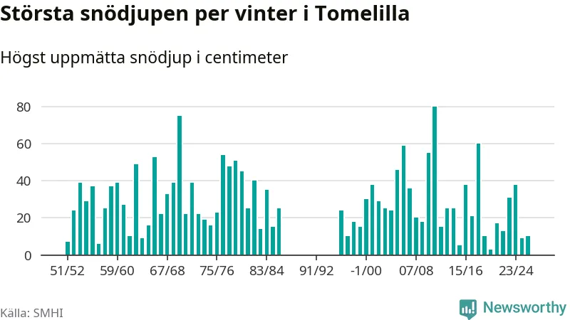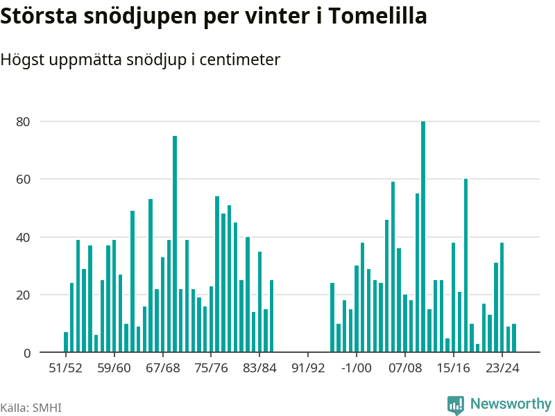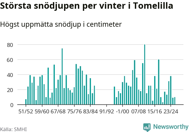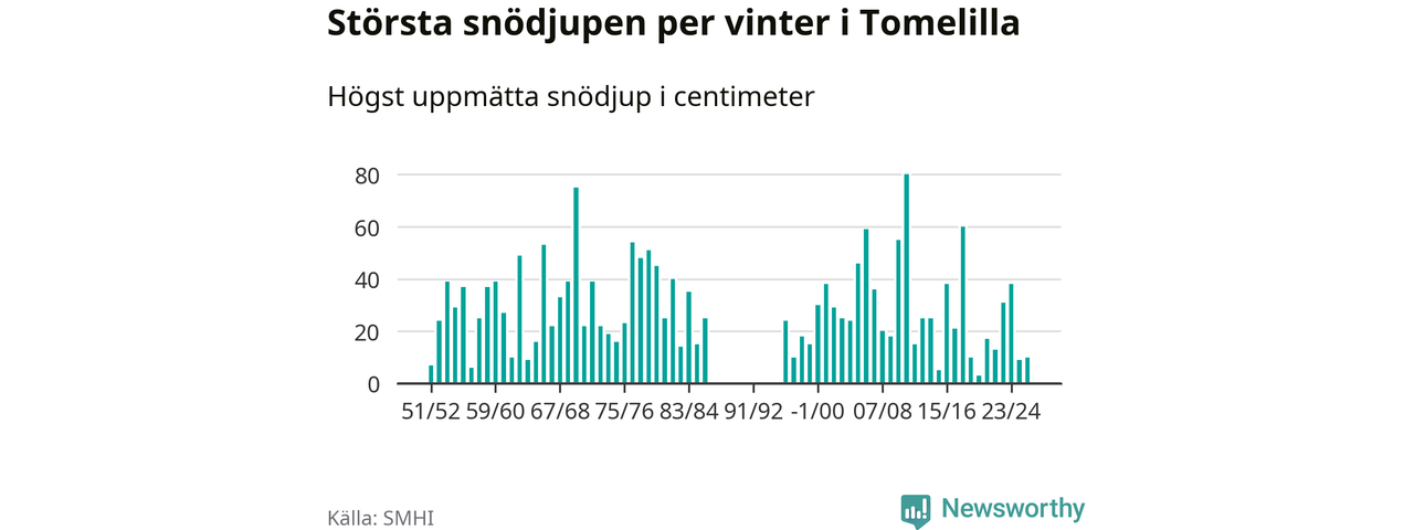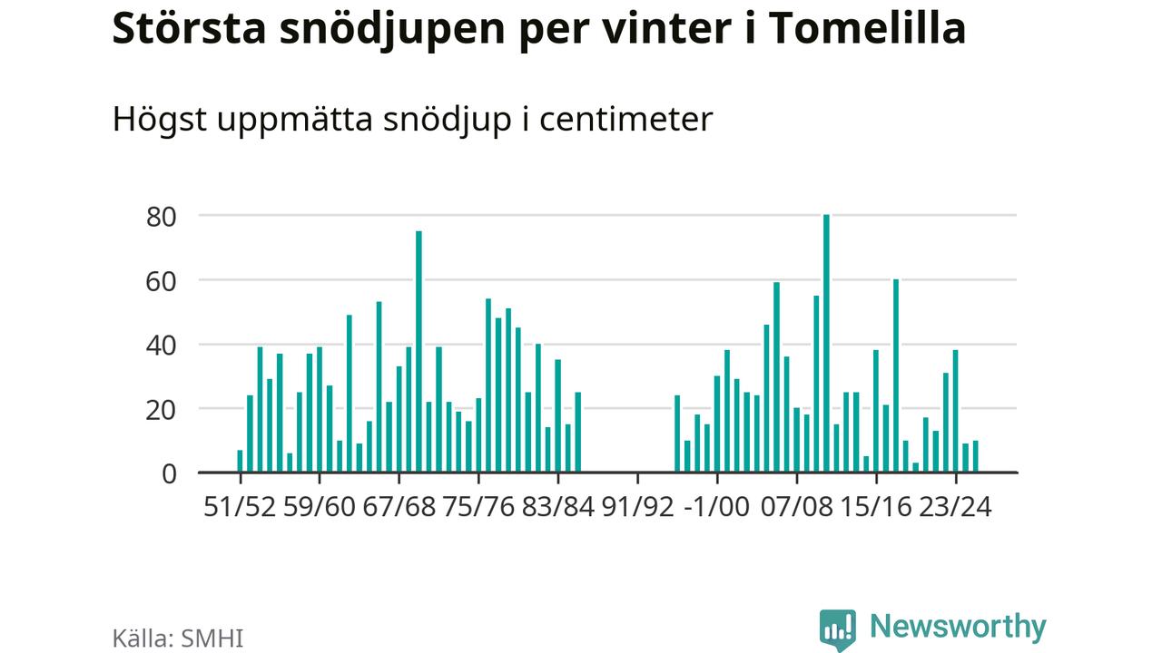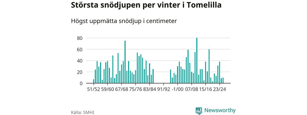 Men hur står sig det snödjupet historiskt sett? Newsworthy har tittat på det största snödjup som SMHI har uppmätt i Tomelilla kommun varje år sedan vintern 1951/52 – och hittills tar sig årets vinter inte in bland de 25 vintrarna med störst uppmätt snödjup i kommunen. Det ska sägas att det inte finns några noteringar för åren 1987–1995.