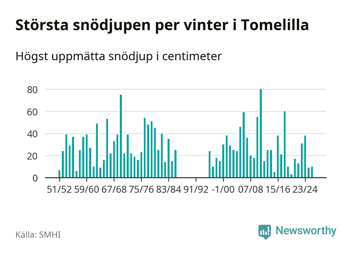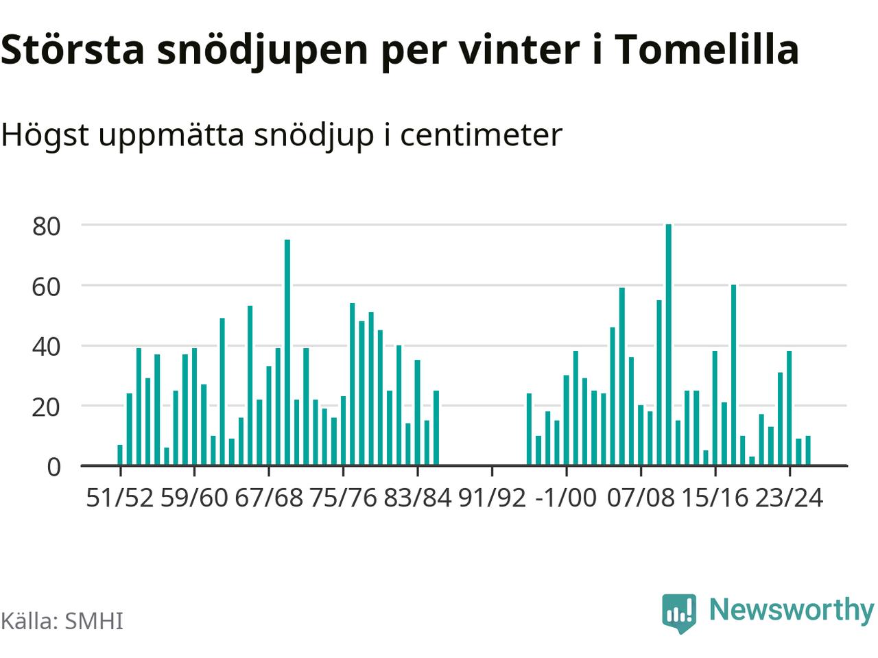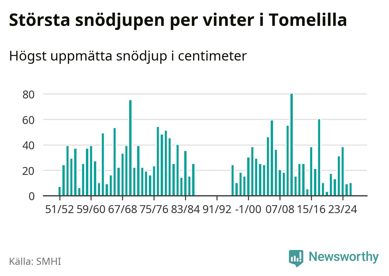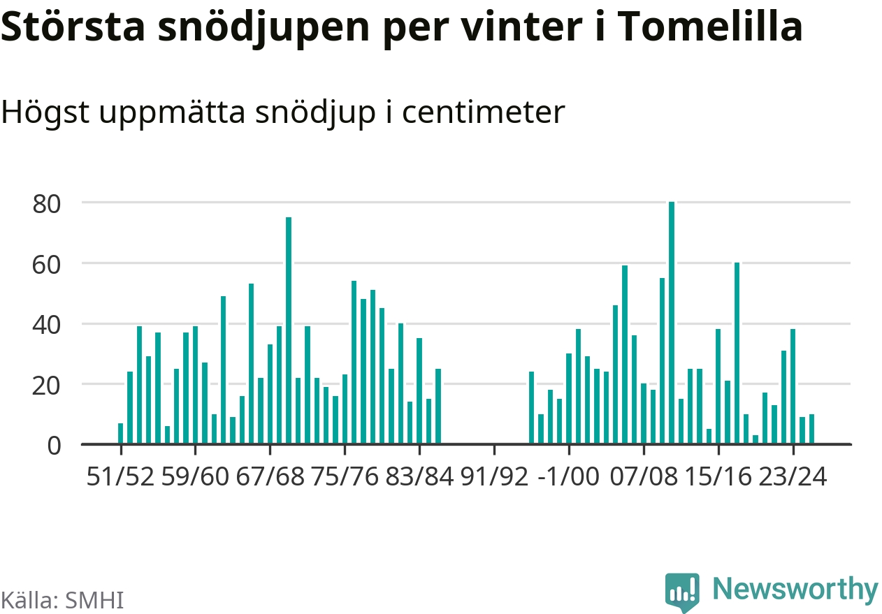 Men hur står sig det snödjupet historiskt sett? Newsworthy har tittat på det största snödjup som SMHI har uppmätt i Tomelilla kommun varje år sedan vintern 1951/52 – och hittills tar sig årets vinter inte in bland de 25 vintrarna med störst uppmätt snödjup i kommunen. Det ska sägas att det inte finns några noteringar för åren 1987–1995.