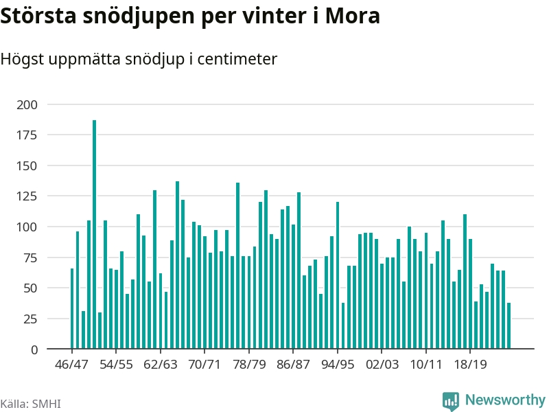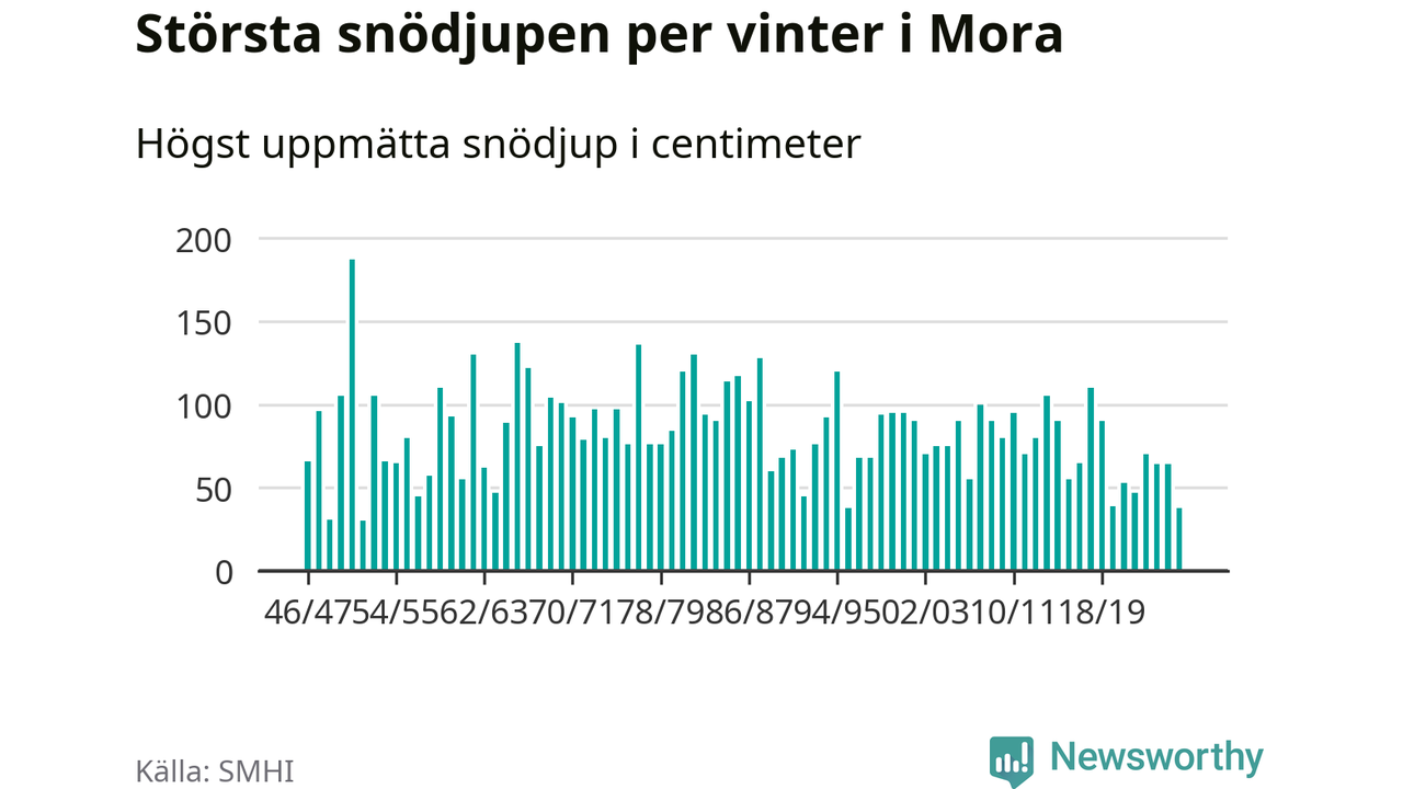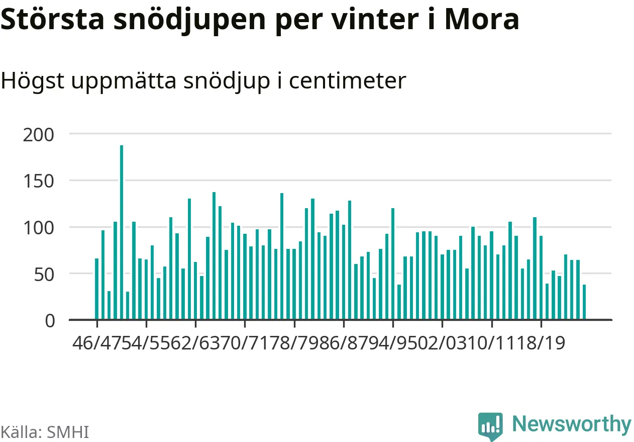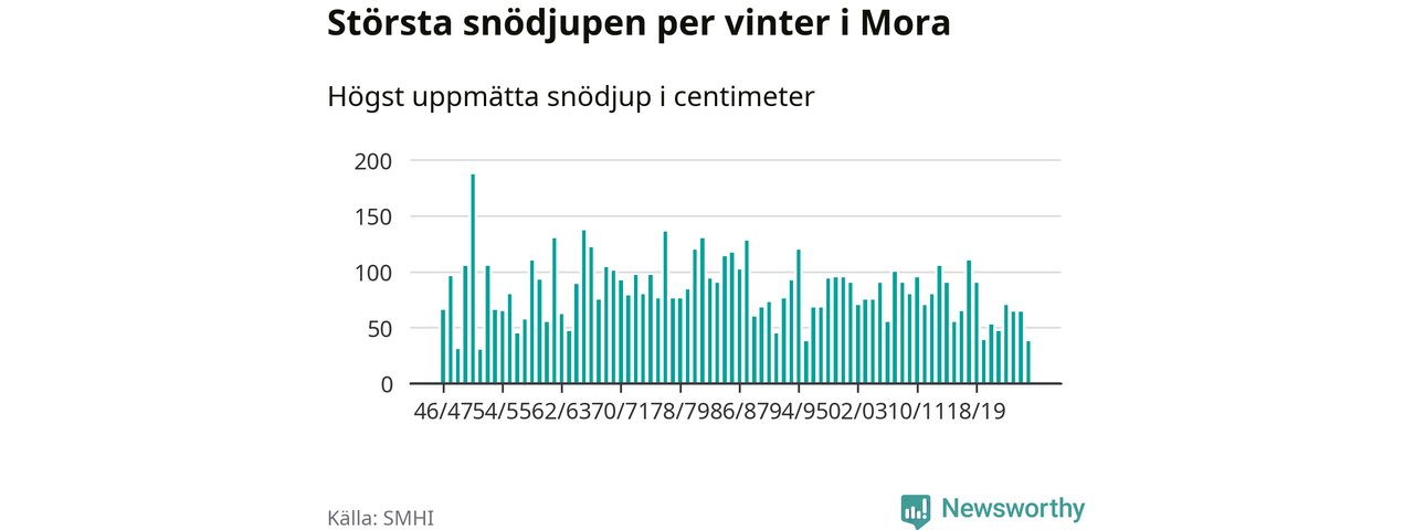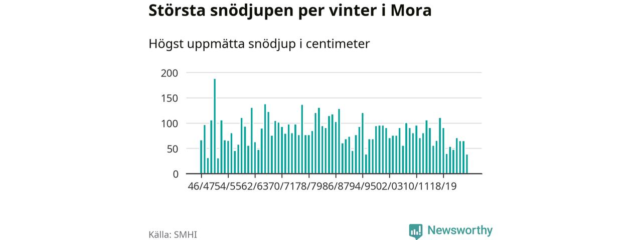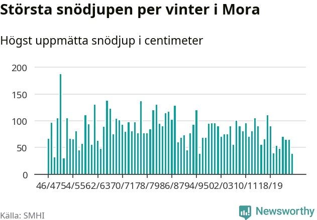 Men hur står sig det snödjupet historiskt sett? Newsworthy har tittat på det största snödjup som SMHI har uppmätt i Mora kommun varje år sedan vintern 1946/47 – och hittills tar sig årets vinter inte in bland de 25 vintrarna med störst uppmätt snödjup i kommunen.
