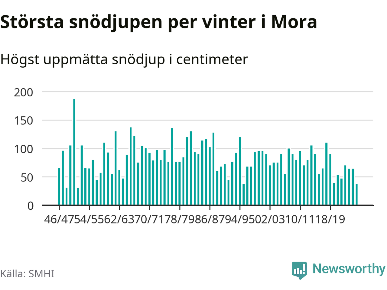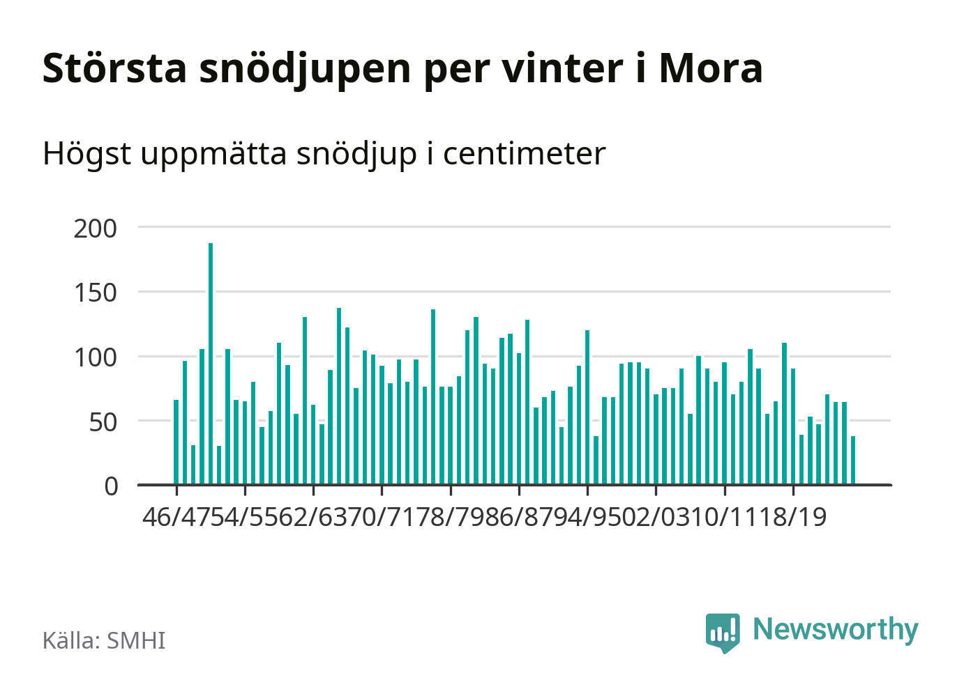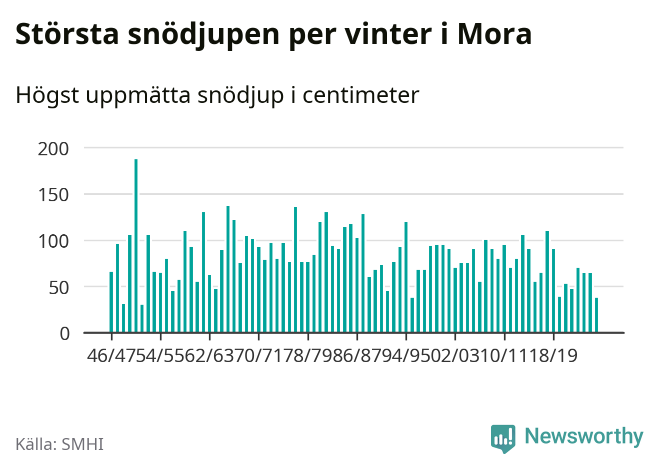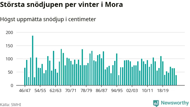Men hur står sig det snödjupet historiskt sett? Newsworthy har tittat på det största snödjup som SMHI har uppmätt i Mora kommun varje år sedan vintern 1946/47 – och hittills tar sig årets vinter inte in bland de 25 vintrarna med störst uppmätt snödjup i kommunen.