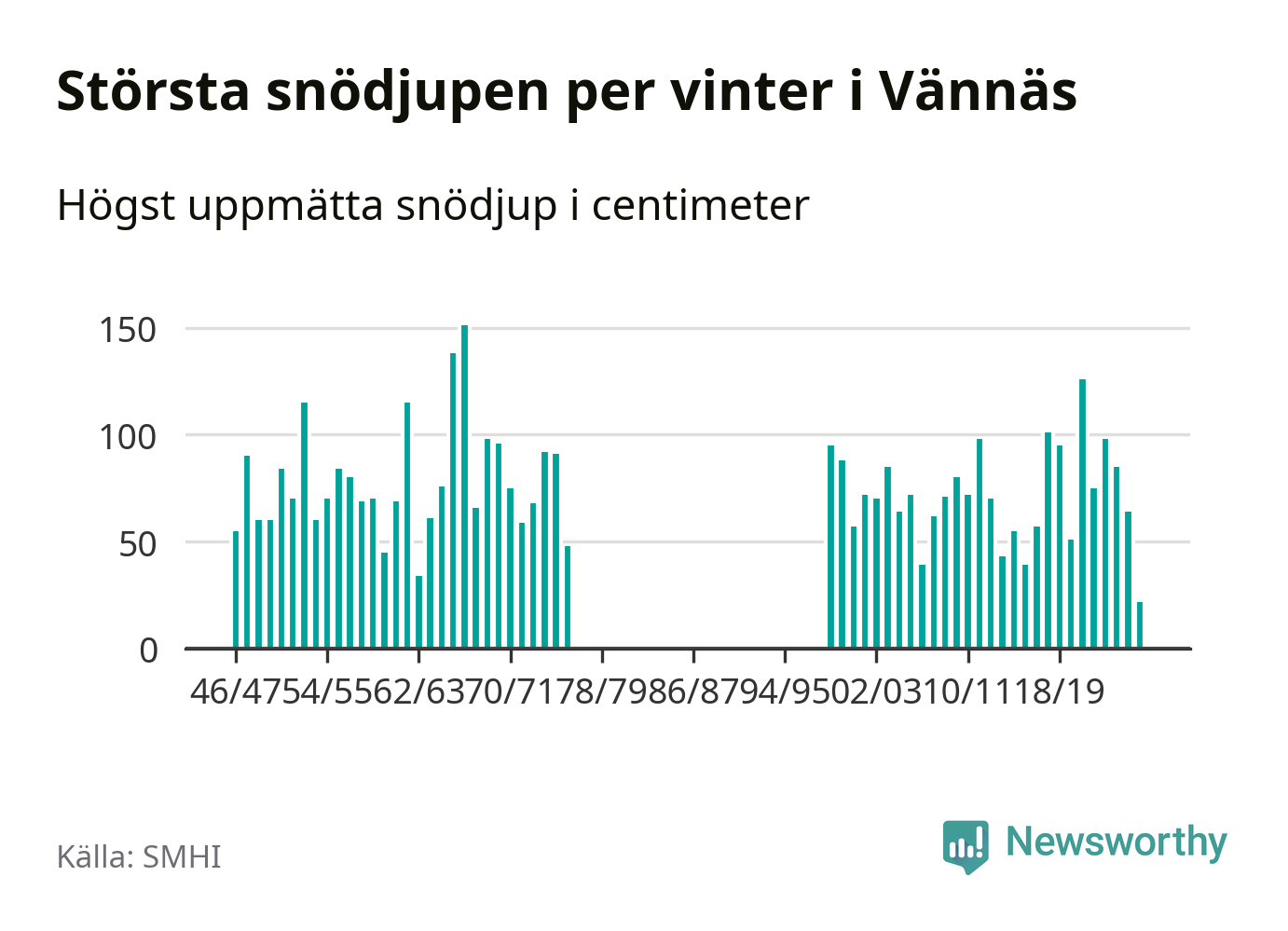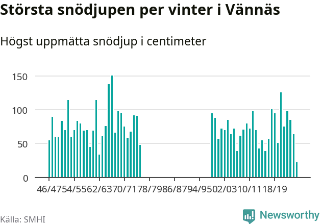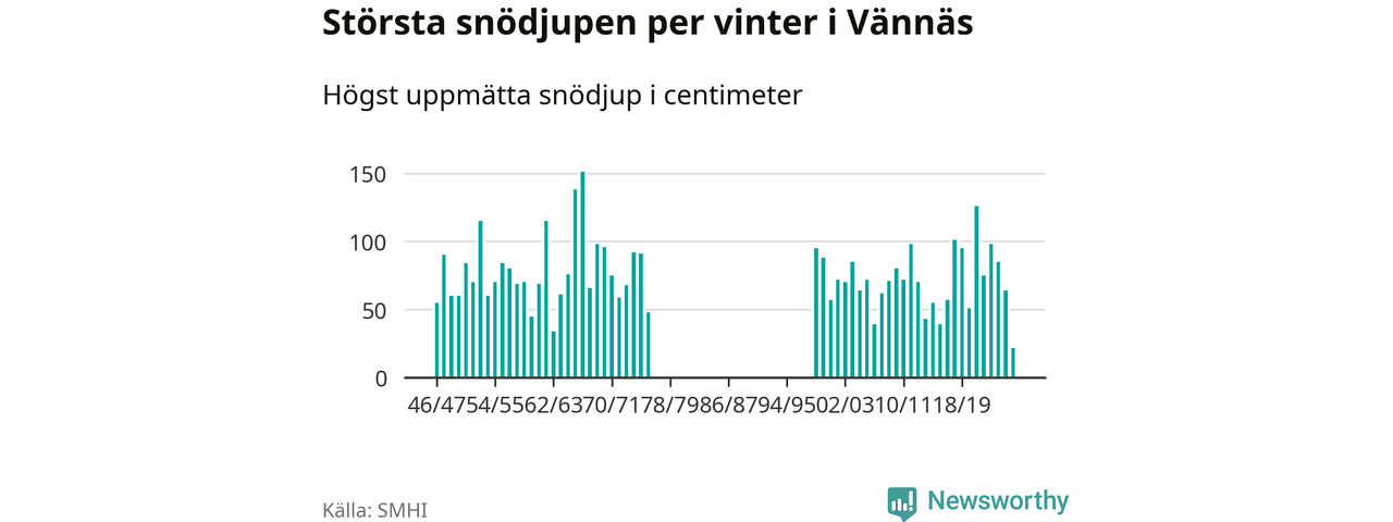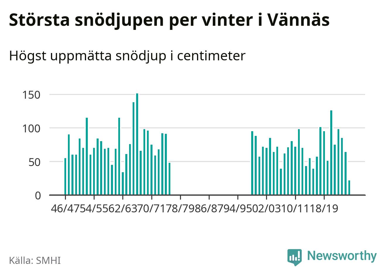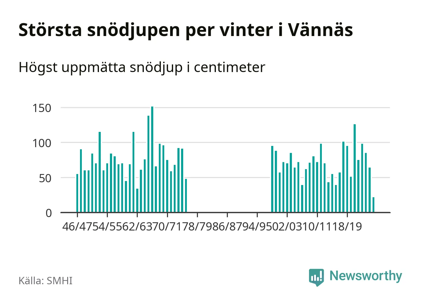 Men hur står sig det snödjupet historiskt sett? Newsworthy har tittat på det största snödjup som SMHI har uppmätt i Vännäs kommun varje år sedan vintern 1946/47 – och hittills tar sig årets vinter inte in bland de 25 vintrarna med störst uppmätt snödjup i kommunen. Det ska sägas att det inte finns några noteringar för åren 1977–1998.
