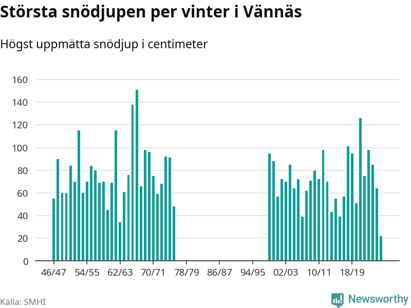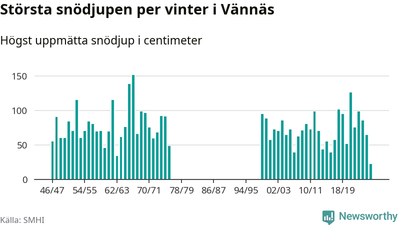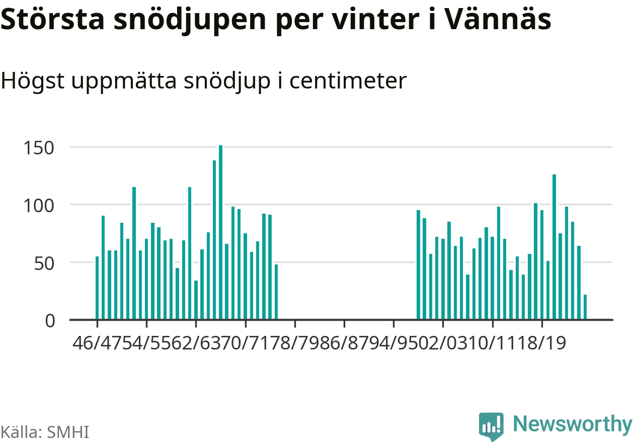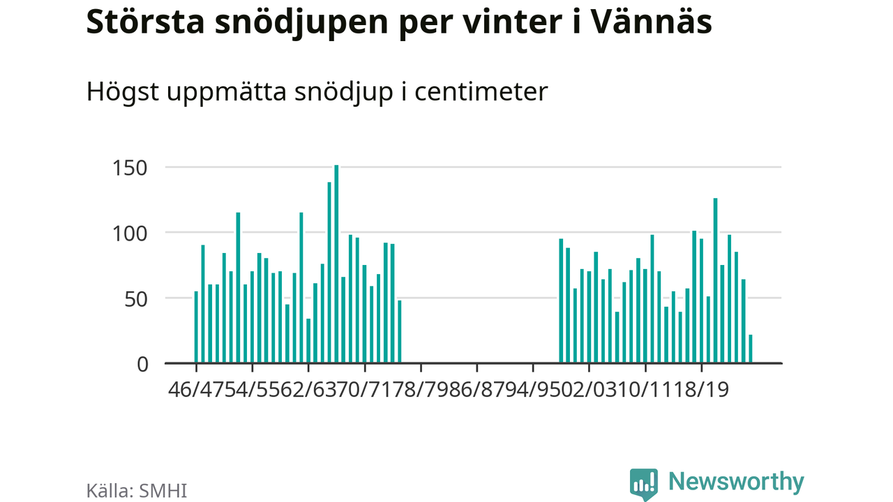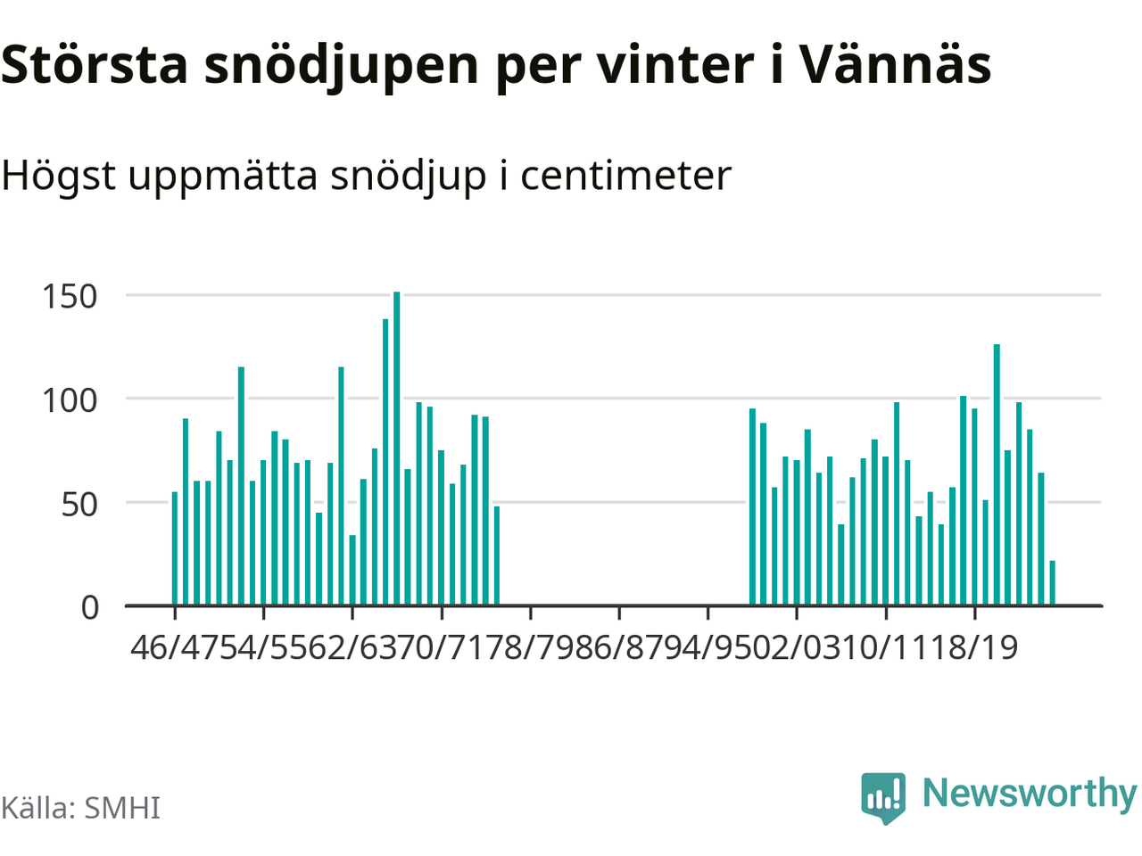 Men hur står sig det snödjupet historiskt sett? Newsworthy har tittat på det största snödjup som SMHI har uppmätt i Vännäs kommun varje år sedan vintern 1946/47 – och hittills tar sig årets vinter inte in bland de 25 vintrarna med störst uppmätt snödjup i kommunen. Det ska sägas att det inte finns några noteringar för åren 1977–1998.