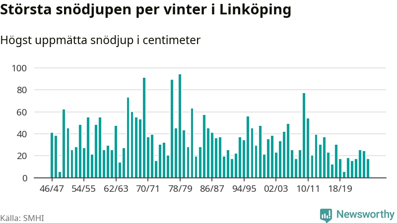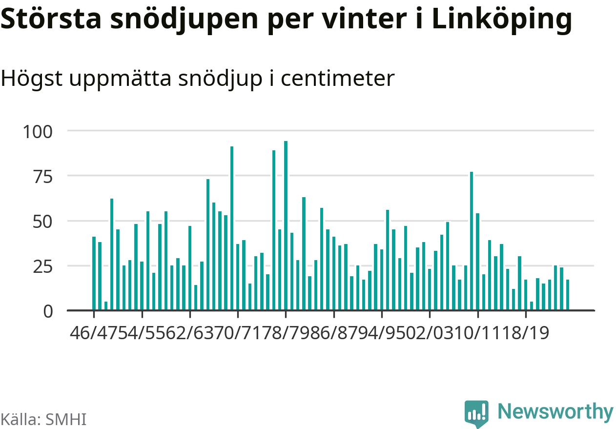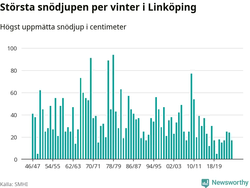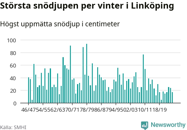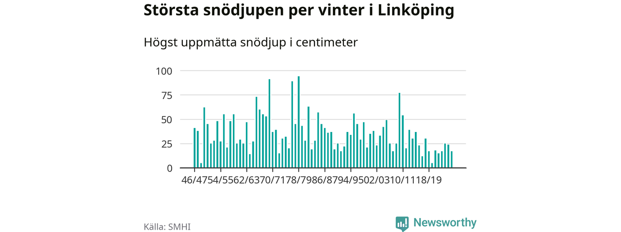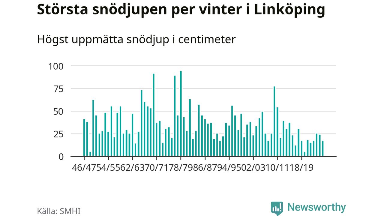 Men hur står sig det snödjupet historiskt sett? Newsworthy har tittat på det största snödjup som SMHI har uppmätt i Linköpings kommun varje år sedan vintern 1946/47 – och hittills tar sig årets vinter inte in bland de 25 vintrarna med störst uppmätt snödjup i kommunen.