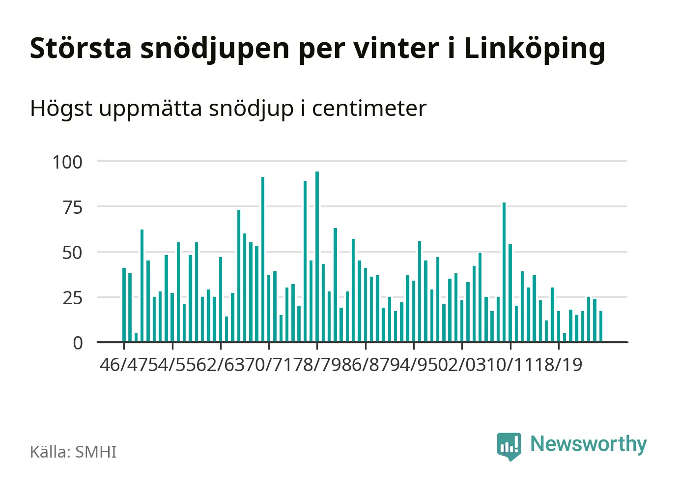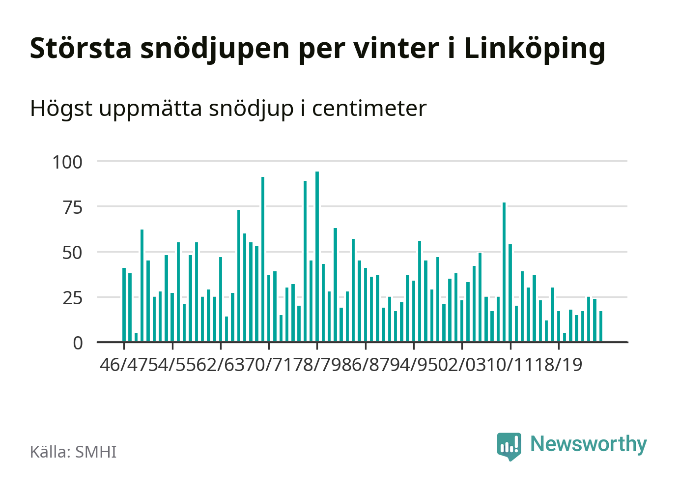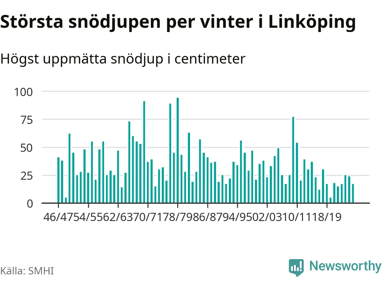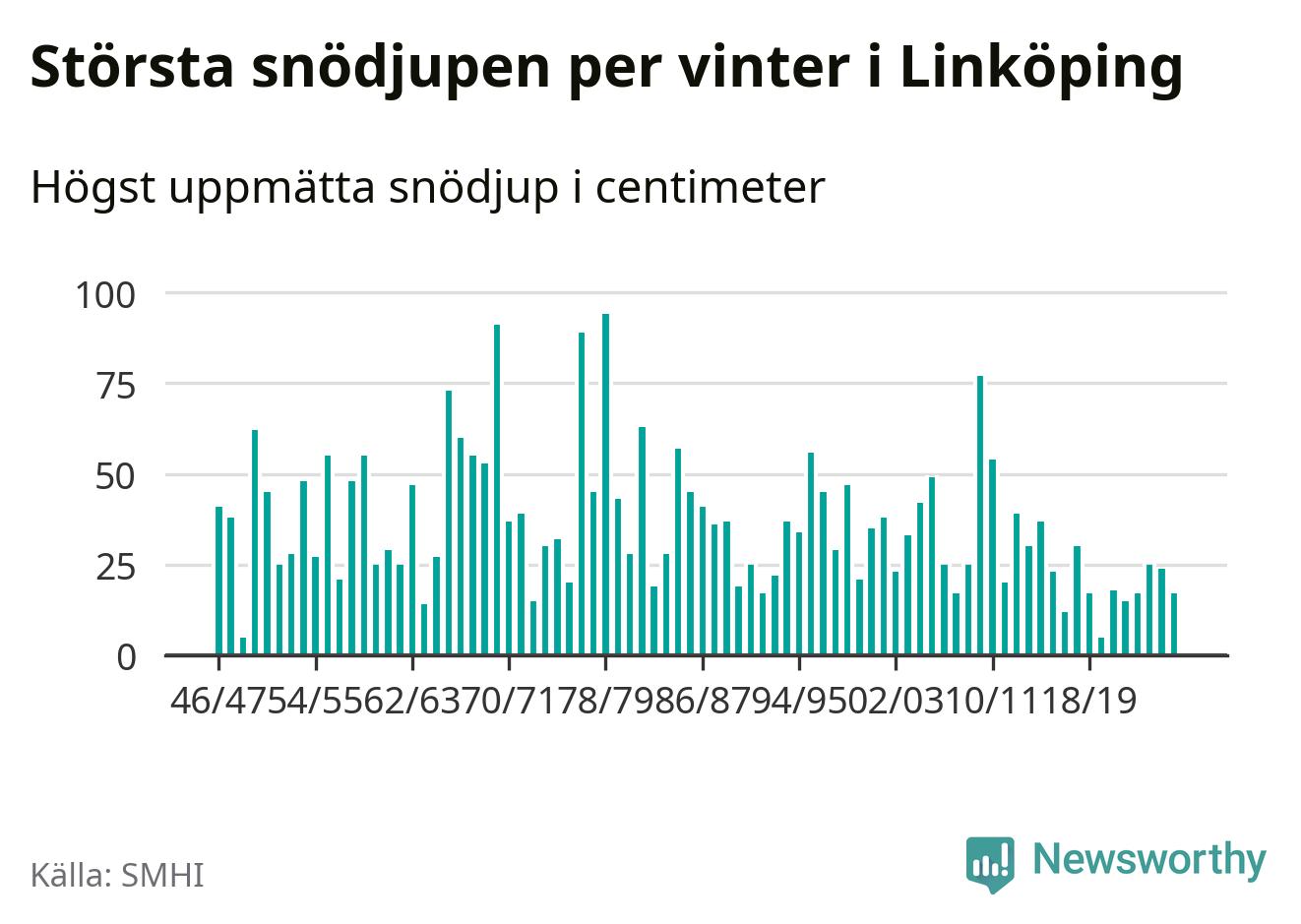 Men hur står sig det snödjupet historiskt sett? Newsworthy har tittat på det största snödjup som SMHI har uppmätt i Linköpings kommun varje år sedan vintern 1946/47 – och hittills tar sig årets vinter inte in bland de 25 vintrarna med störst uppmätt snödjup i kommunen.