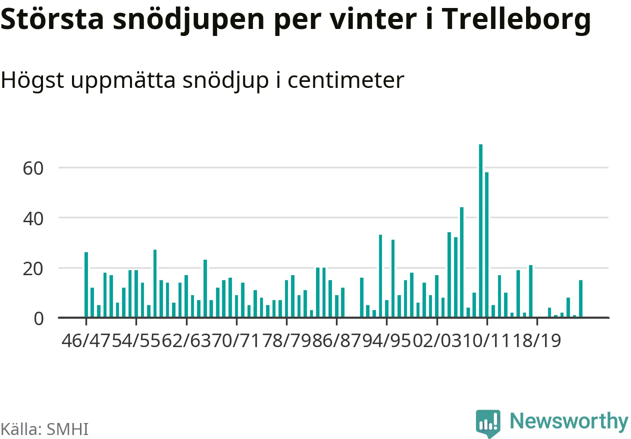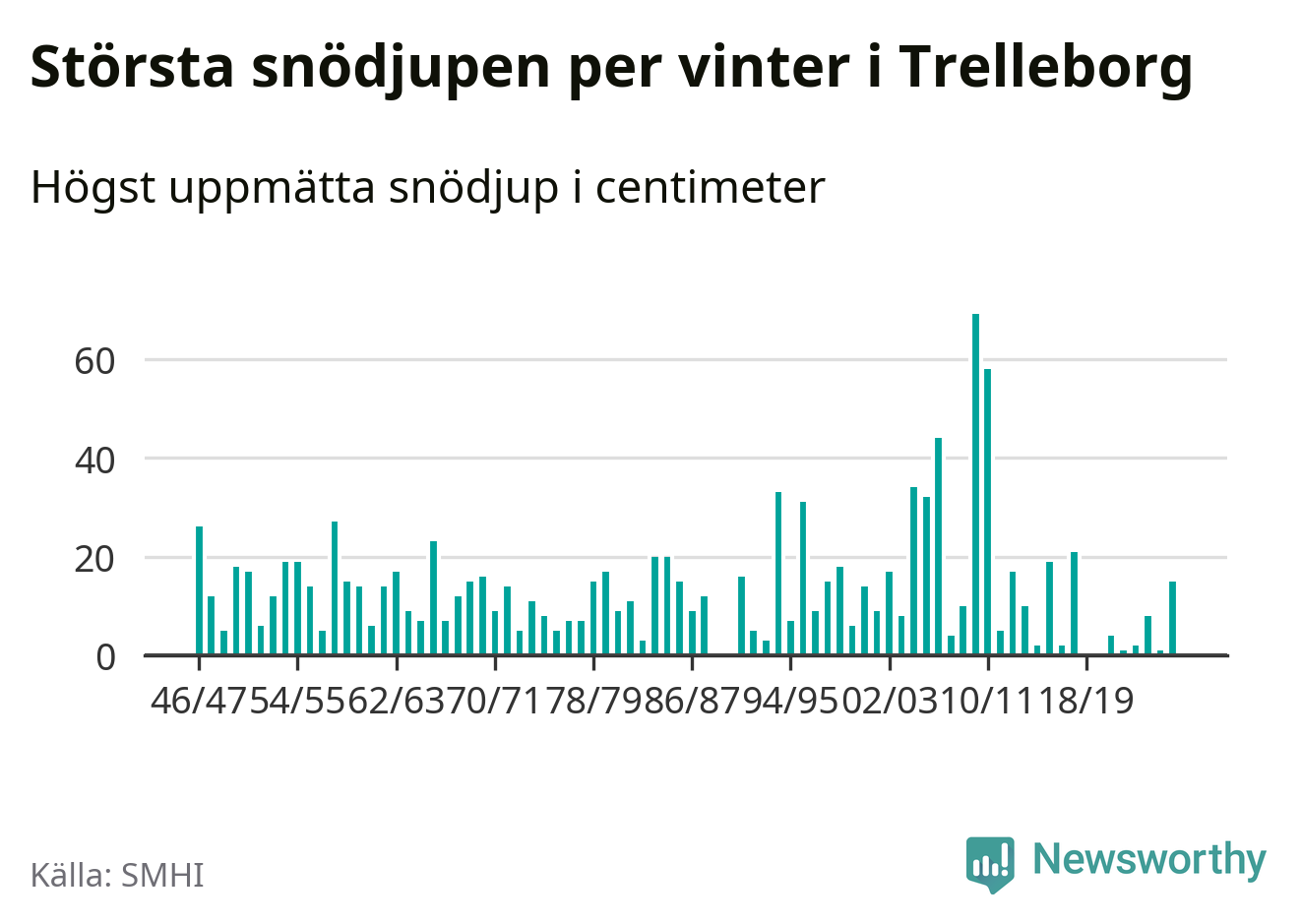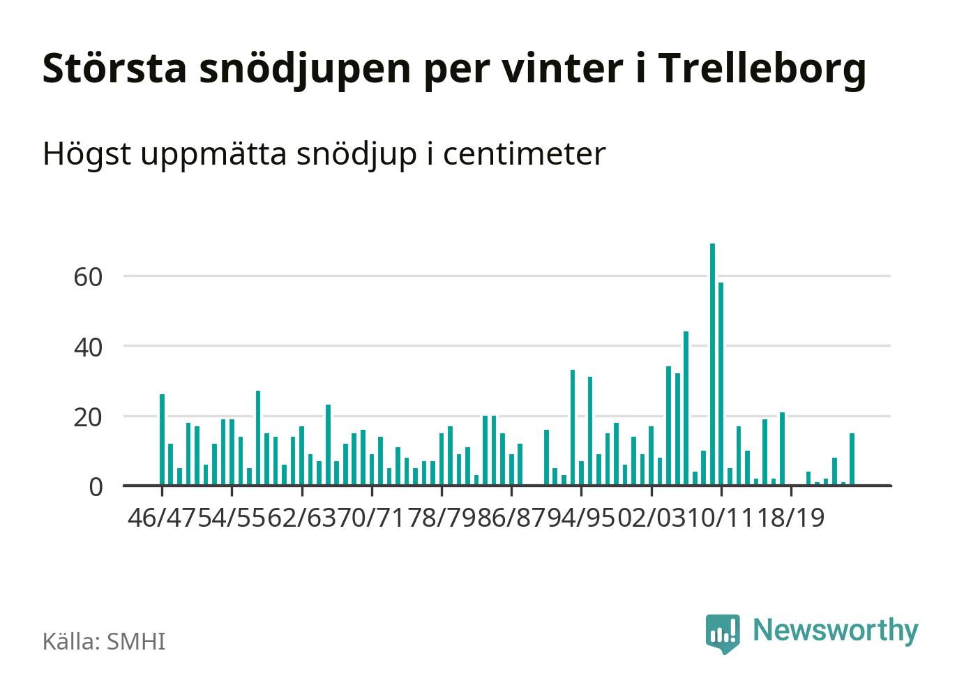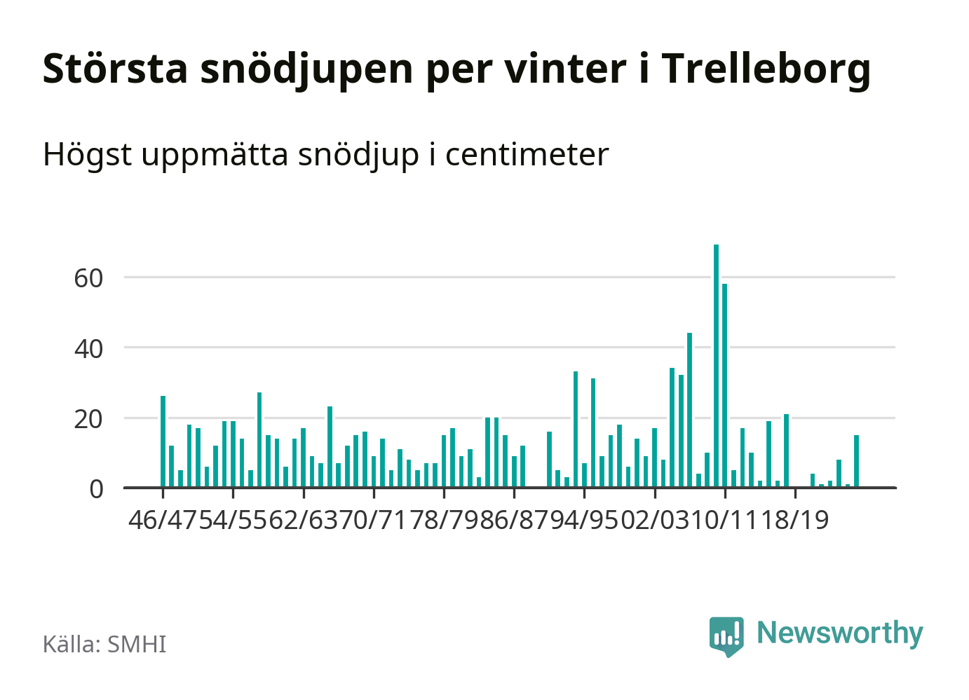 Men hur står sig det snödjupet historiskt sett? Newsworthy har tittat på det största snödjup som SMHI har uppmätt i Trelleborgs kommun varje år sedan vintern 1946/47 – och hittills tar sig årets vinter inte in bland de 25 vintrarna med störst uppmätt snödjup i kommunen. Det ska sägas att det inte finns några noteringar för åren 1989 och 1990.