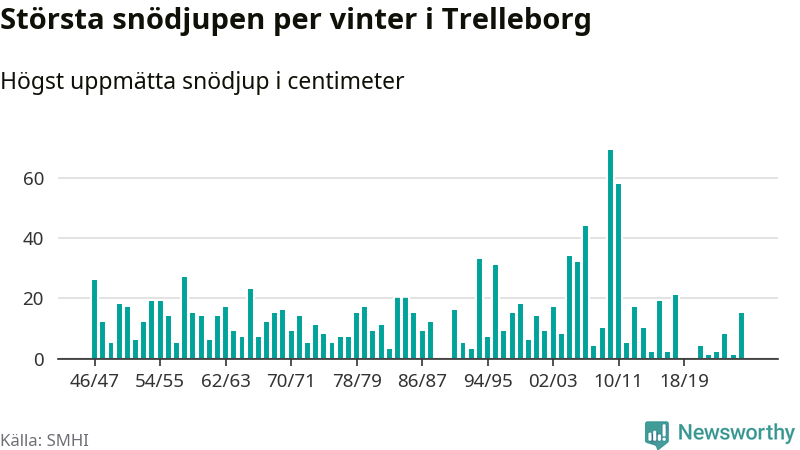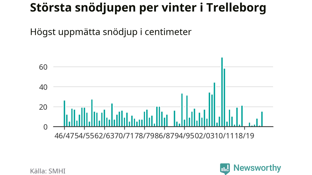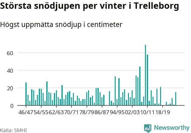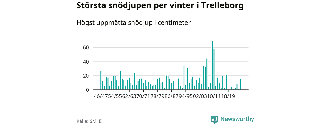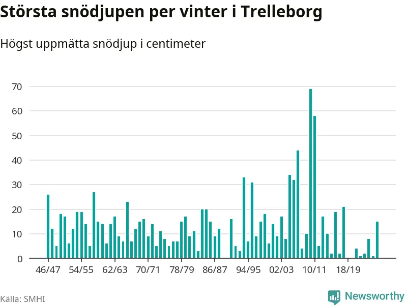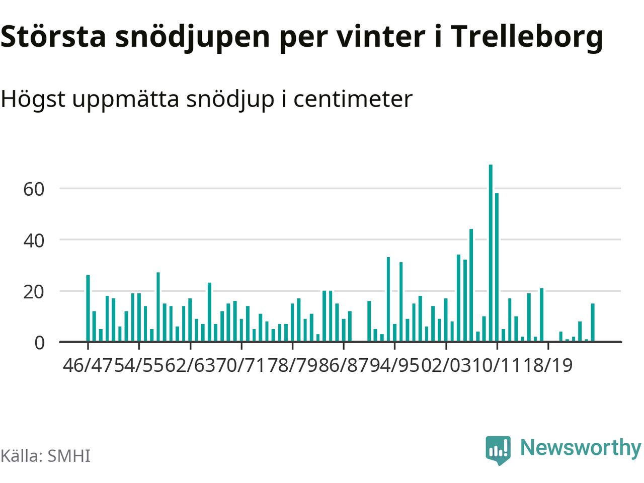 Men hur står sig det snödjupet historiskt sett? Newsworthy har tittat på det största snödjup som SMHI har uppmätt i Trelleborgs kommun varje år sedan vintern 1946/47 – och hittills tar sig årets vinter inte in bland de 25 vintrarna med störst uppmätt snödjup i kommunen. Det ska sägas att det inte finns några noteringar för åren 1989 och 1990.