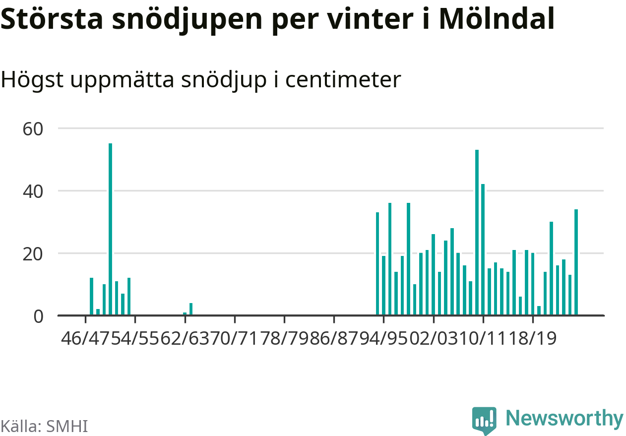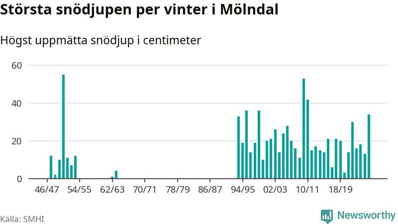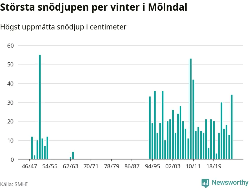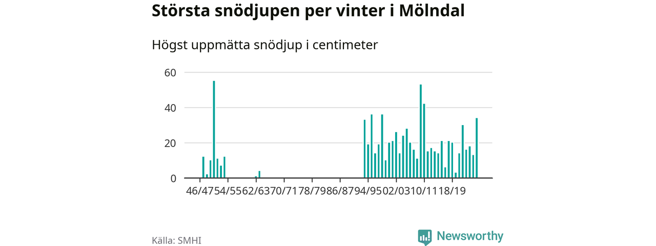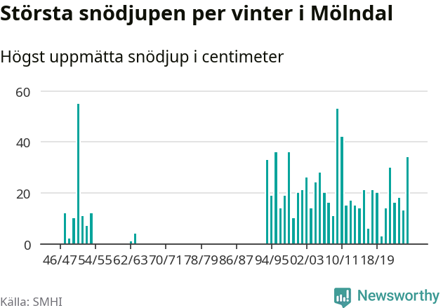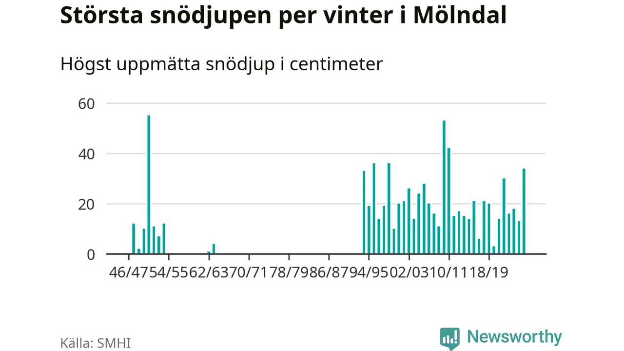Men hur står sig det snödjupet historiskt sett? Newsworthy har tittat på det största snödjup som SMHI har uppmätt i Mölndals kommun varje år sedan vintern 1946/47. Fem vintrar har det uppmätts större snödjup. Det ska sägas att det inte finns några noteringar för åren 1955–1962 och 1965–1993.