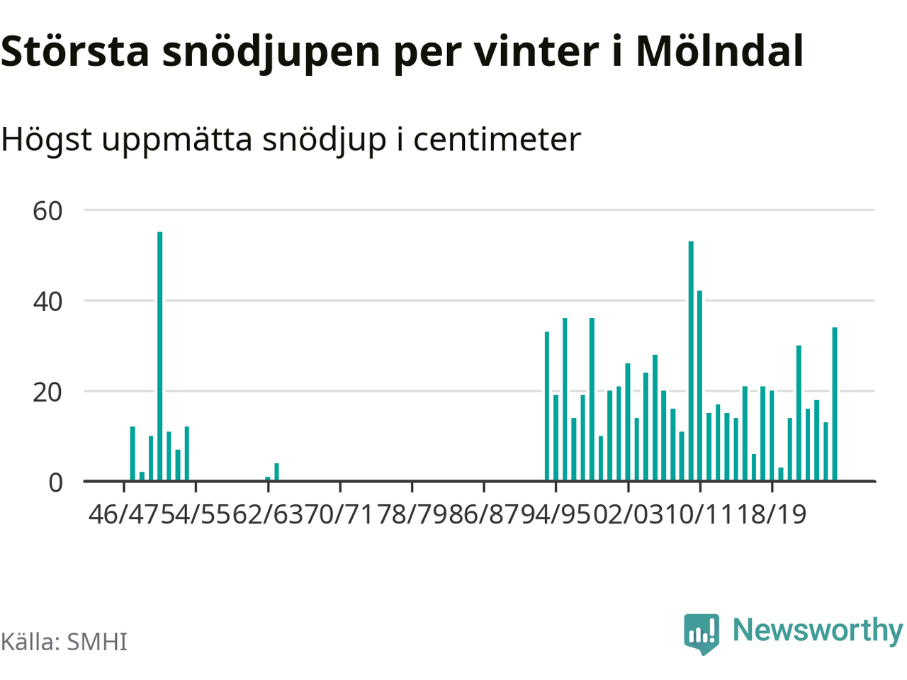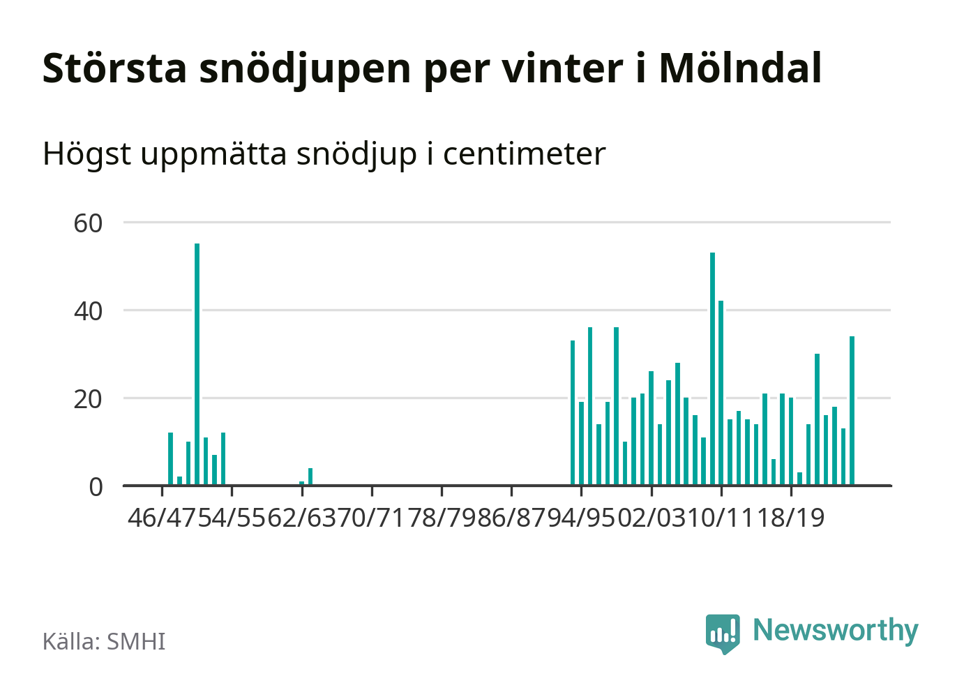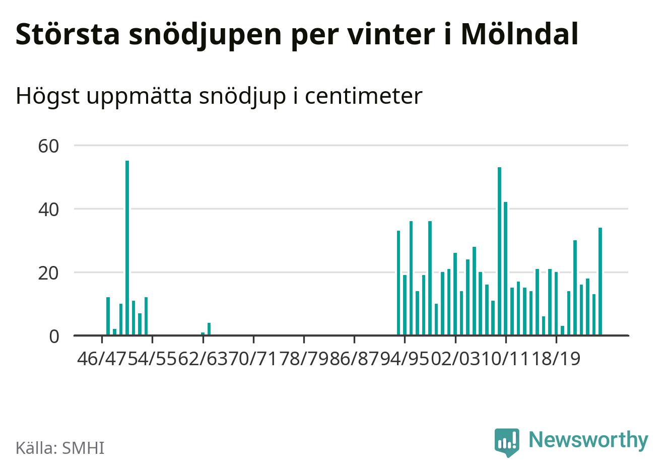 Men hur står sig det snödjupet historiskt sett? Newsworthy har tittat på det största snödjup som SMHI har uppmätt i Mölndals kommun varje år sedan vintern 1946/47. Fem vintrar har det uppmätts större snödjup. Det ska sägas att det inte finns några noteringar för åren 1955–1962 och 1965–1993.