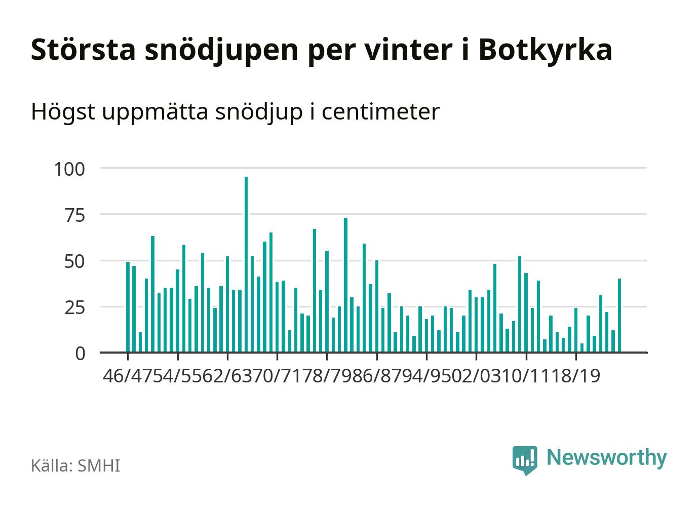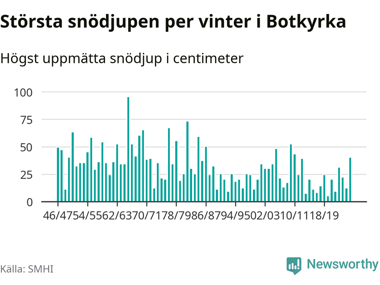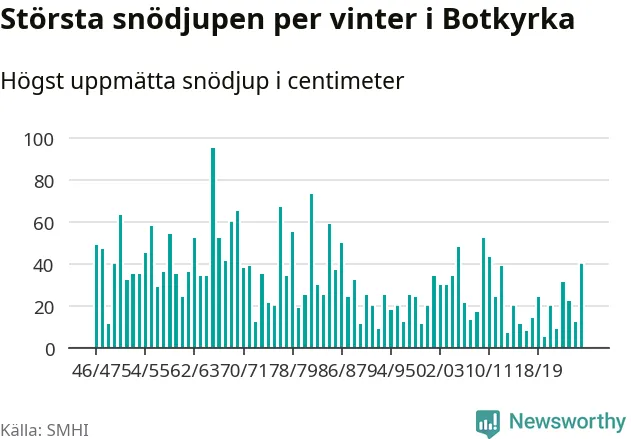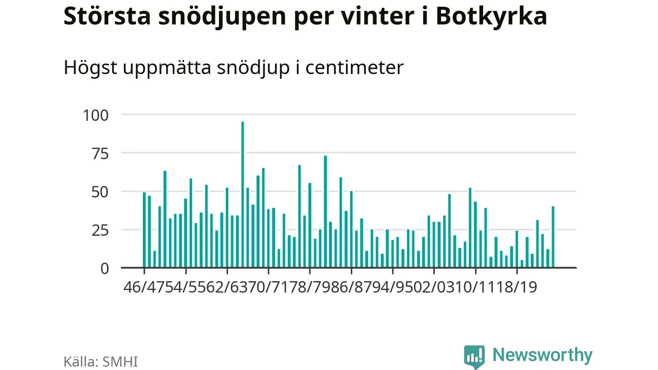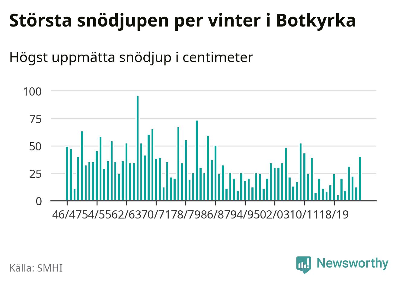 Men hur står sig det snödjupet historiskt sett? Newsworthy har tittat på det största snödjup som SMHI har uppmätt i Botkyrka kommun varje år sedan vintern 1946/47. 20 vintrar har det uppmätts större snödjup.