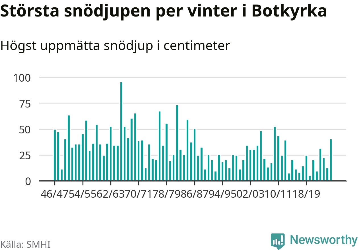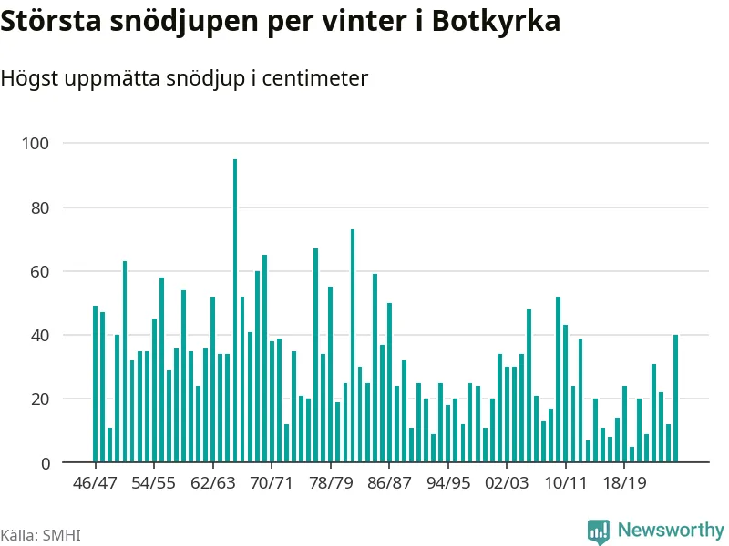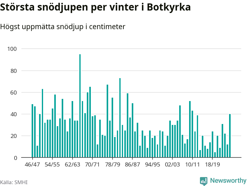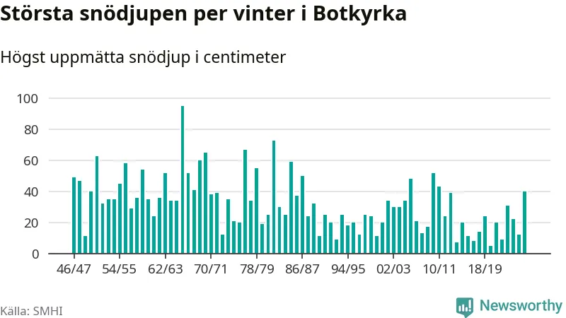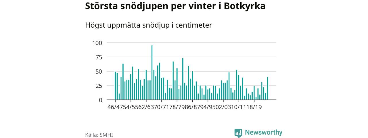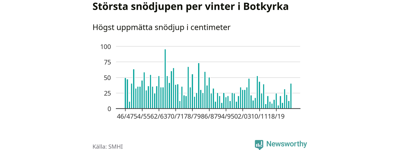 Men hur står sig det snödjupet historiskt sett? Newsworthy har tittat på det största snödjup som SMHI har uppmätt i Botkyrka kommun varje år sedan vintern 1946/47. 20 vintrar har det uppmätts större snödjup.
