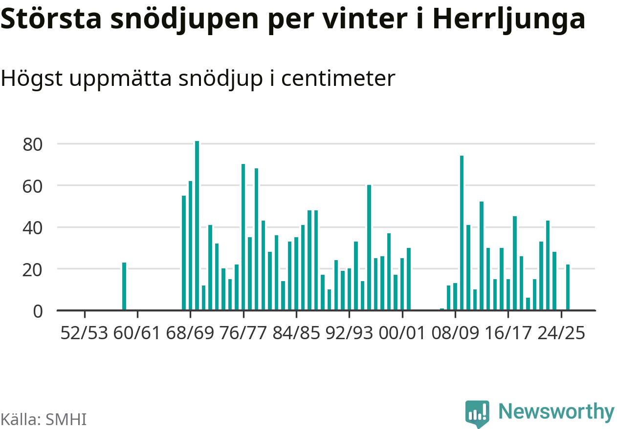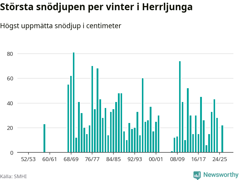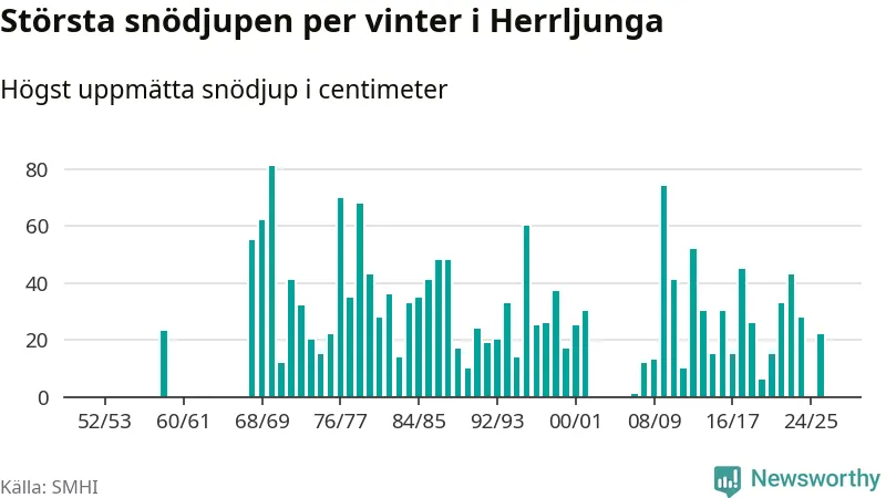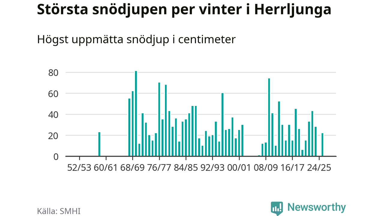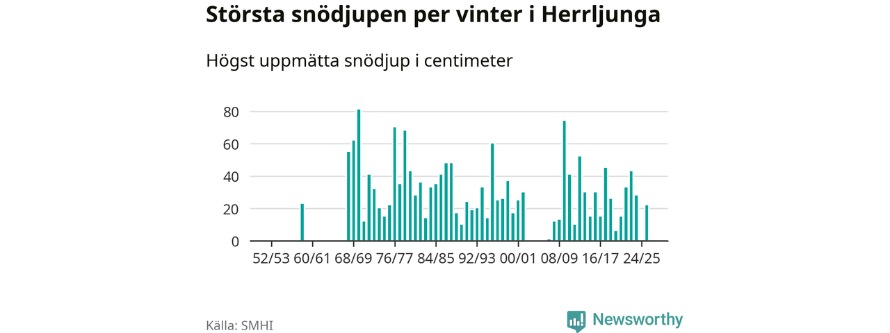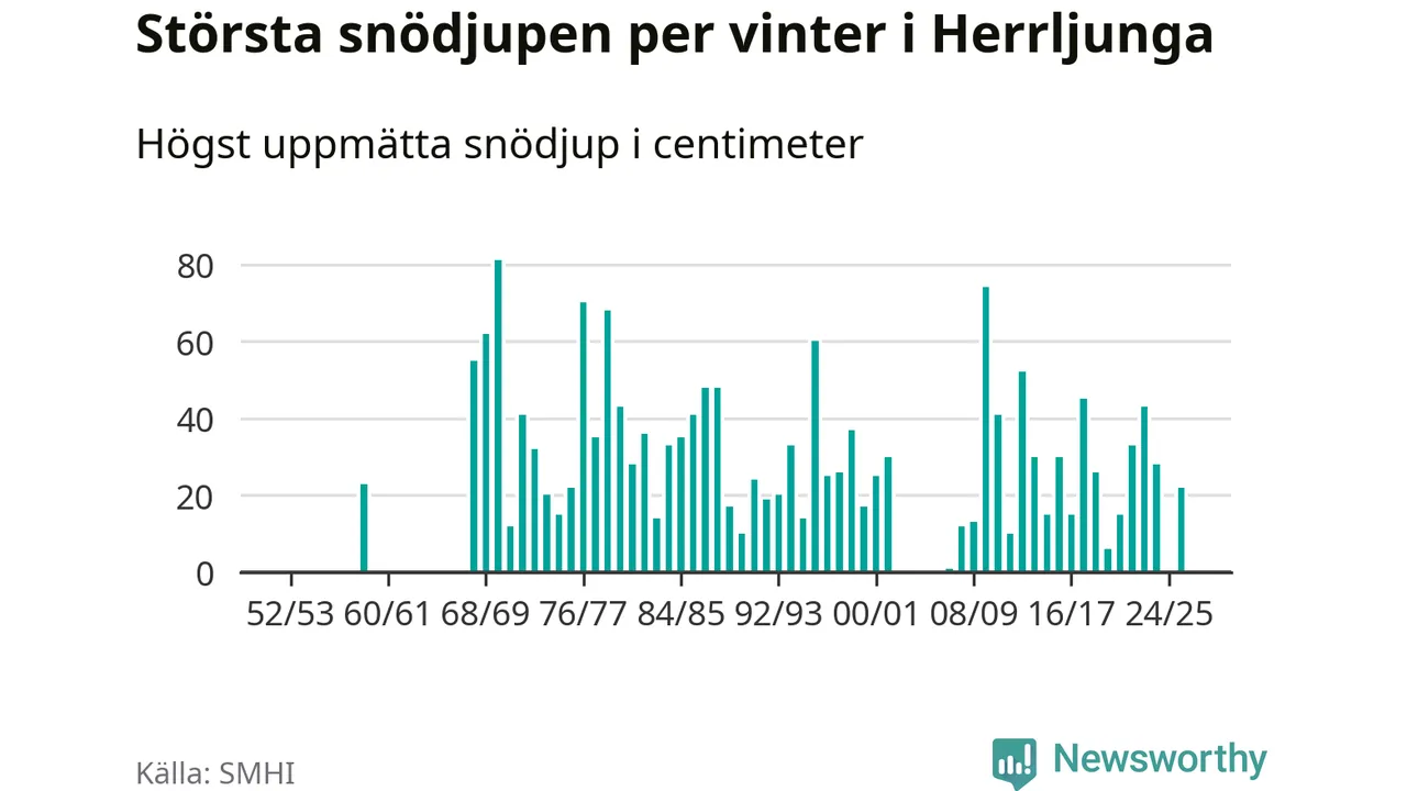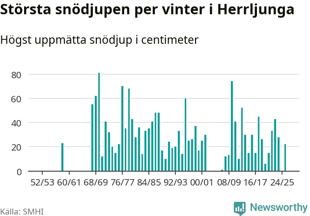 Men hur står sig det snödjupet historiskt sett? Newsworthy har tittat på det största snödjup som SMHI har uppmätt i Herrljunga kommun varje år sedan vintern 1952/53 – och hittills tar sig årets vinter inte in bland de 25 vintrarna med störst uppmätt snödjup i kommunen. Det ska sägas att det inte finns några noteringar för åren 1960–1967 och 2003–2006.