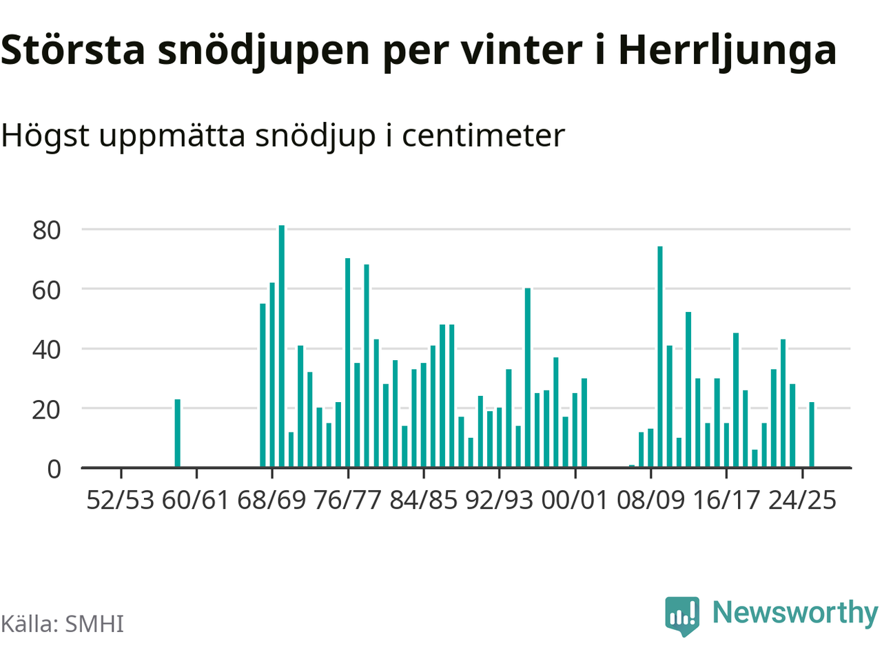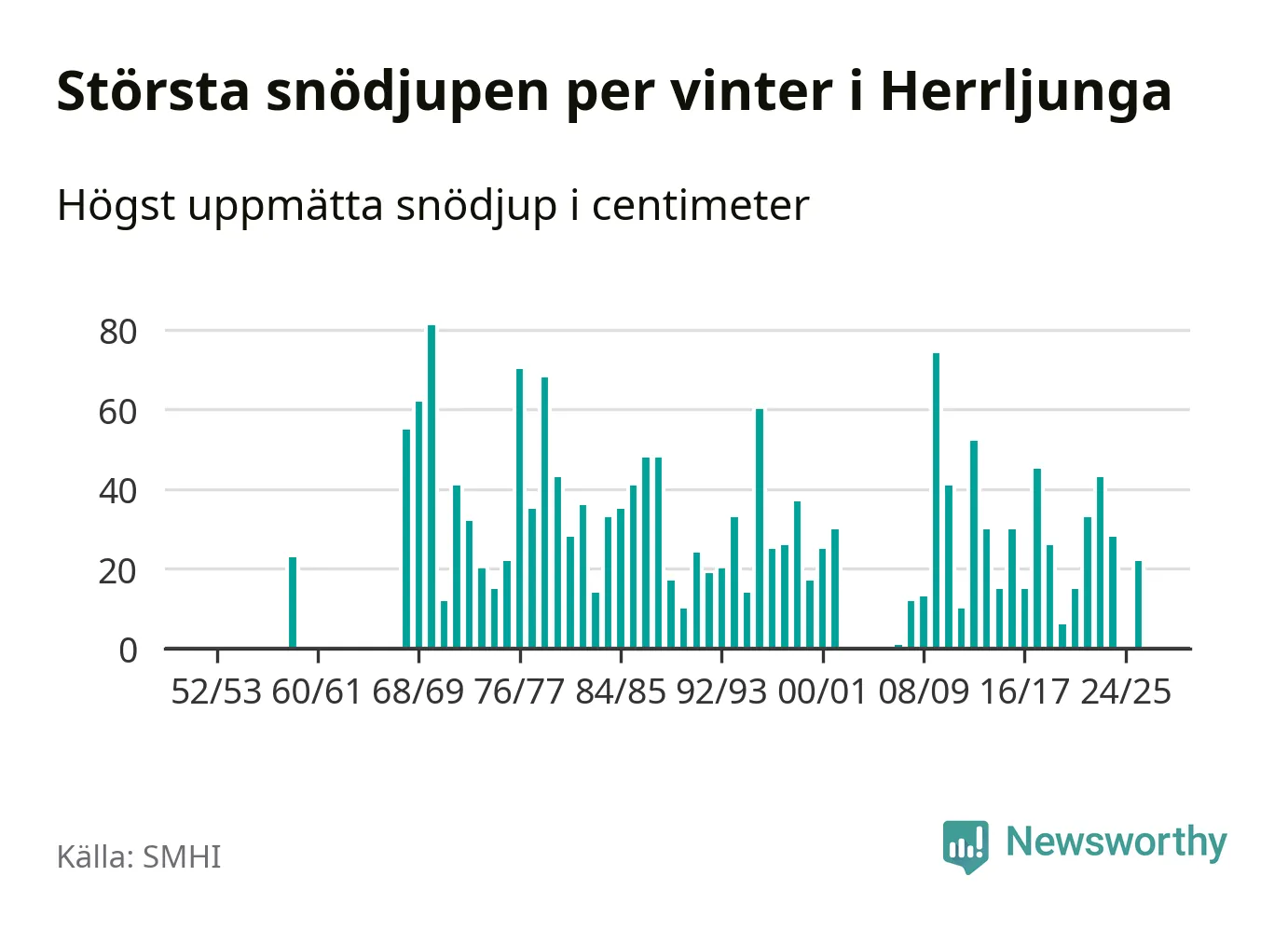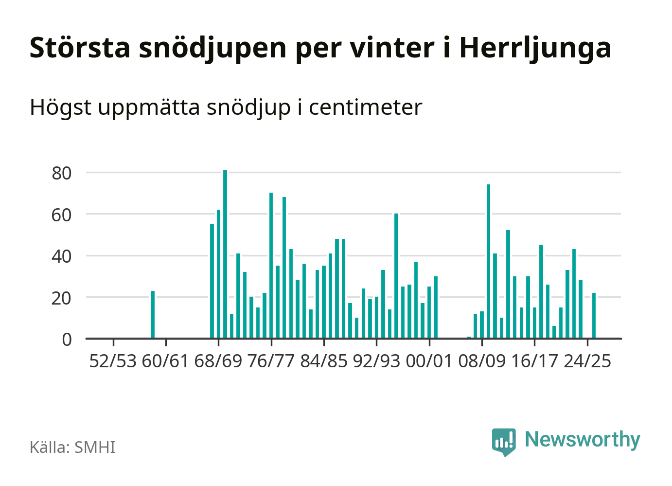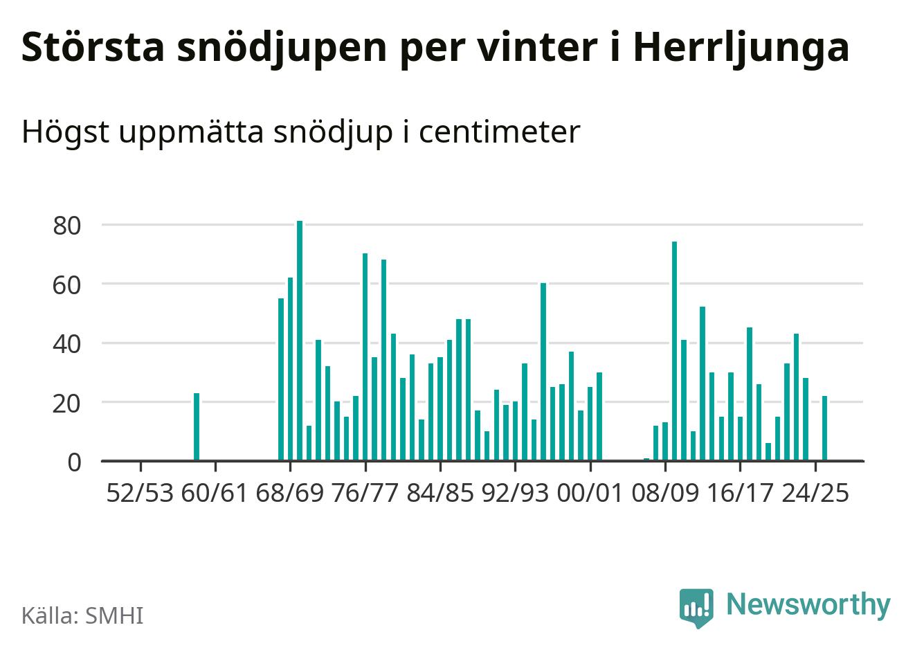 Men hur står sig det snödjupet historiskt sett? Newsworthy har tittat på det största snödjup som SMHI har uppmätt i Herrljunga kommun varje år sedan vintern 1952/53 – och hittills tar sig årets vinter inte in bland de 25 vintrarna med störst uppmätt snödjup i kommunen. Det ska sägas att det inte finns några noteringar för åren 1960–1967 och 2003–2006.