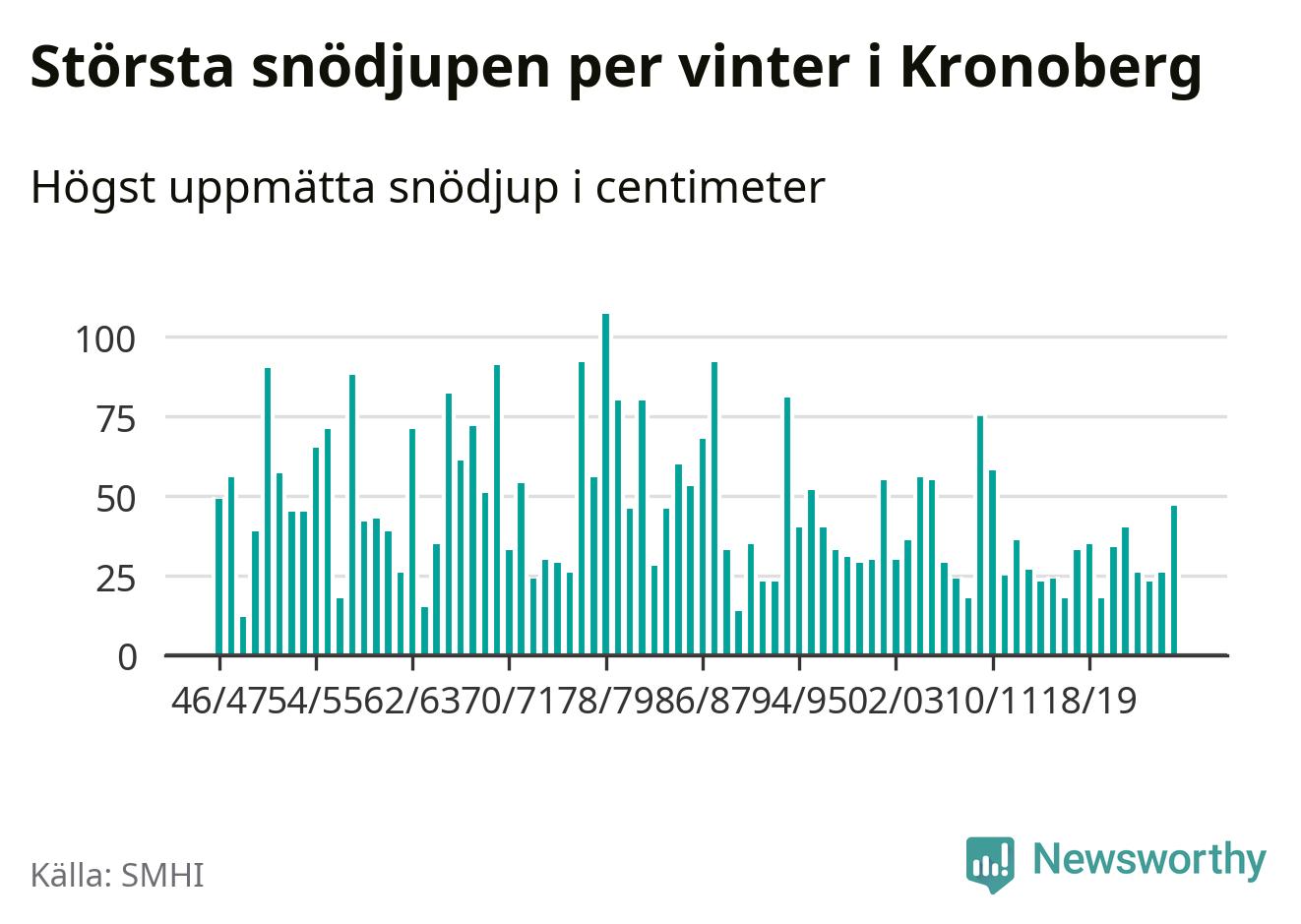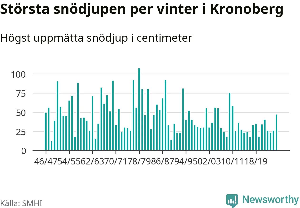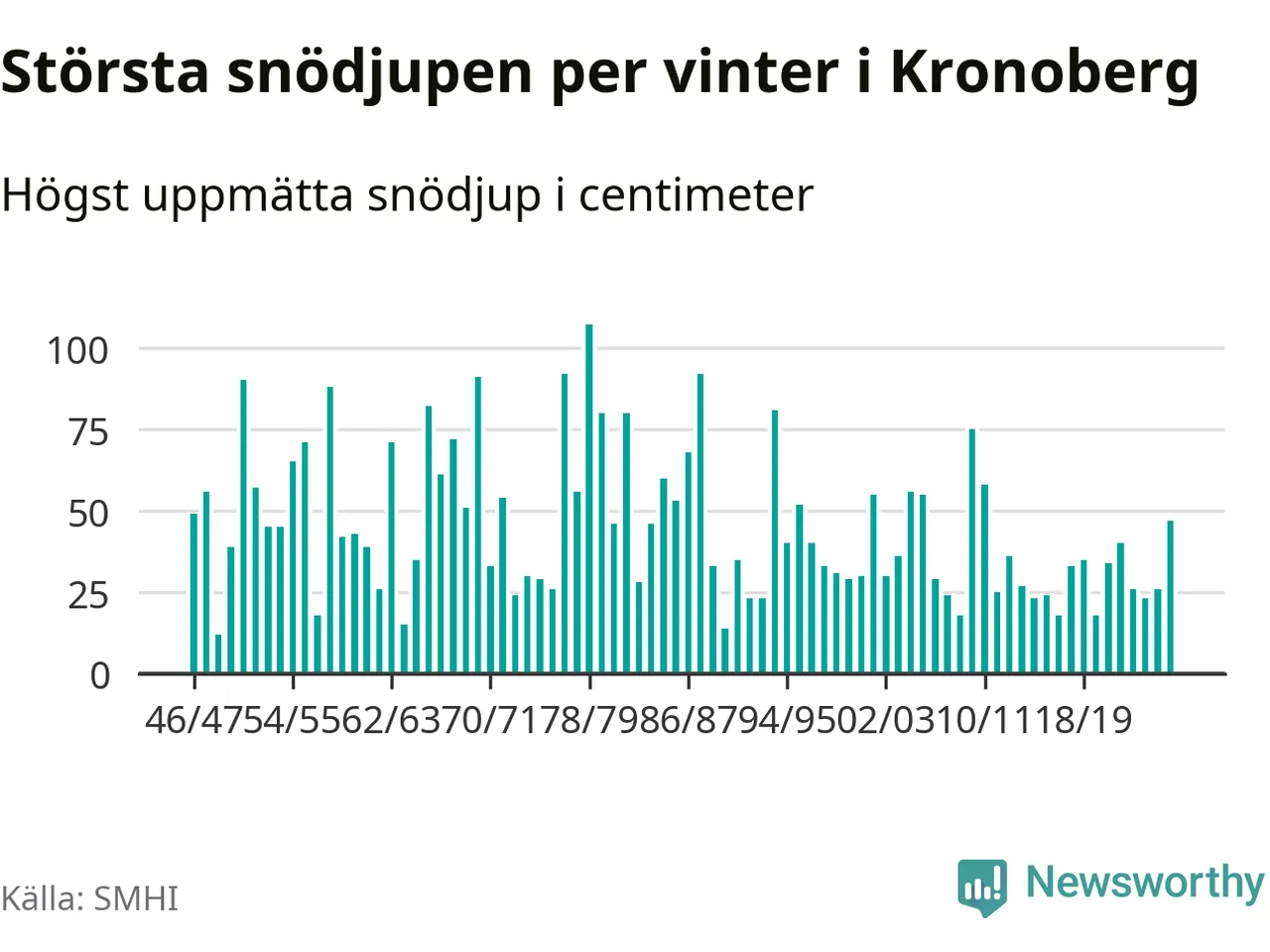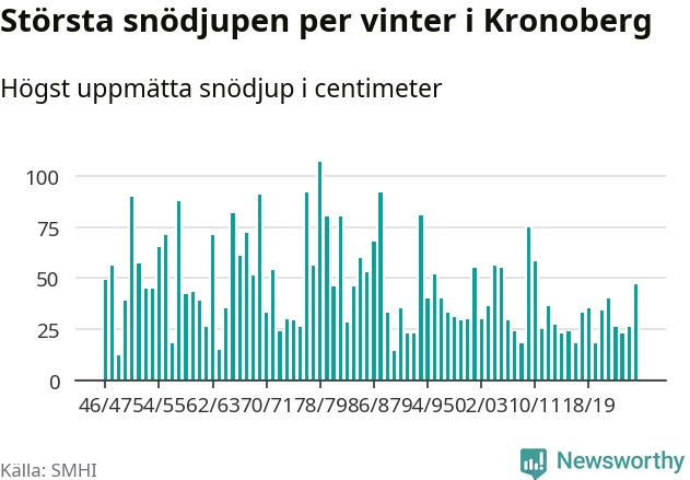 Men hur står sig det snödjupet historiskt sett? Newsworthy har tittat på det största snödjup som SMHI har uppmätt i Kronobergs län varje år sedan vintern 1946/47 – och hittills tar sig årets vinter inte in bland de 25 vintrarna med störst uppmätt snödjup i länet.