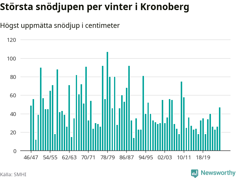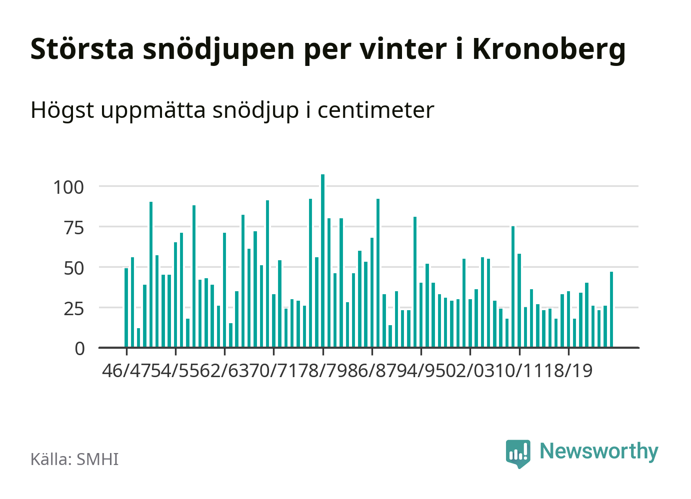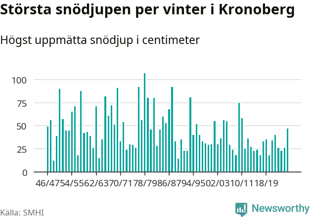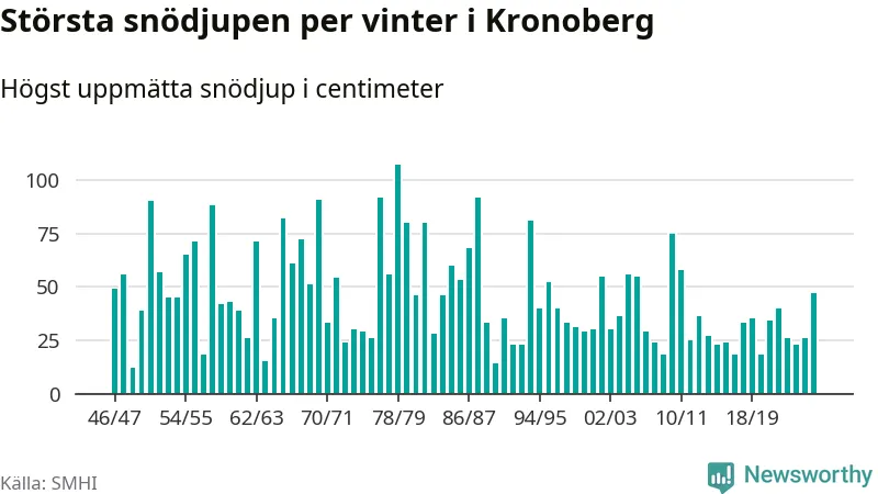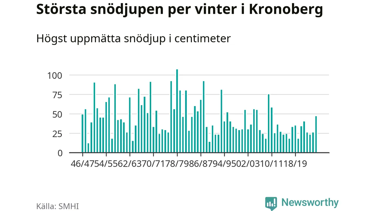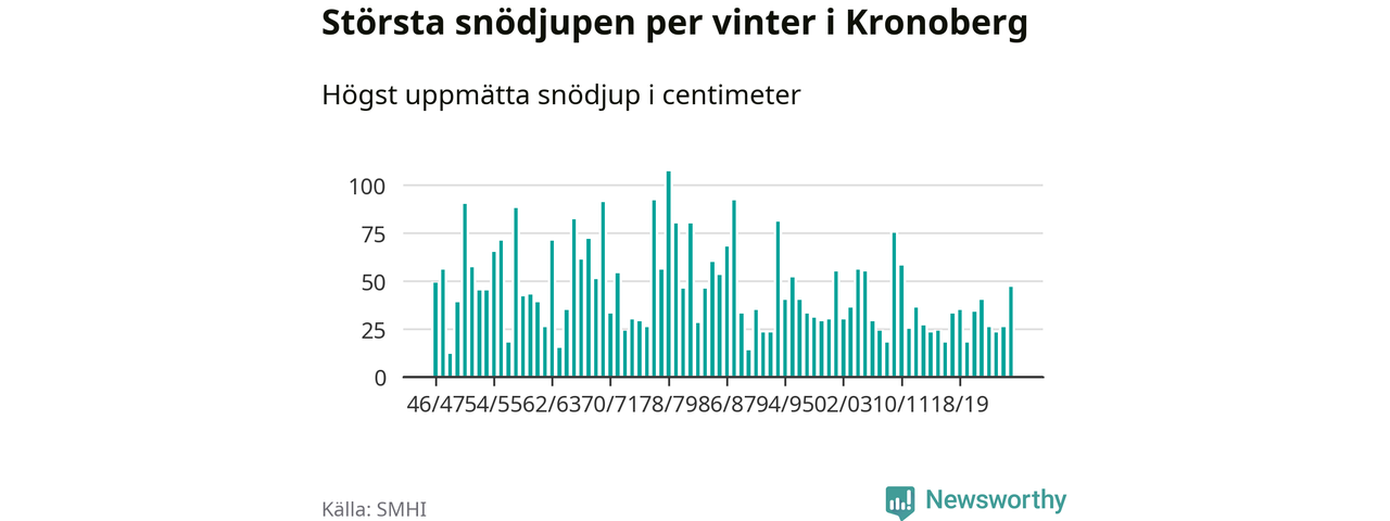 Men hur står sig det snödjupet historiskt sett? Newsworthy har tittat på det största snödjup som SMHI har uppmätt i Kronobergs län varje år sedan vintern 1946/47 – och hittills tar sig årets vinter inte in bland de 25 vintrarna med störst uppmätt snödjup i länet.