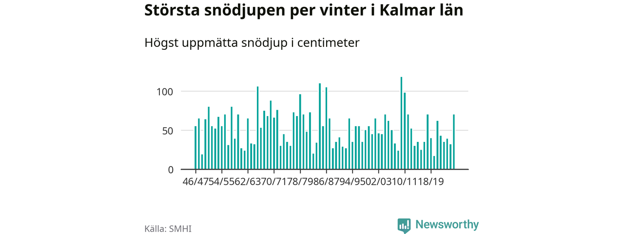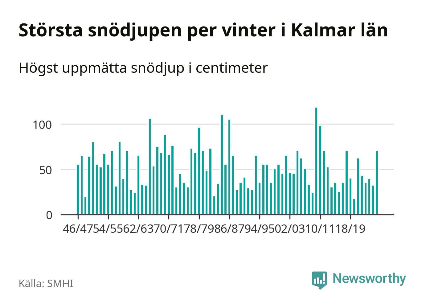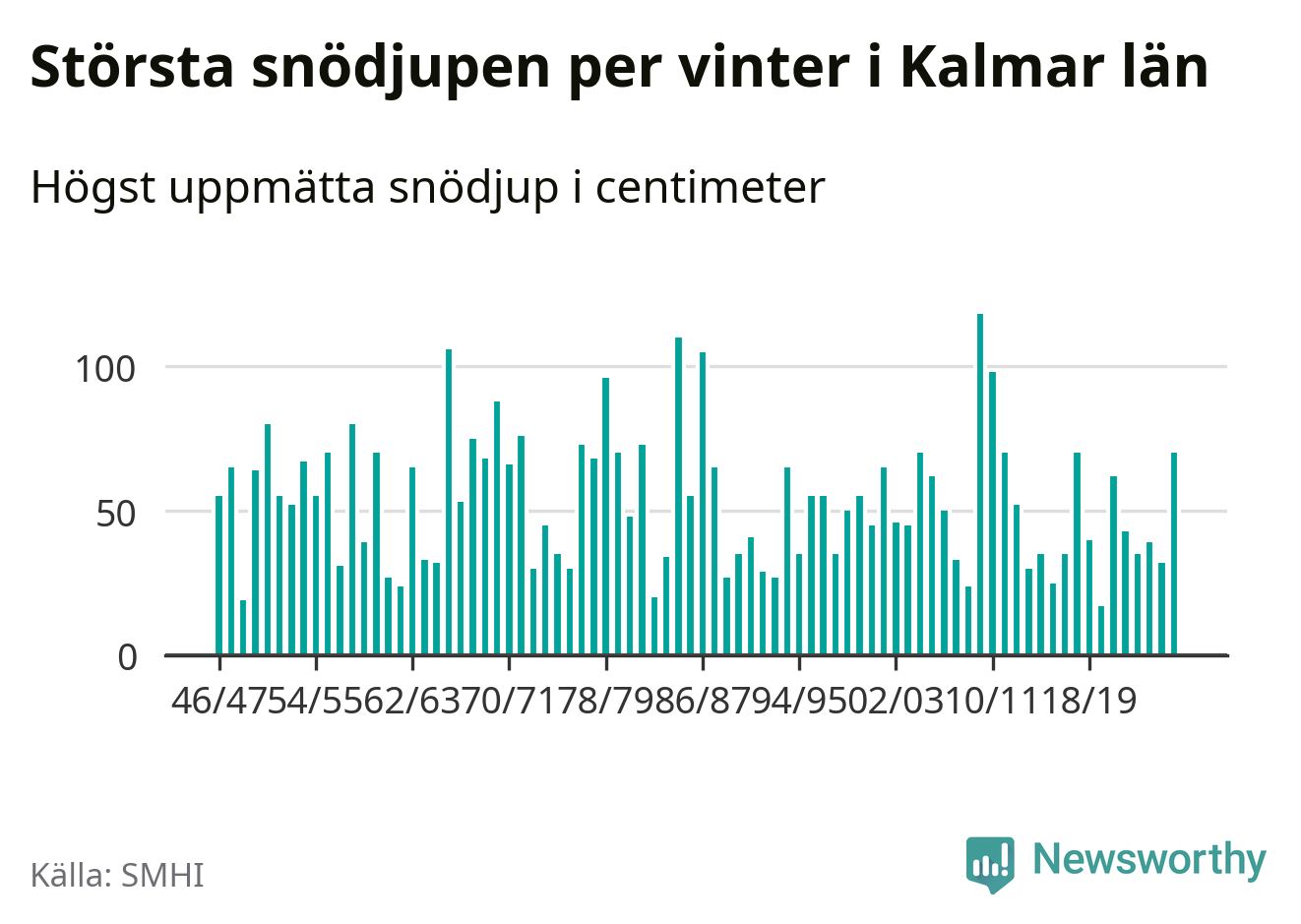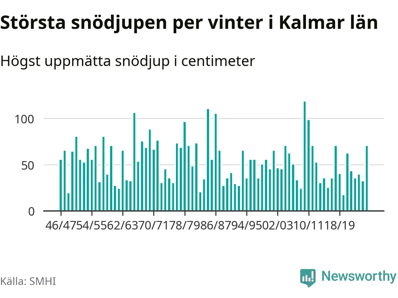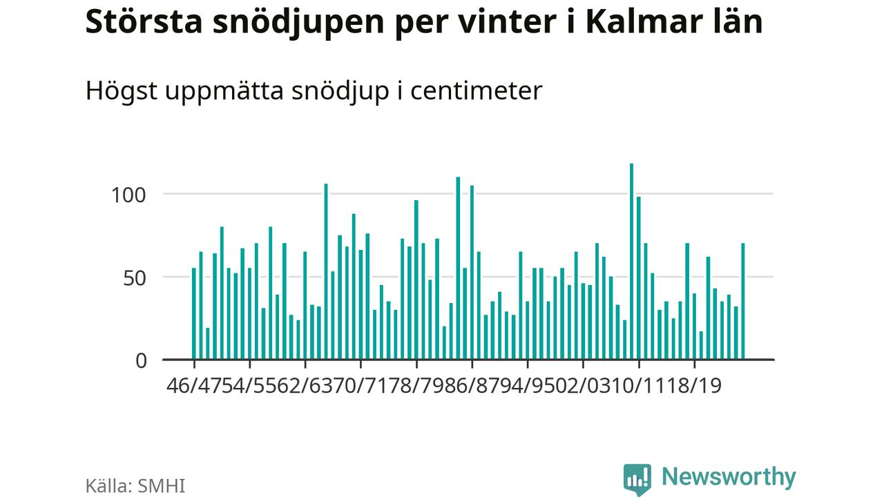 Men hur står sig det snödjupet historiskt sett? Newsworthy har tittat på det största snödjup som SMHI har uppmätt i Kalmar län varje år sedan vintern 1946/47. 13 vintrar har det uppmätts större snödjup.
