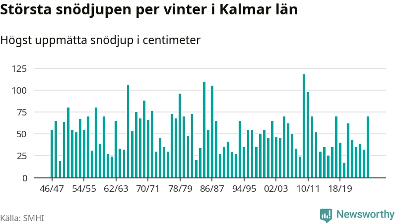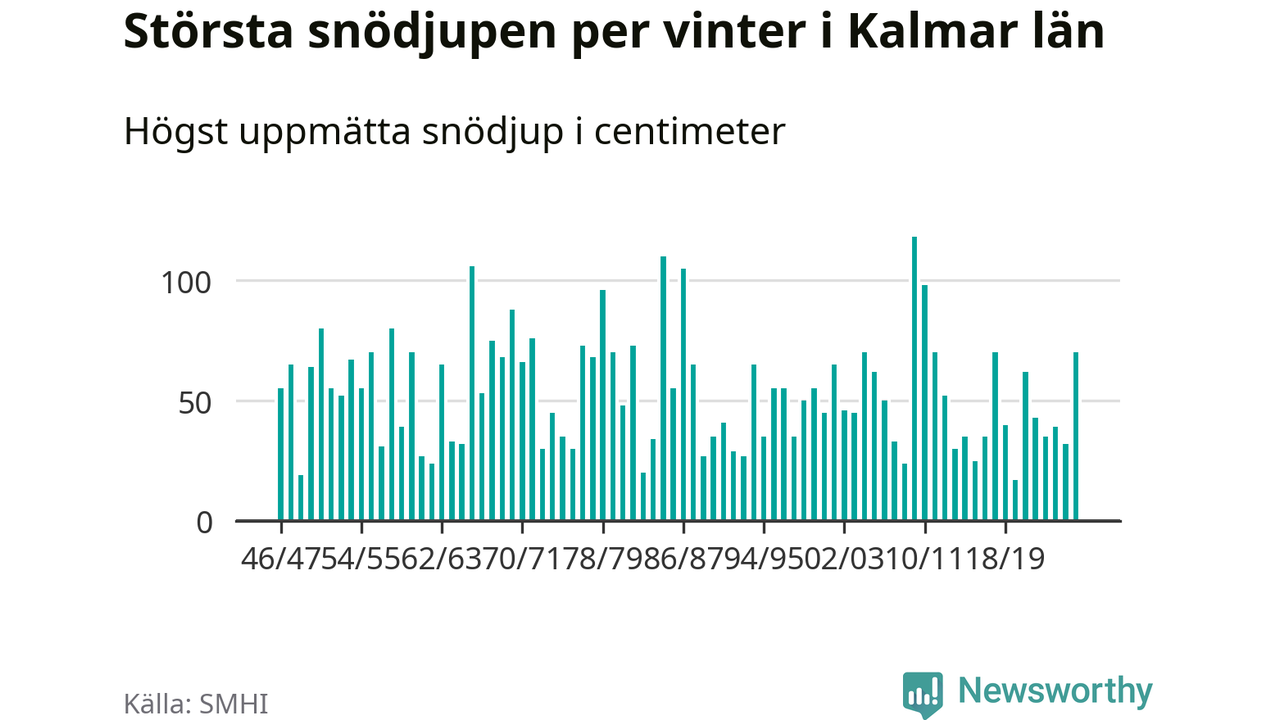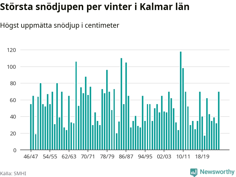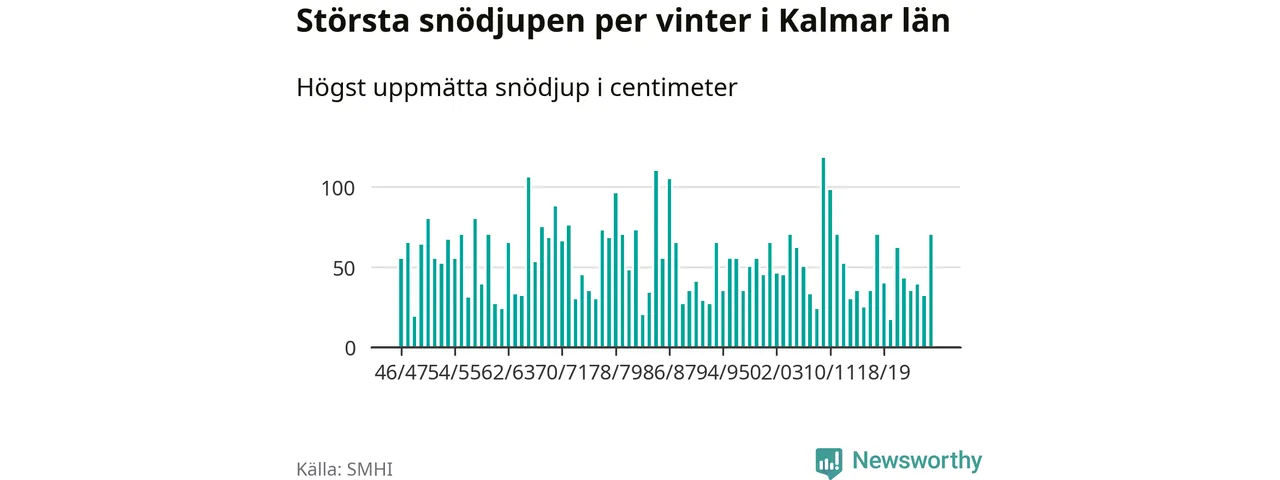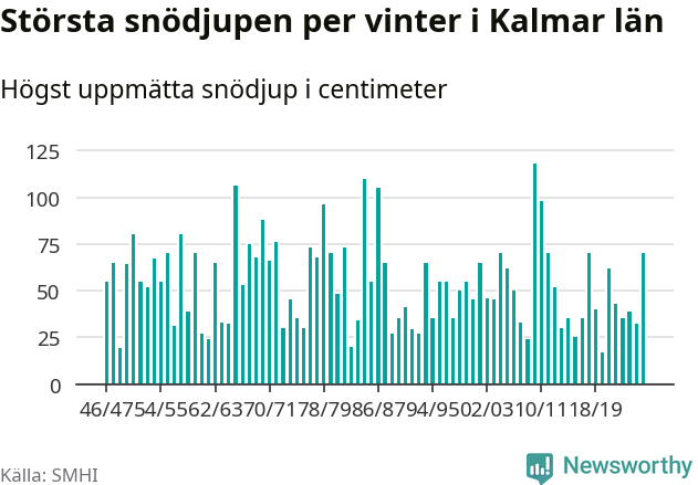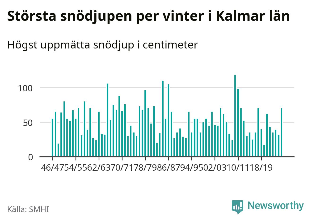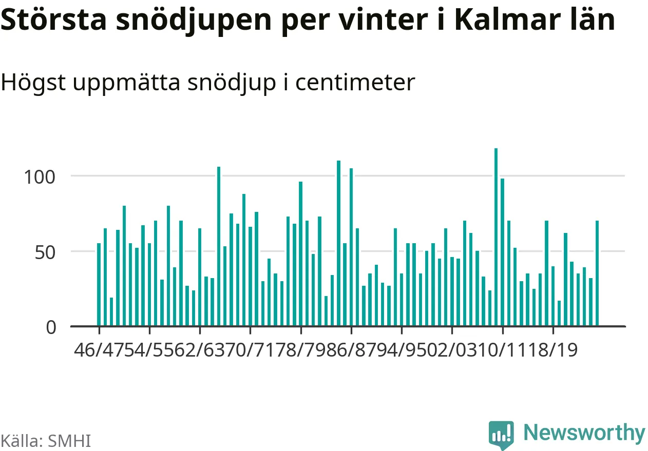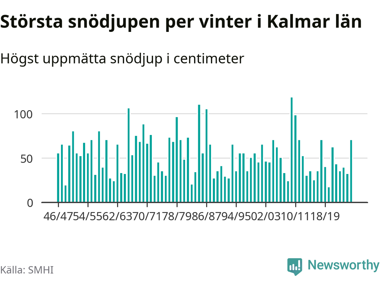 Men hur står sig det snödjupet historiskt sett? Newsworthy har tittat på det största snödjup som SMHI har uppmätt i Kalmar län varje år sedan vintern 1946/47. 13 vintrar har det uppmätts större snödjup.