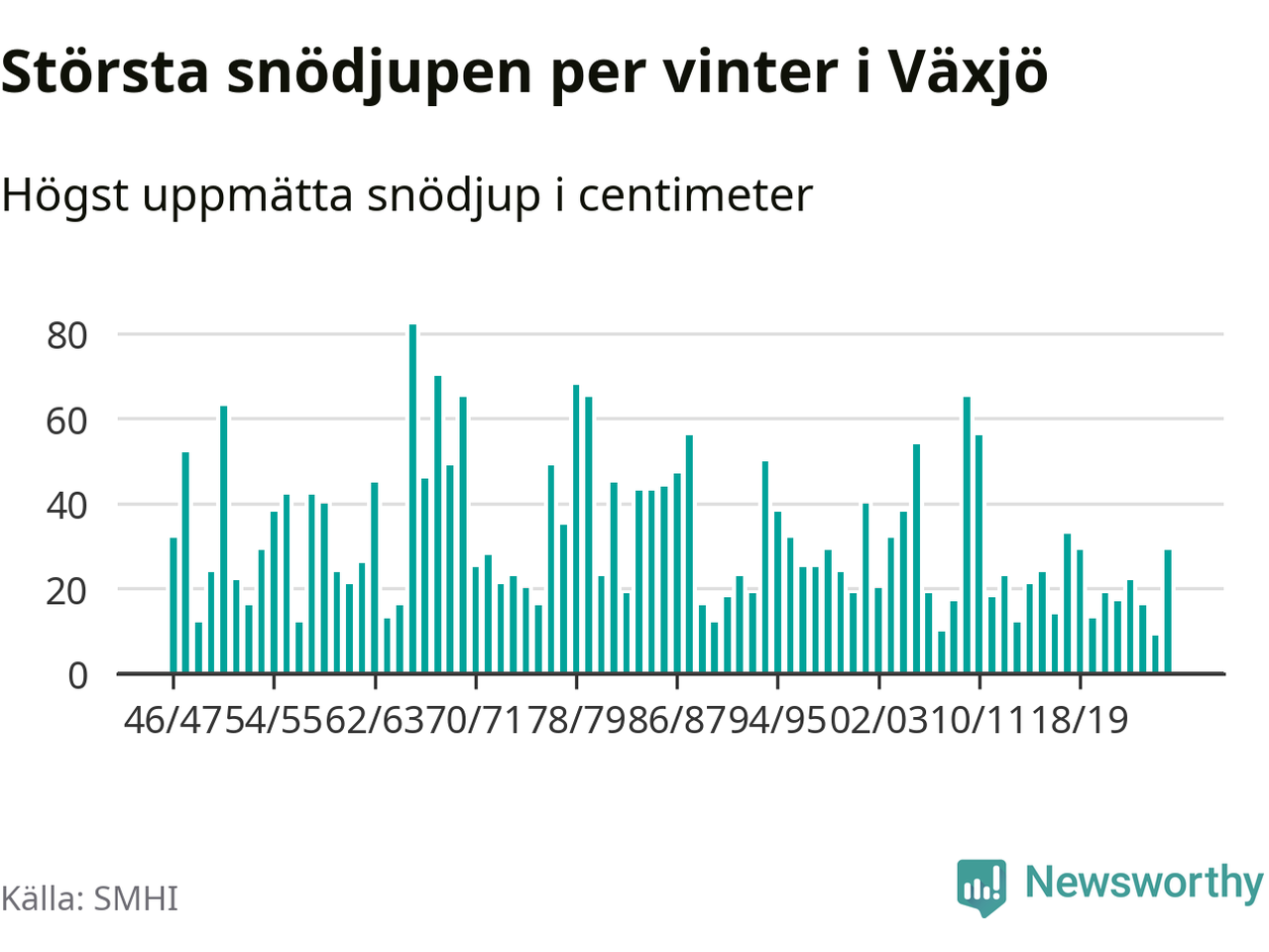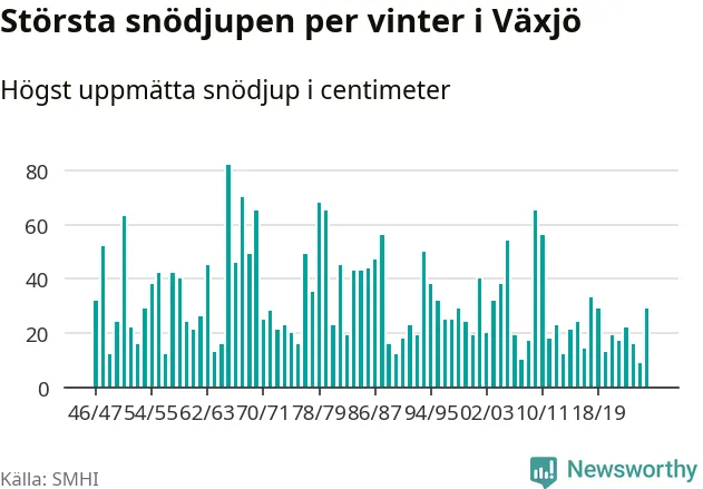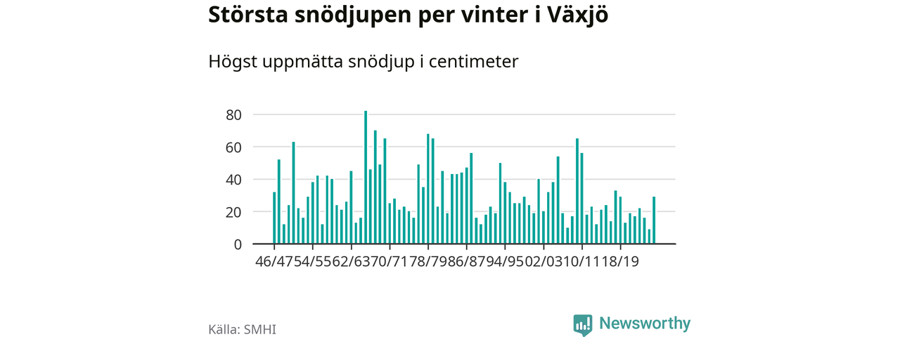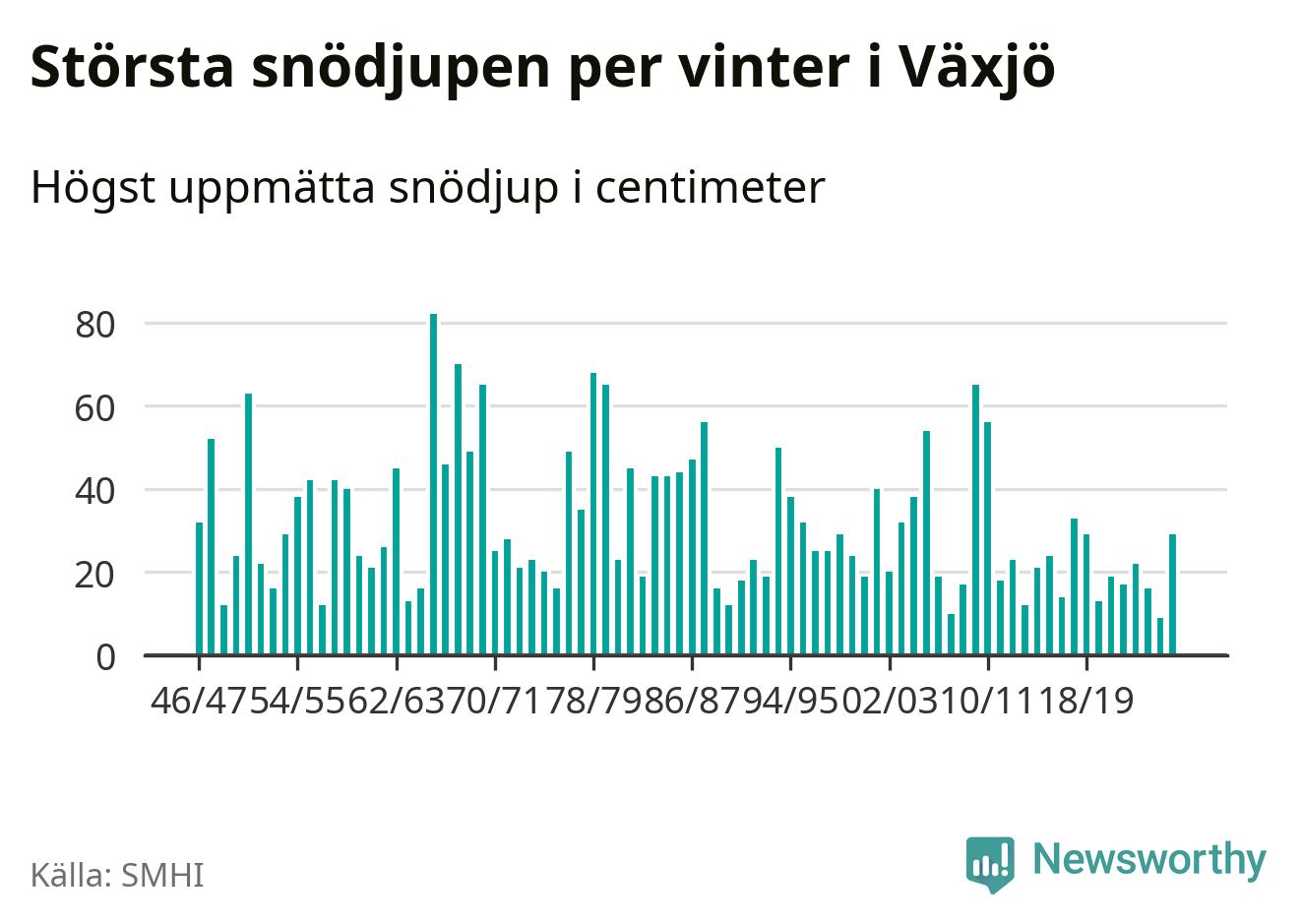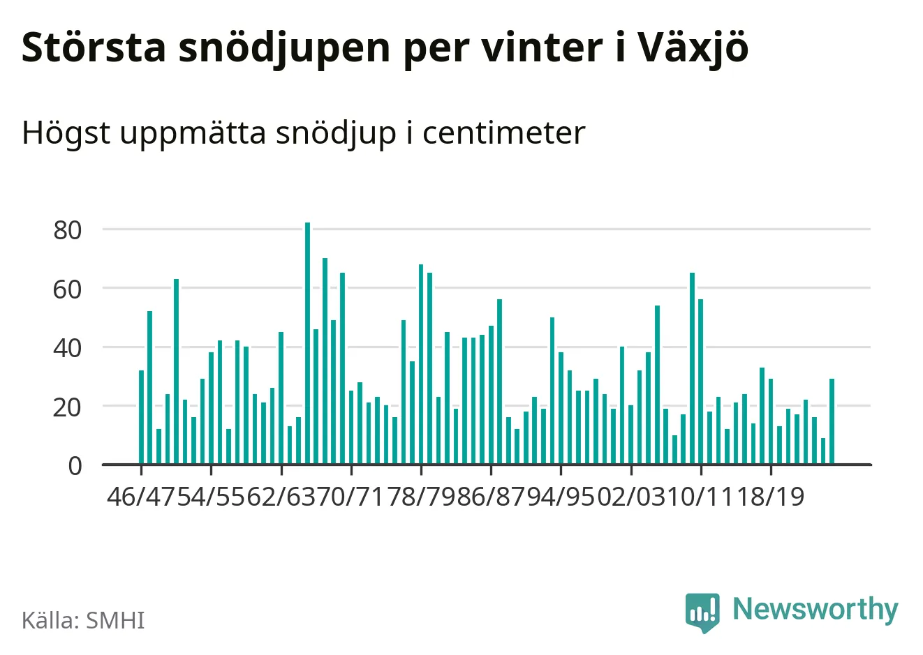 Men hur står sig det snödjupet historiskt sett? Newsworthy har tittat på det största snödjup som SMHI har uppmätt i Växjö kommun varje år sedan vintern 1946/47 – och hittills tar sig årets vinter inte in bland de 25 vintrarna med störst uppmätt snödjup i kommunen.