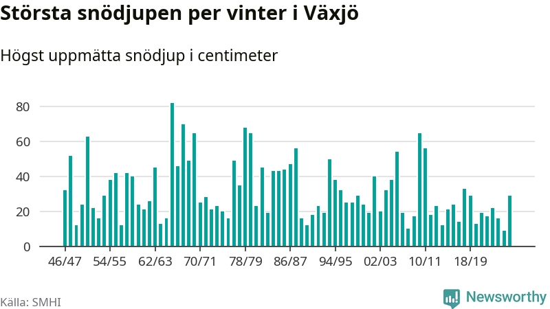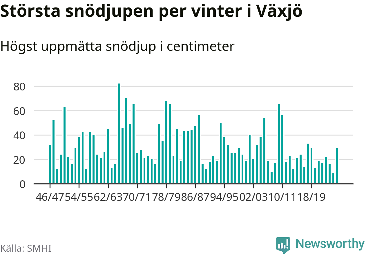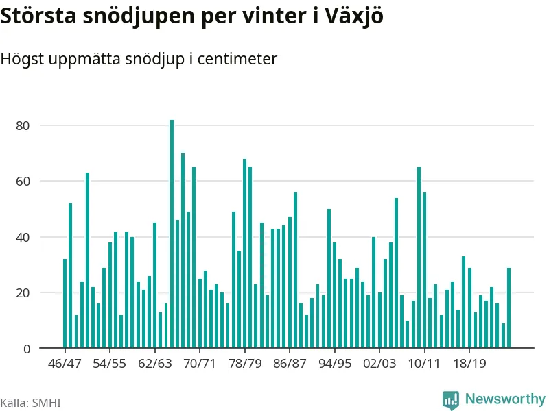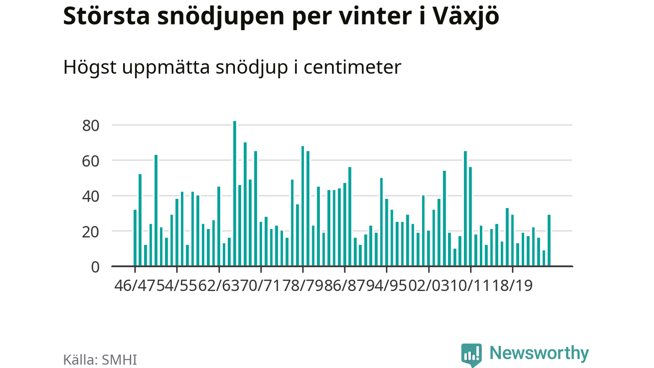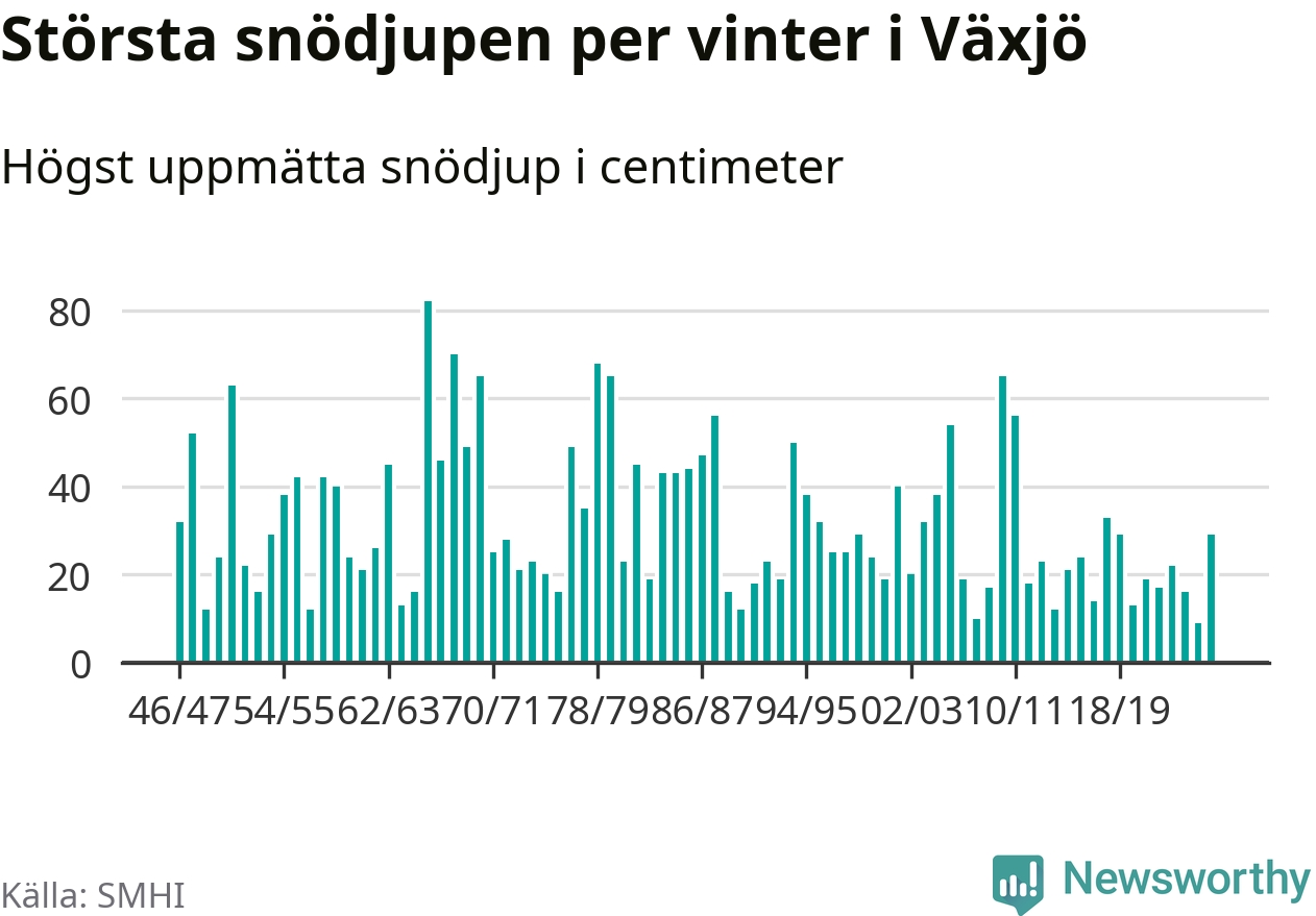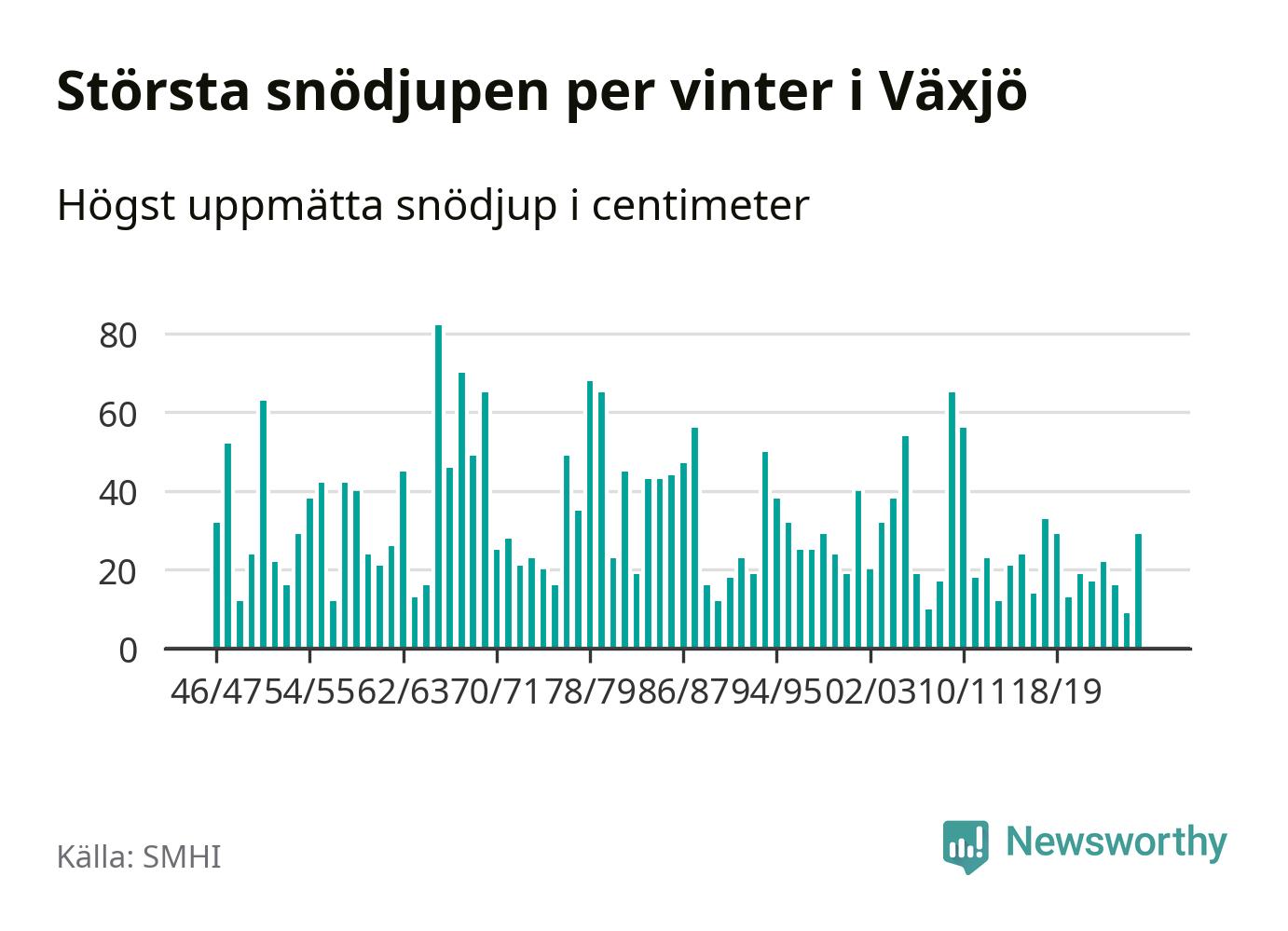 Men hur står sig det snödjupet historiskt sett? Newsworthy har tittat på det största snödjup som SMHI har uppmätt i Växjö kommun varje år sedan vintern 1946/47 – och hittills tar sig årets vinter inte in bland de 25 vintrarna med störst uppmätt snödjup i kommunen.