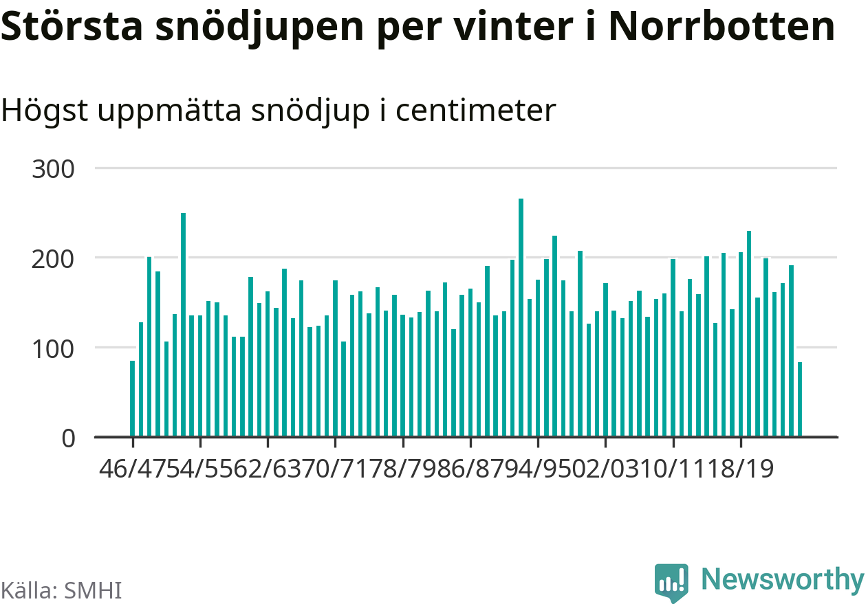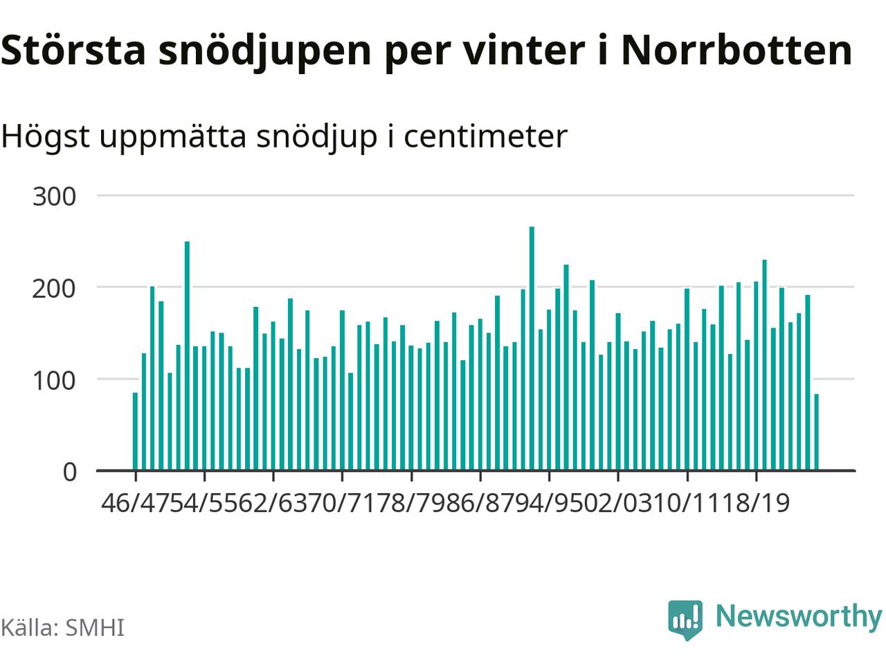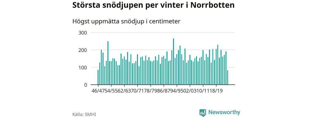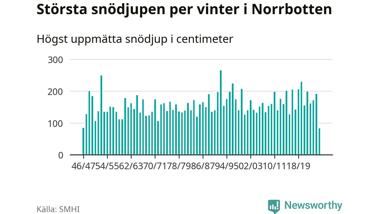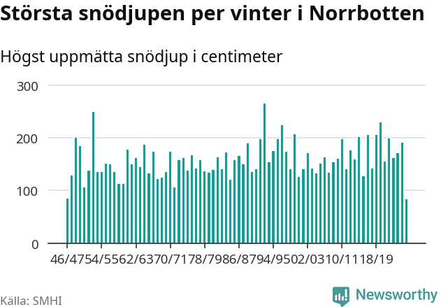 Men hur står sig det snödjupet historiskt sett? Newsworthy har tittat på det största snödjup som SMHI har uppmätt i Norrbottens län varje år sedan vintern 1946/47 – och hittills tar sig årets vinter inte in bland de 25 vintrarna med störst uppmätt snödjup i länet.
