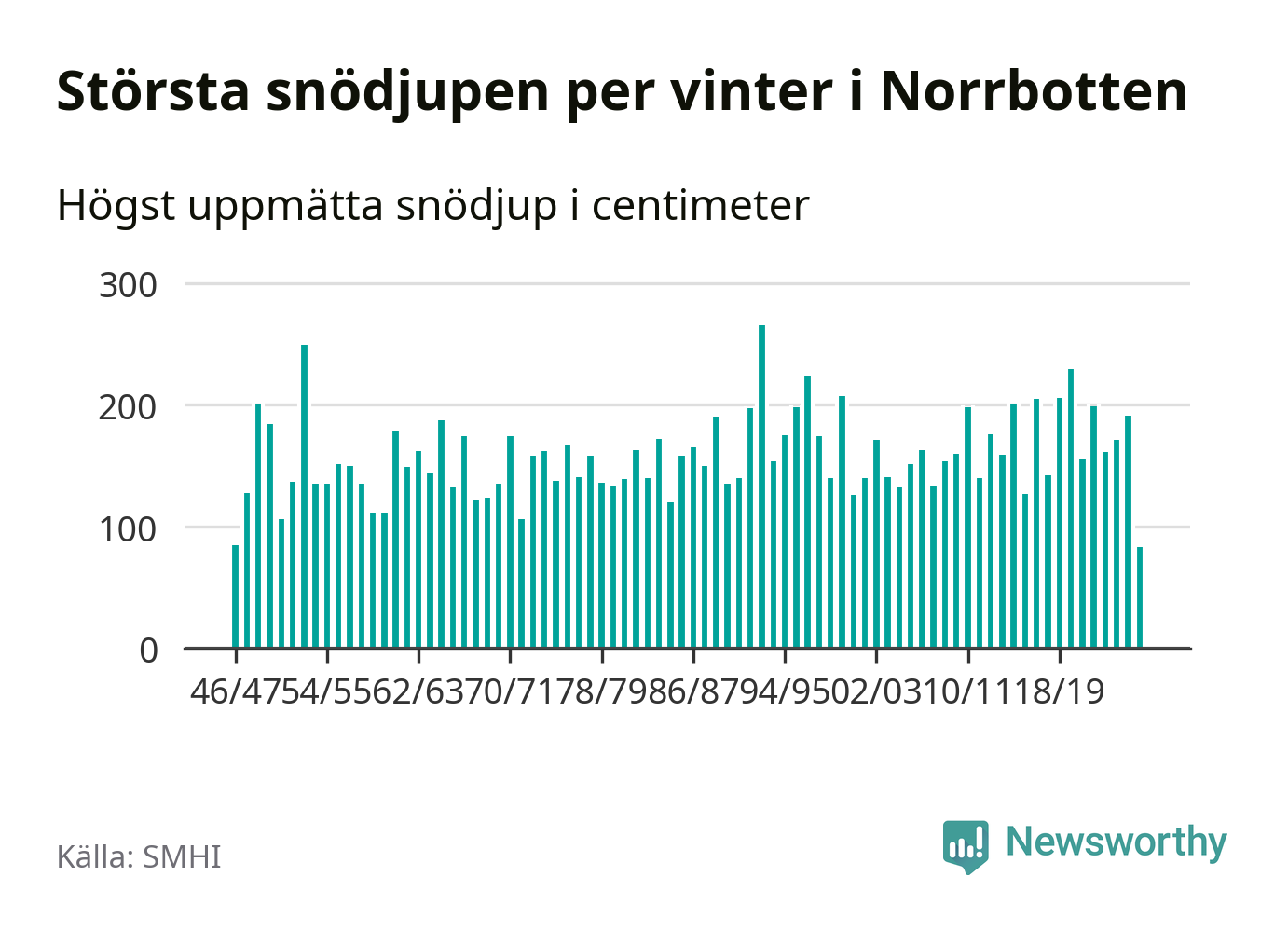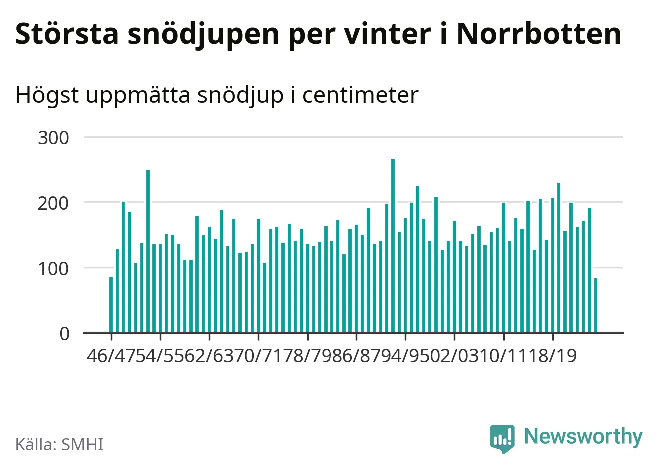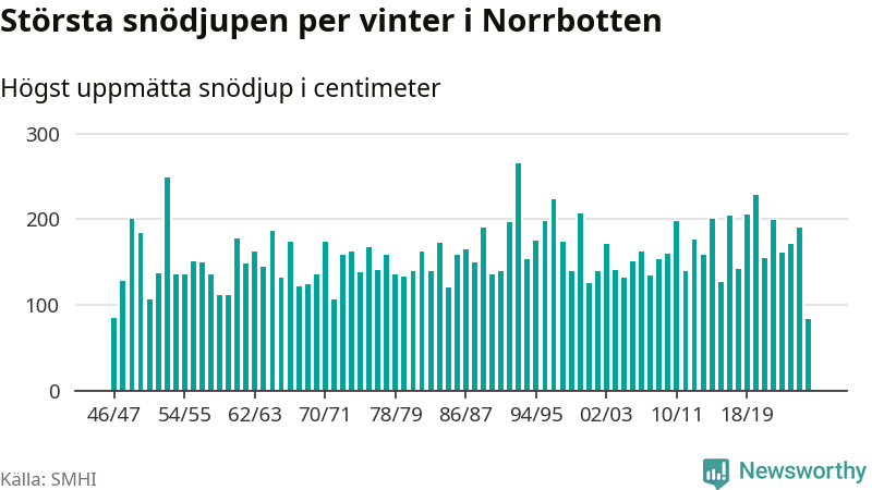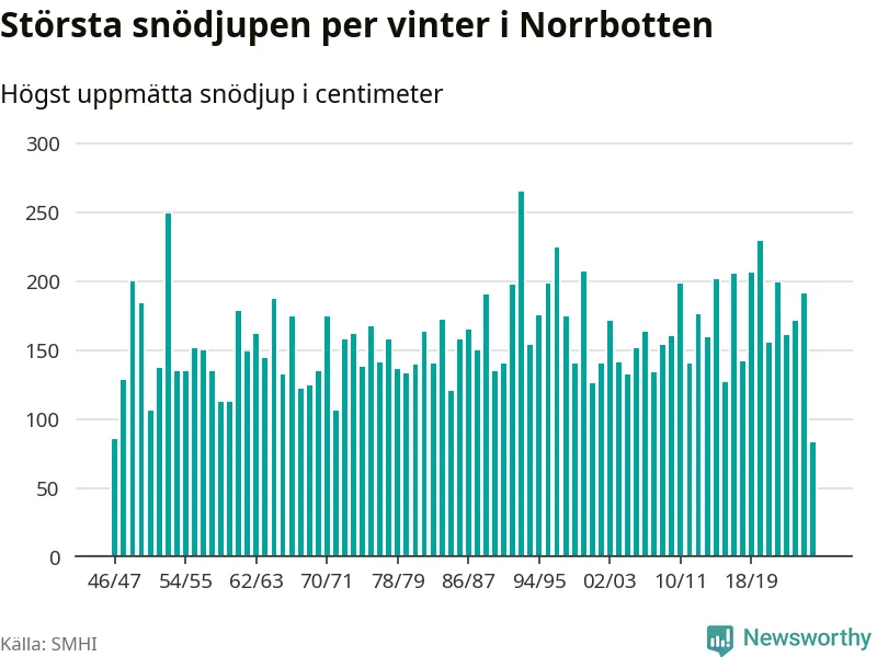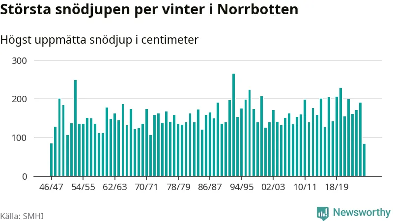 Men hur står sig det snödjupet historiskt sett? Newsworthy har tittat på det största snödjup som SMHI har uppmätt i Norrbottens län varje år sedan vintern 1946/47 – och hittills tar sig årets vinter inte in bland de 25 vintrarna med störst uppmätt snödjup i länet.