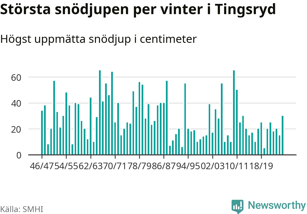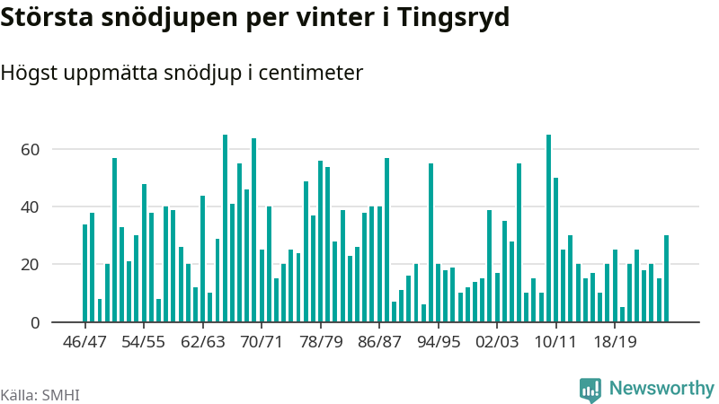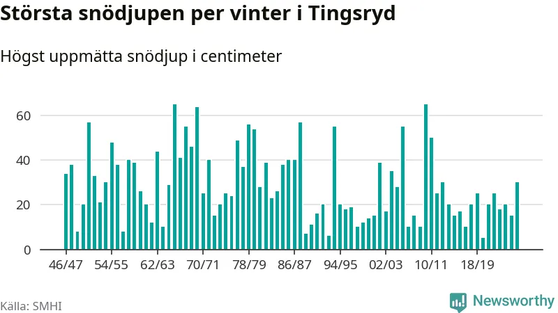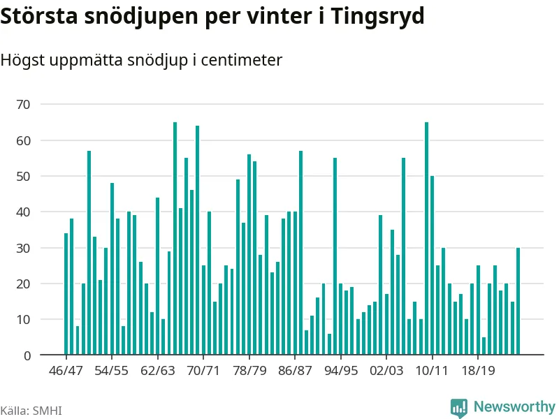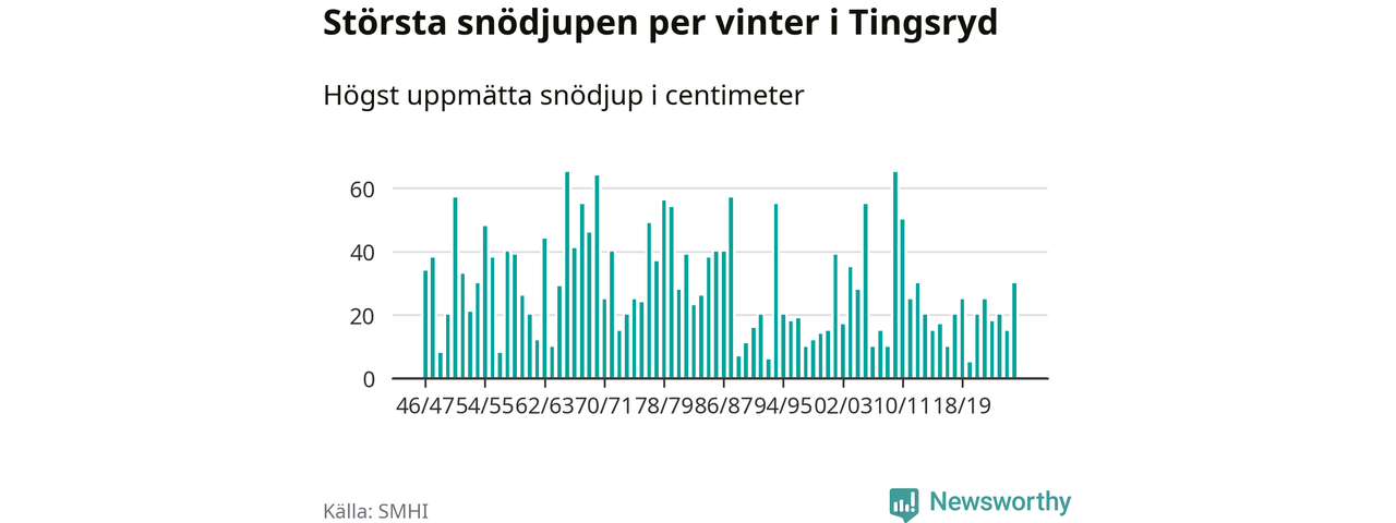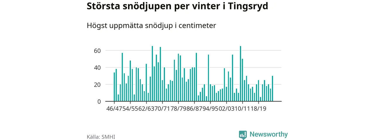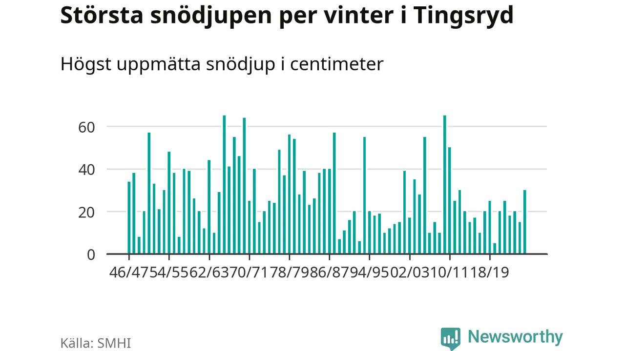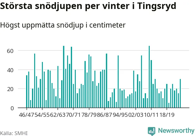 Men hur står sig det snödjupet historiskt sett? Newsworthy har tittat på det största snödjup som SMHI har uppmätt i Tingsryds kommun varje år sedan vintern 1946/47 – och hittills tar sig årets vinter inte in bland de 25 vintrarna med störst uppmätt snödjup i kommunen.