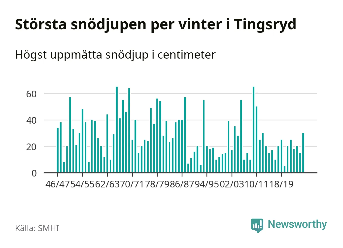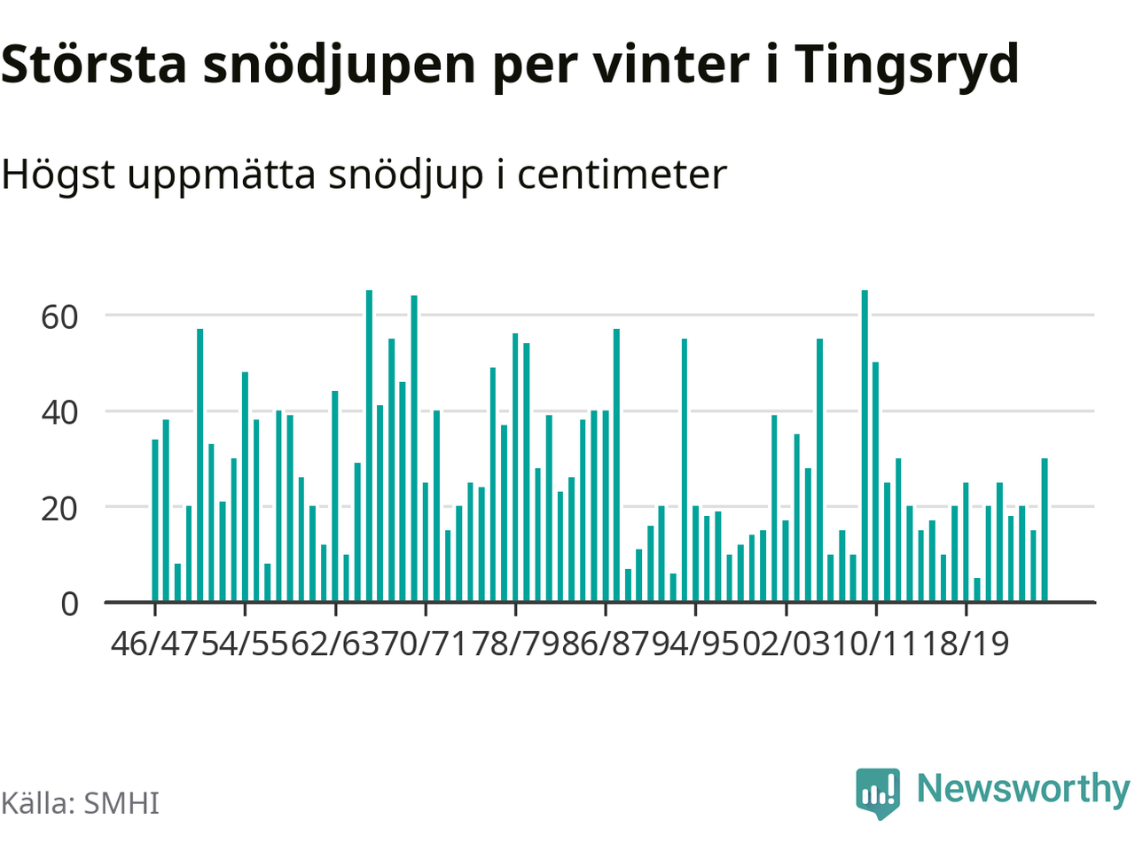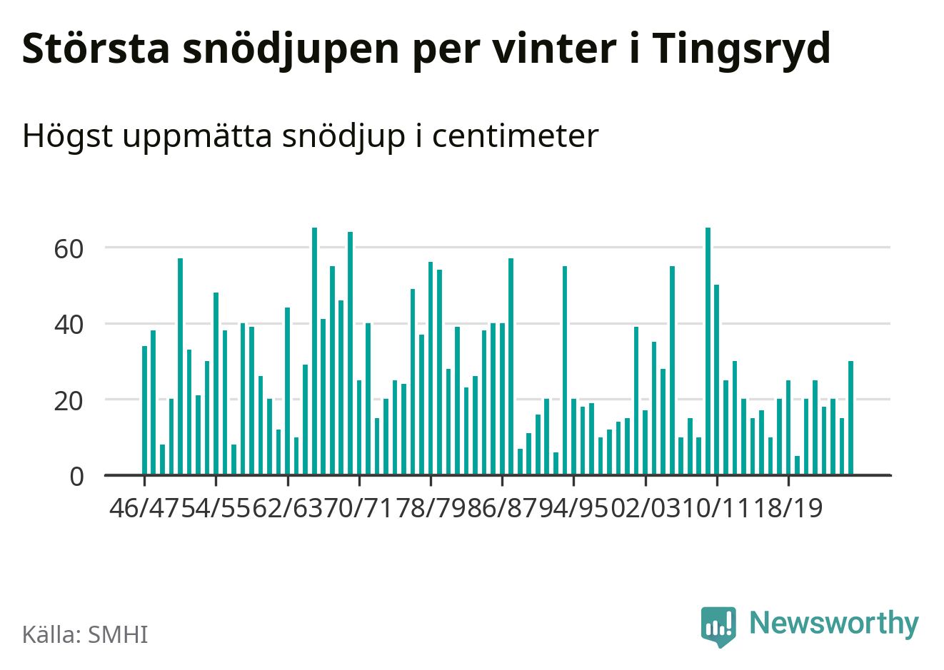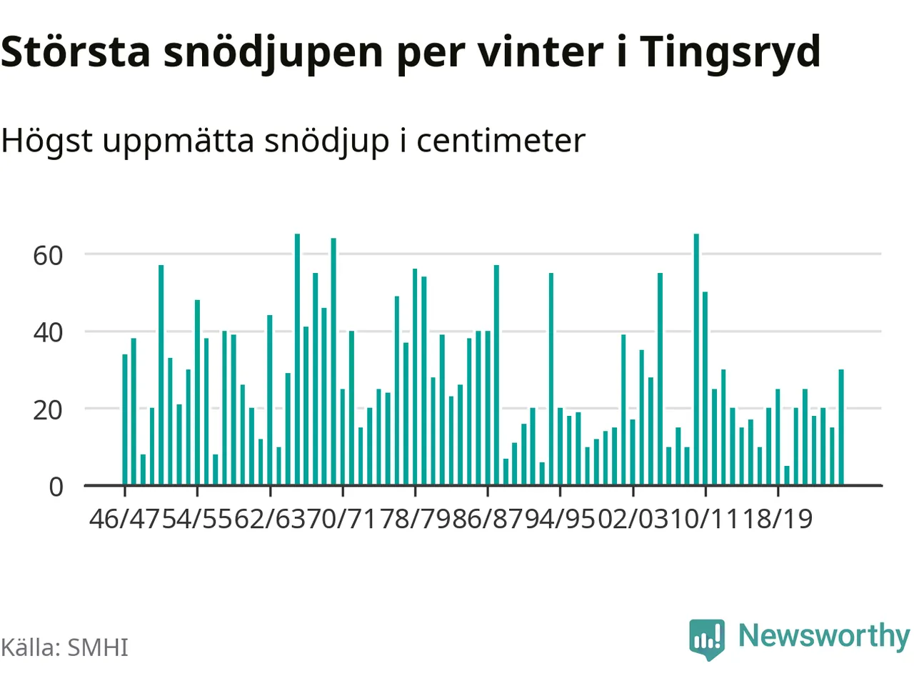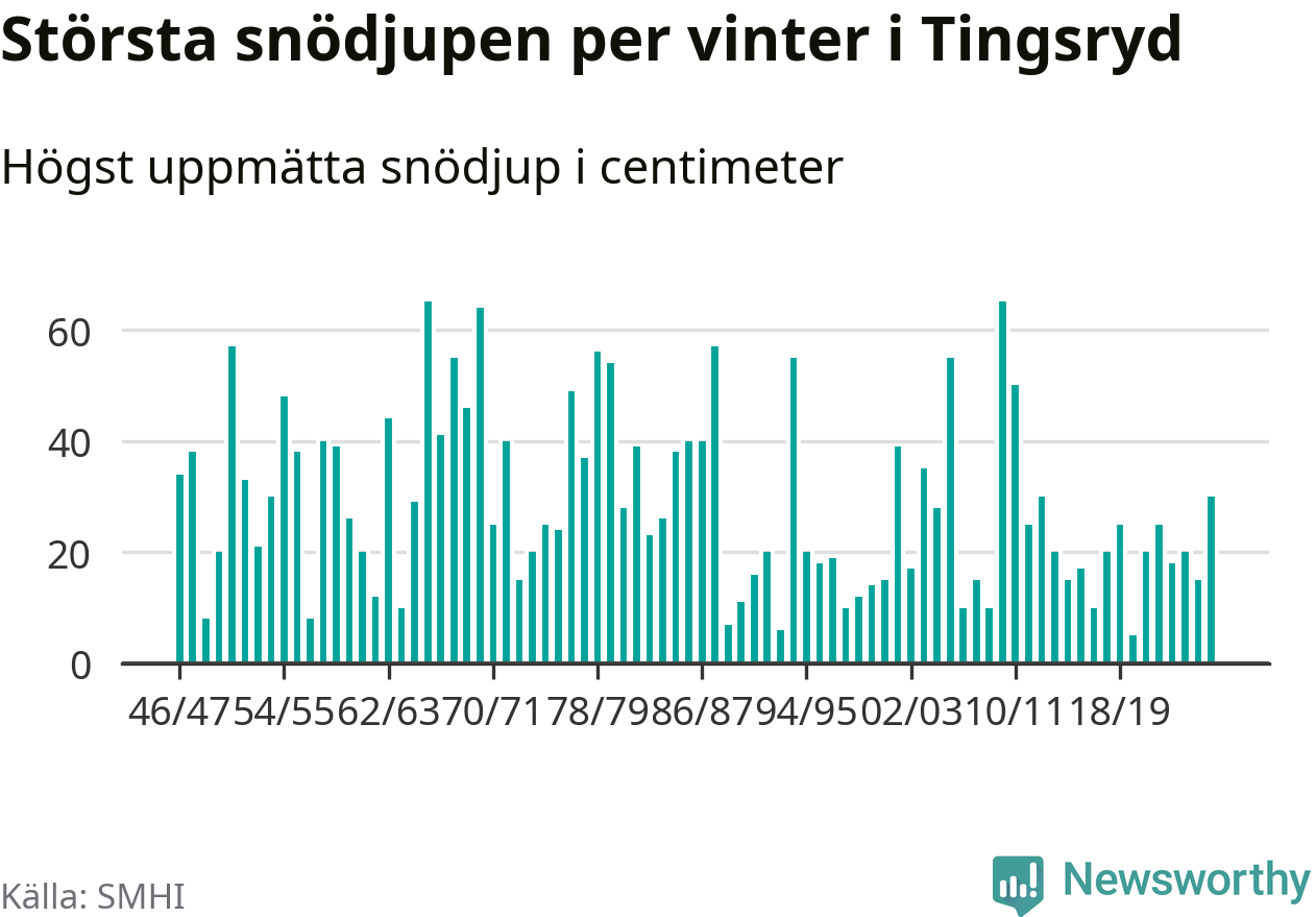 Men hur står sig det snödjupet historiskt sett? Newsworthy har tittat på det största snödjup som SMHI har uppmätt i Tingsryds kommun varje år sedan vintern 1946/47 – och hittills tar sig årets vinter inte in bland de 25 vintrarna med störst uppmätt snödjup i kommunen.