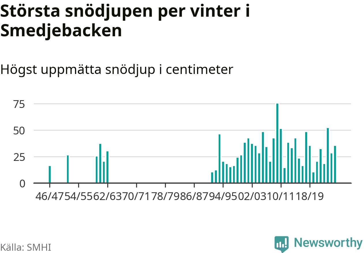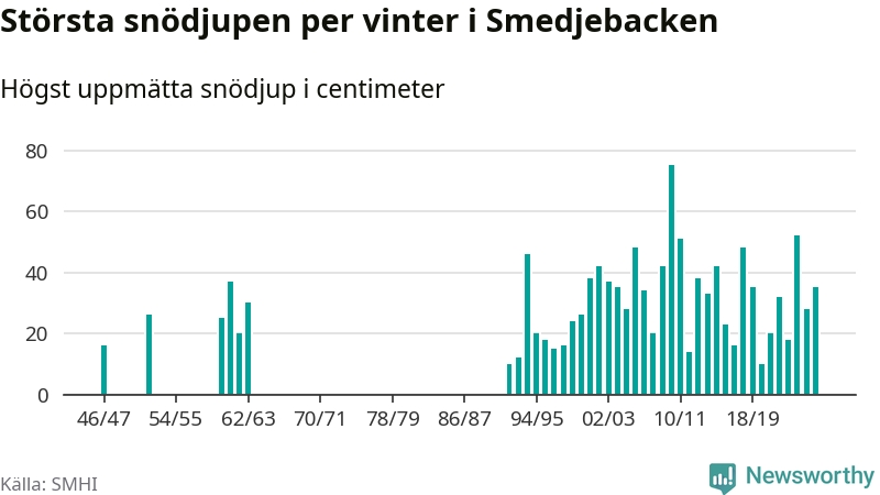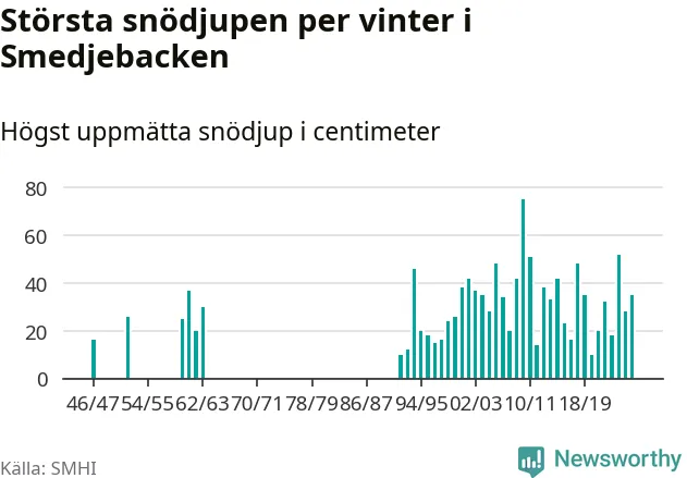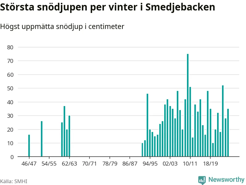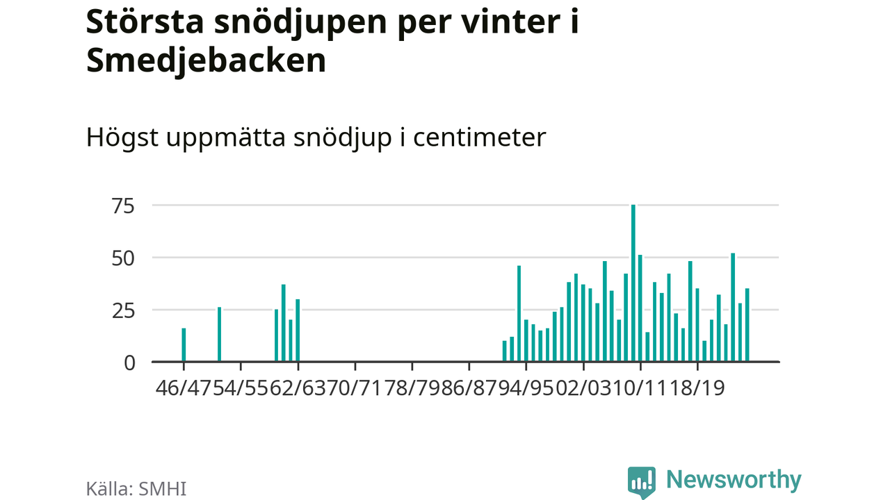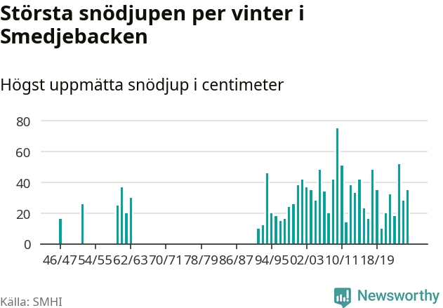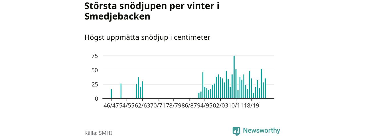Men hur står sig det snödjupet historiskt sett? Newsworthy har tittat på det största snödjup som SMHI har uppmätt i Smedjebackens kommun varje år sedan vintern 1946/47. 13 vintrar har det uppmätts större snödjup. Det ska sägas att det inte finns några noteringar för åren 1948–1951, 1953, 1954, 1956–1959 och 1964–1991.