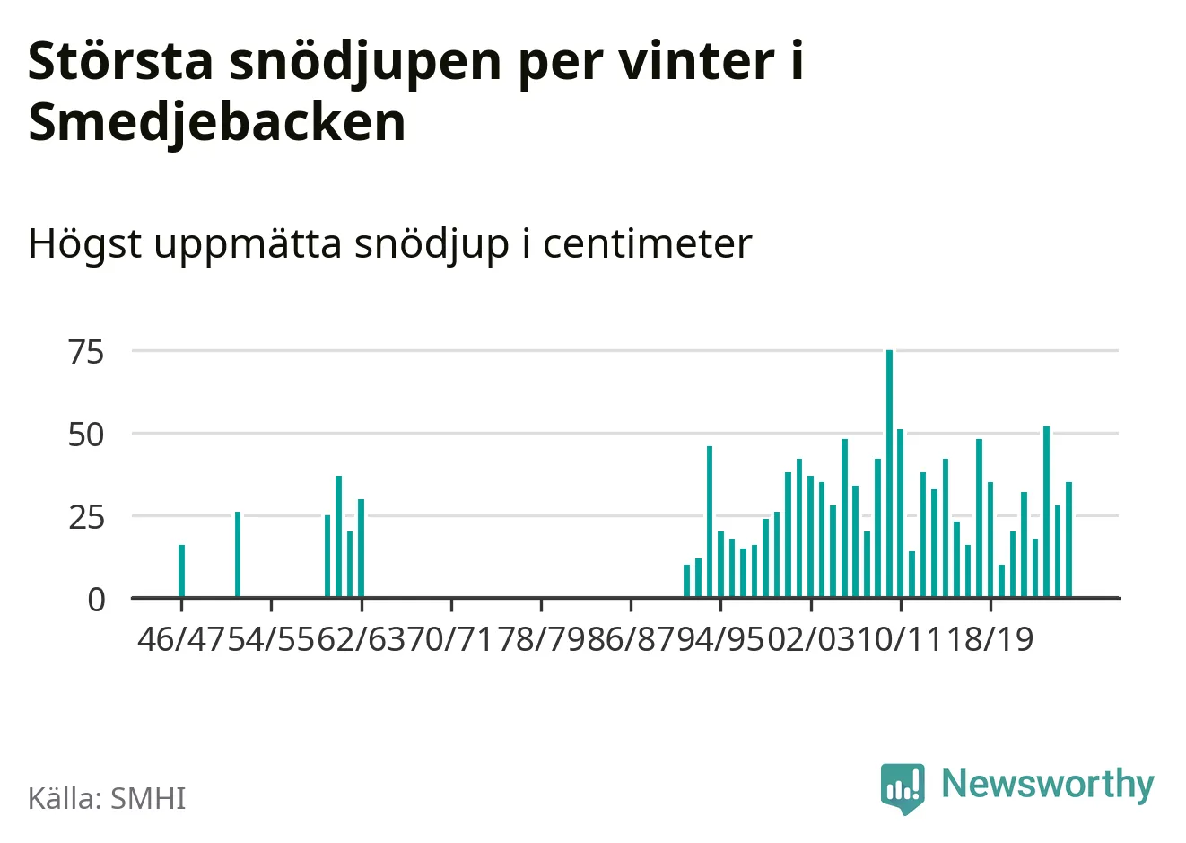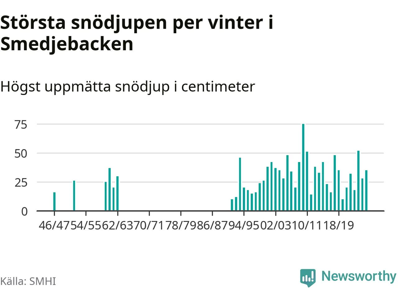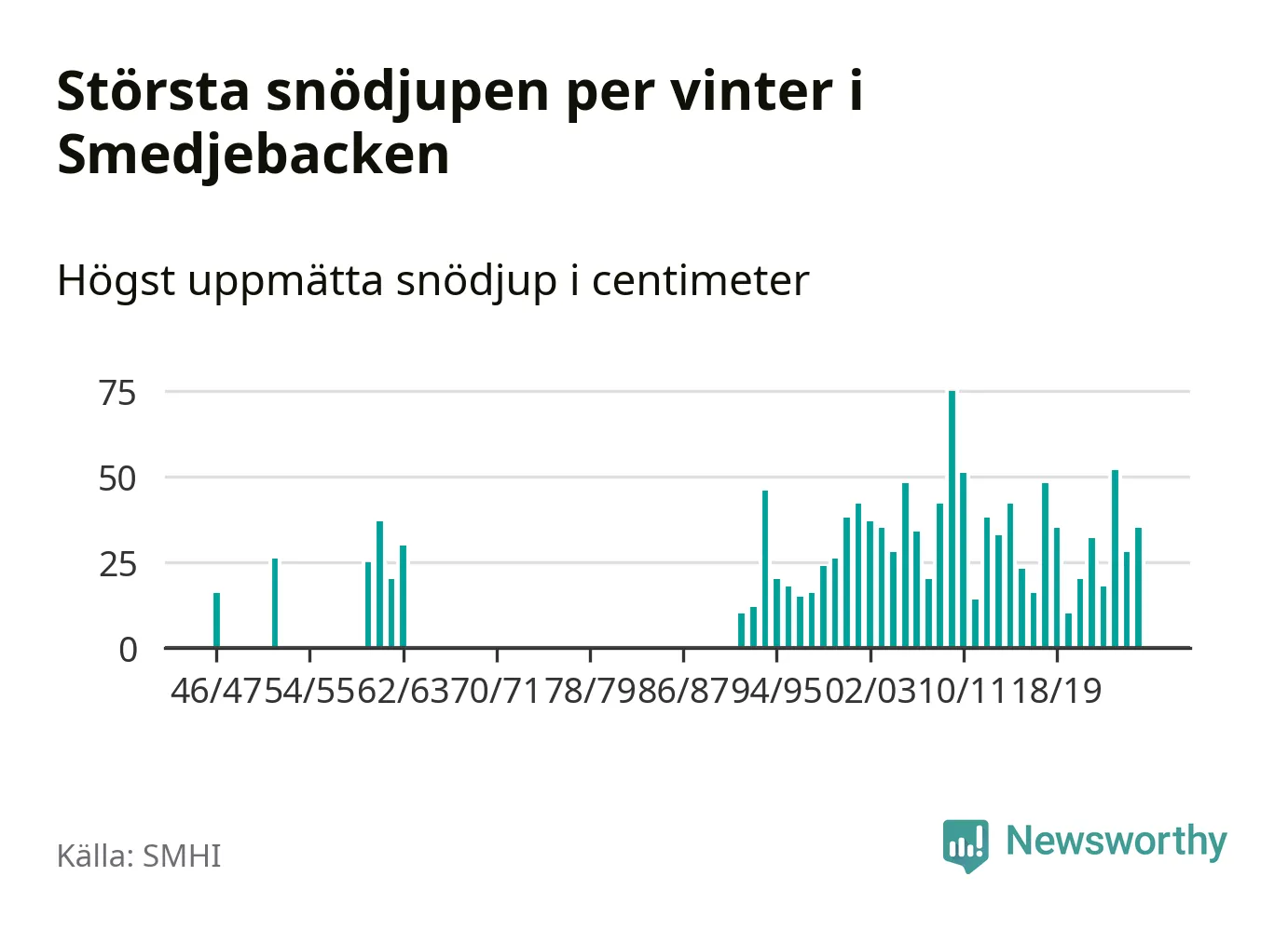 Men hur står sig det snödjupet historiskt sett? Newsworthy har tittat på det största snödjup som SMHI har uppmätt i Smedjebackens kommun varje år sedan vintern 1946/47. 13 vintrar har det uppmätts större snödjup. Det ska sägas att det inte finns några noteringar för åren 1948–1951, 1953, 1954, 1956–1959 och 1964–1991.
