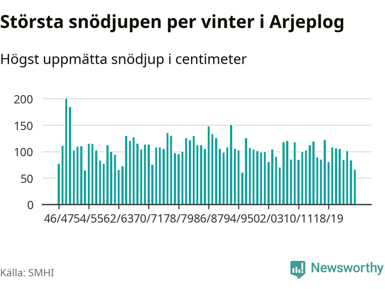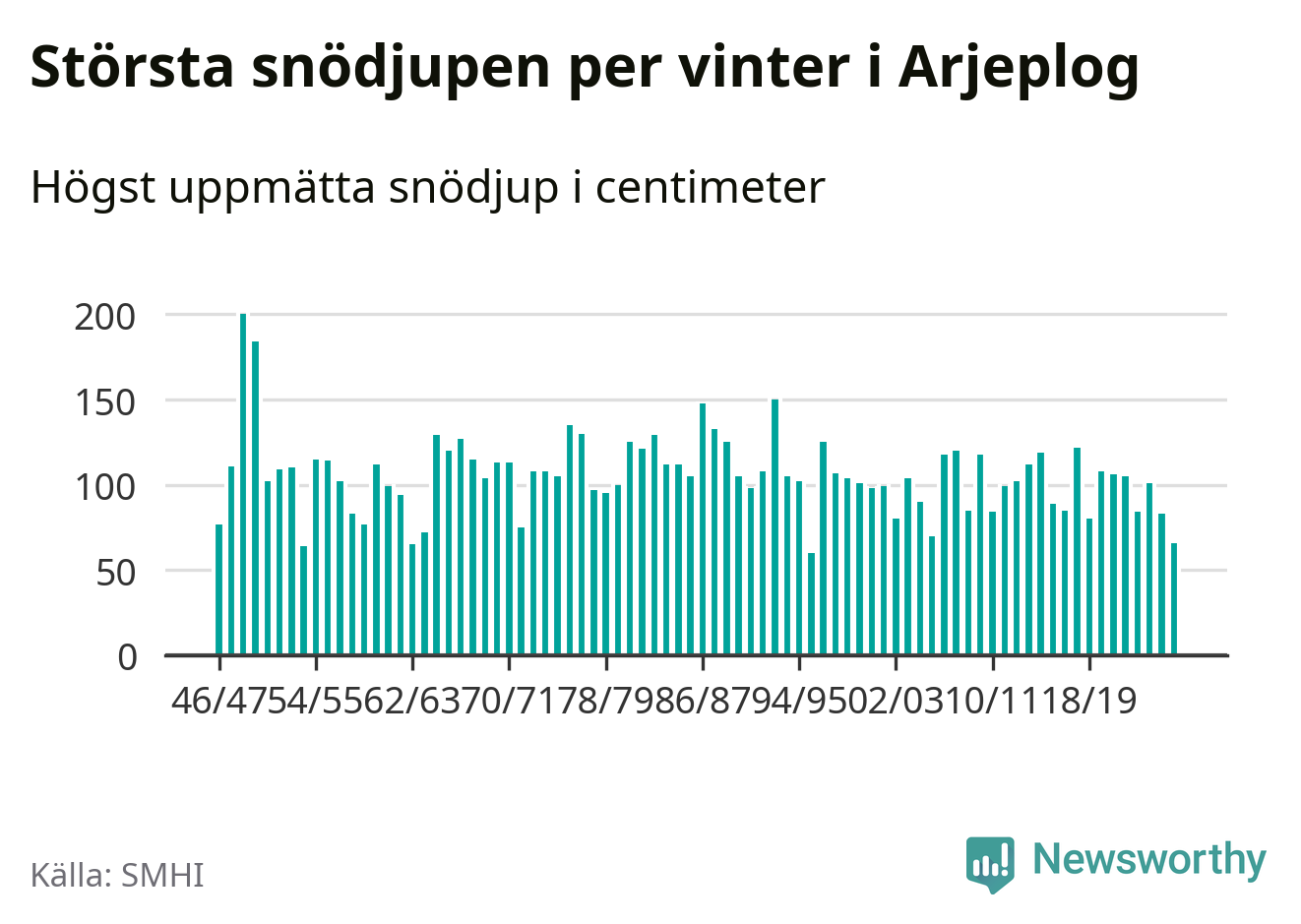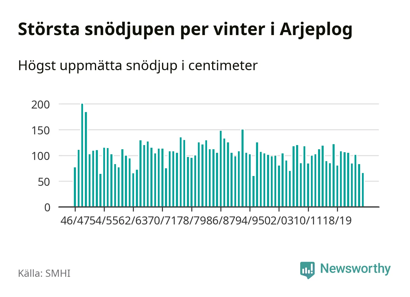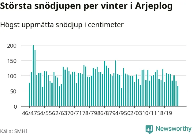 Men hur står sig det snödjupet historiskt sett? Newsworthy har tittat på det största snödjup som SMHI har uppmätt i Arjeplogs kommun varje år sedan vintern 1946/47 – och hittills tar sig årets vinter inte in bland de 25 vintrarna med störst uppmätt snödjup i kommunen.