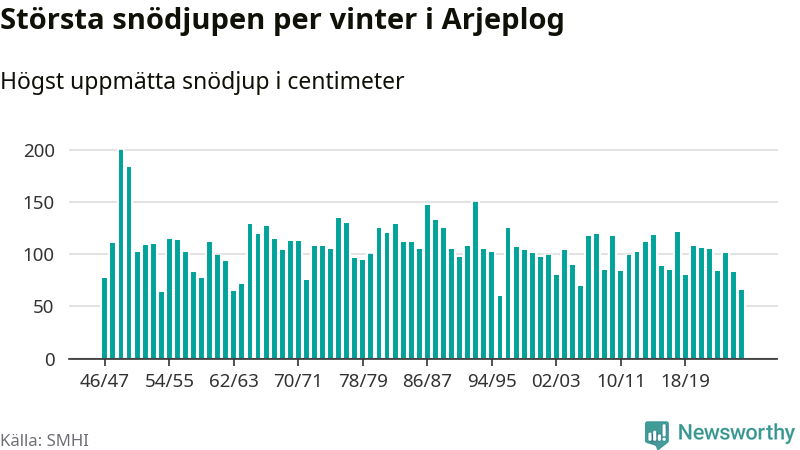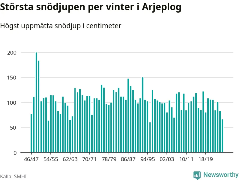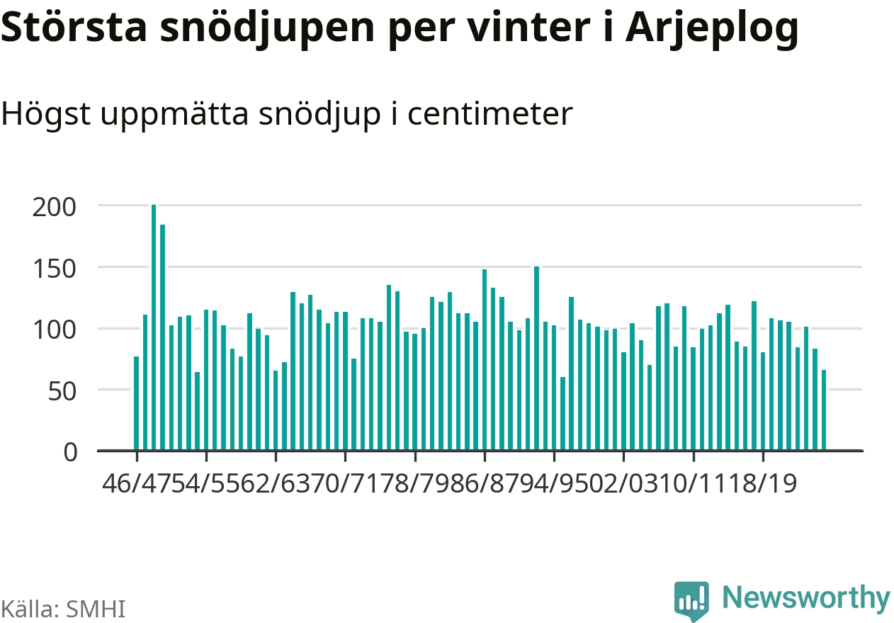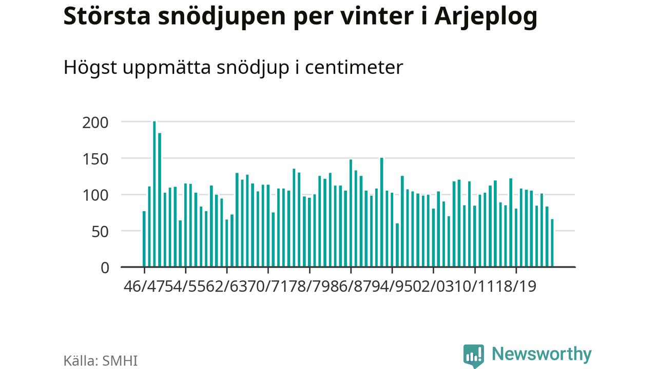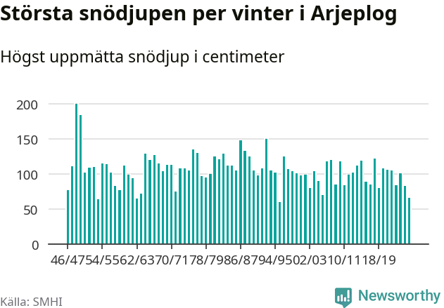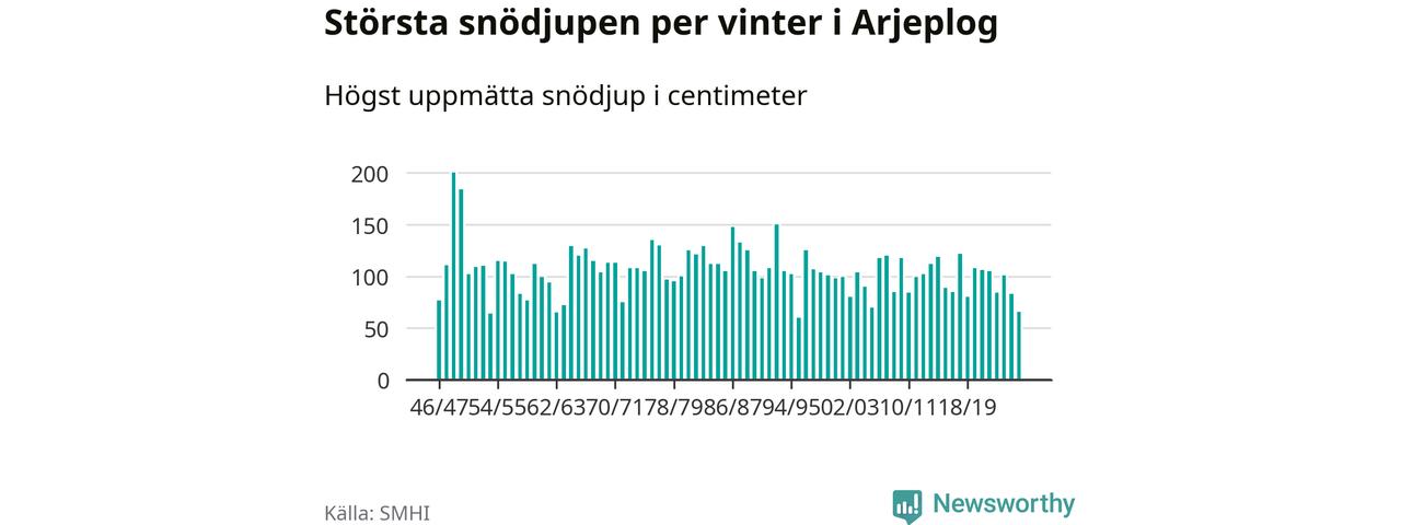 Men hur står sig det snödjupet historiskt sett? Newsworthy har tittat på det största snödjup som SMHI har uppmätt i Arjeplogs kommun varje år sedan vintern 1946/47 – och hittills tar sig årets vinter inte in bland de 25 vintrarna med störst uppmätt snödjup i kommunen.