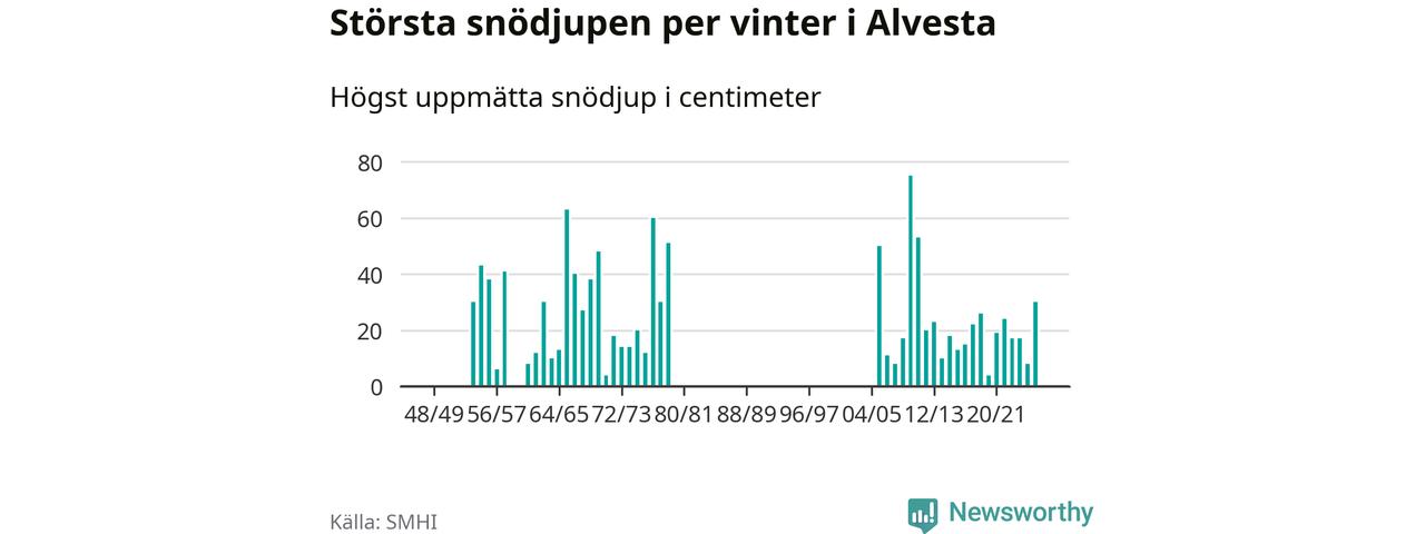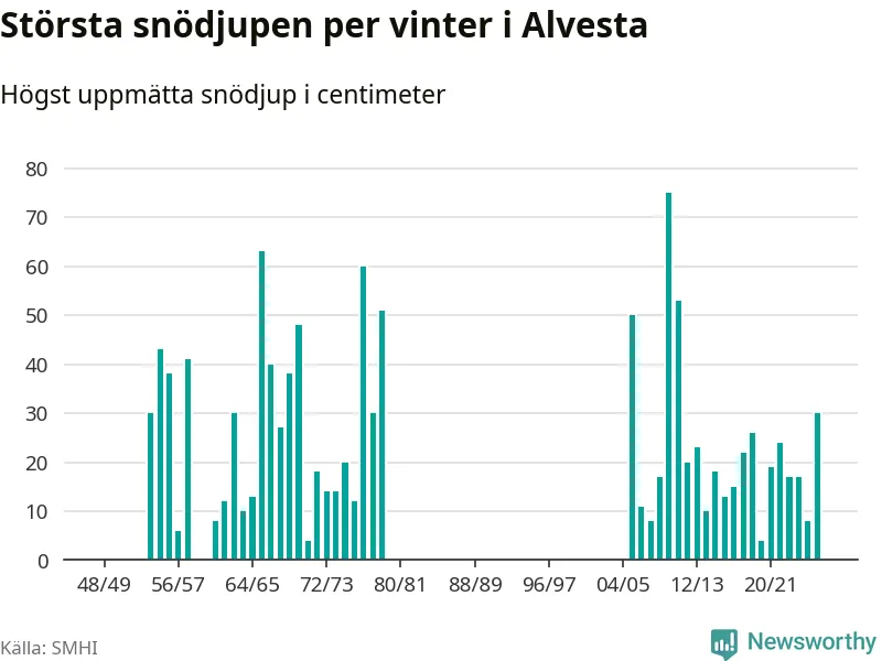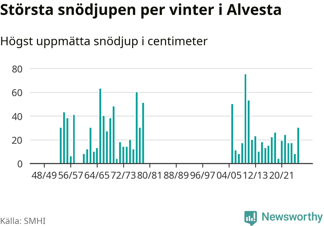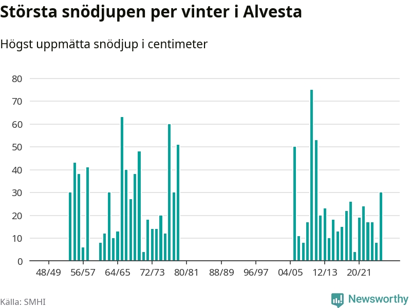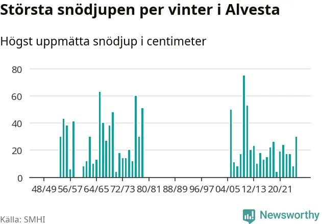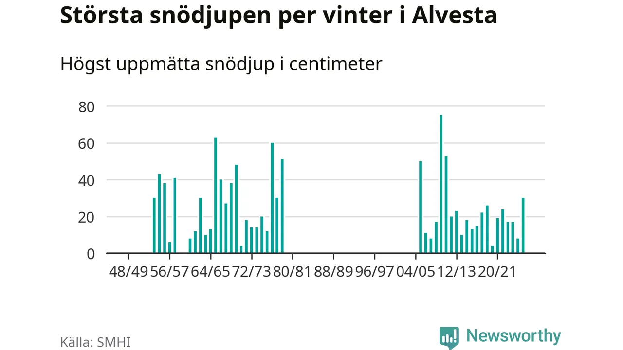 Men hur står sig det snödjupet historiskt sett? Newsworthy har tittat på det största snödjup som SMHI har uppmätt i Alvesta kommun varje år sedan vintern 1948/49. Tolv vintrar har det uppmätts större snödjup. Det ska sägas att det inte finns några noteringar för åren 1959, 1960 och 1980–2005.