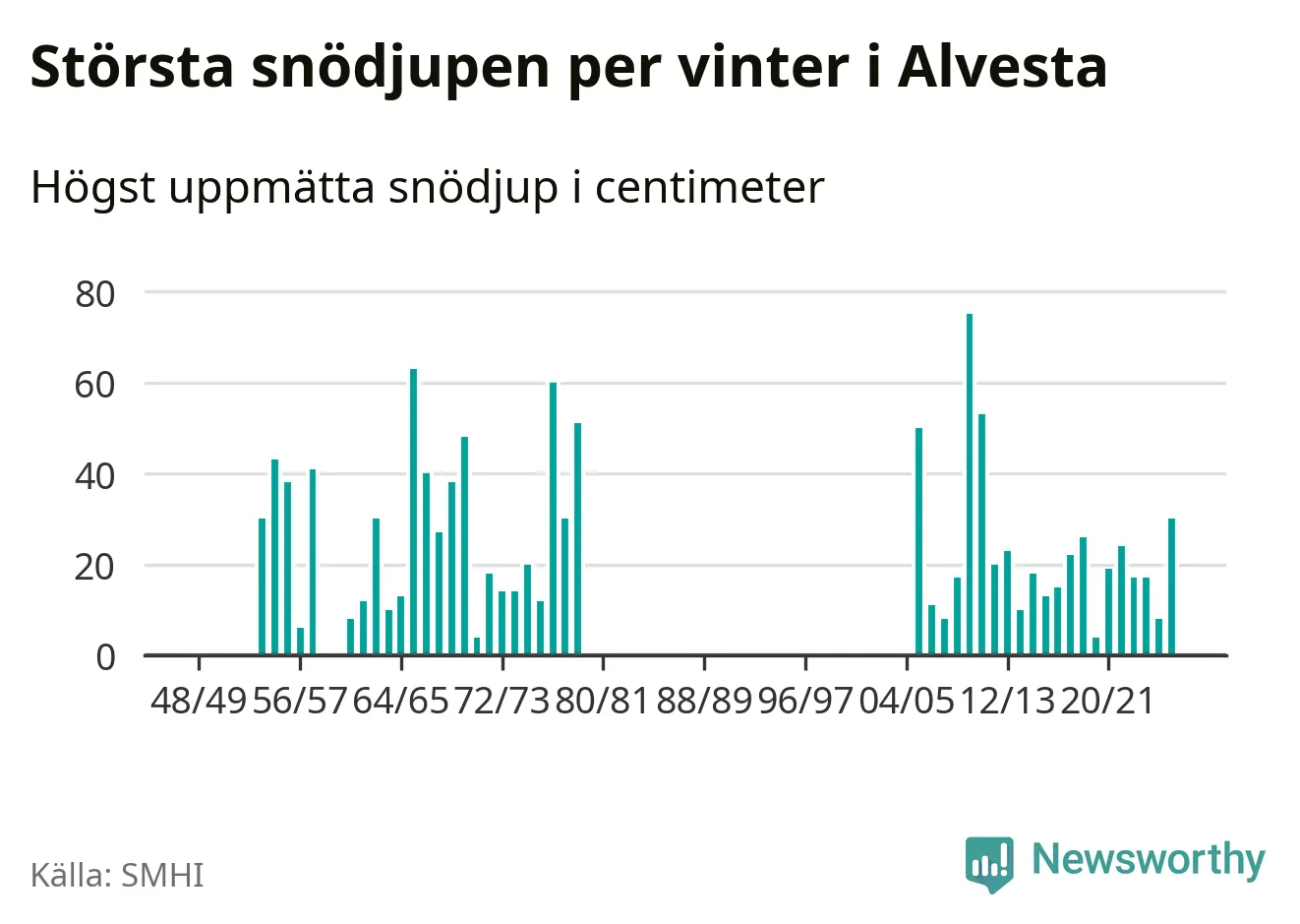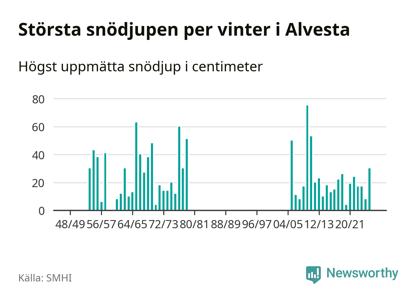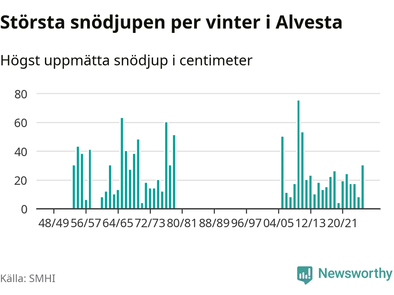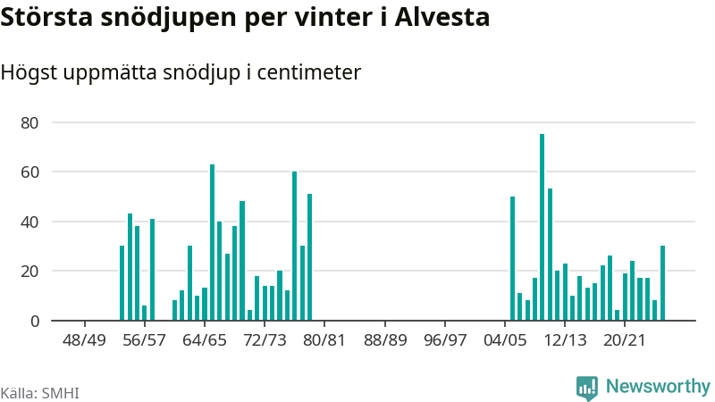 Men hur står sig det snödjupet historiskt sett? Newsworthy har tittat på det största snödjup som SMHI har uppmätt i Alvesta kommun varje år sedan vintern 1948/49. Tolv vintrar har det uppmätts större snödjup. Det ska sägas att det inte finns några noteringar för åren 1959, 1960 och 1980–2005.