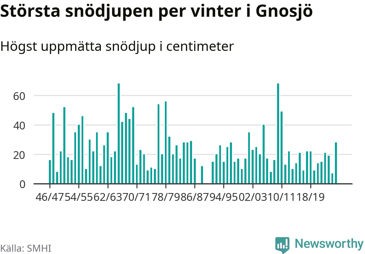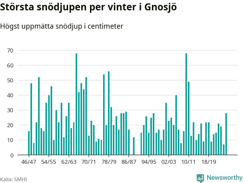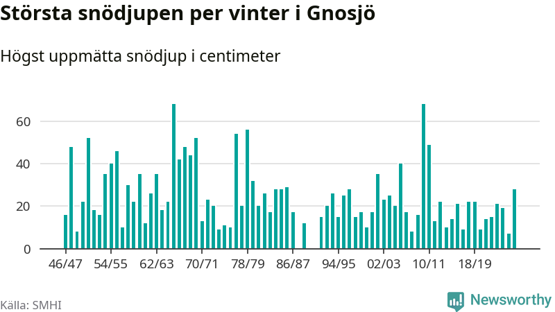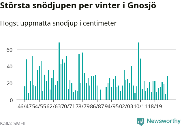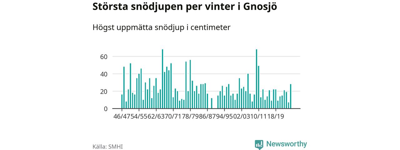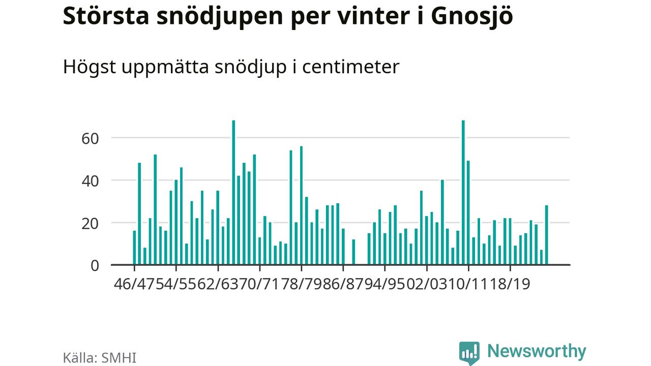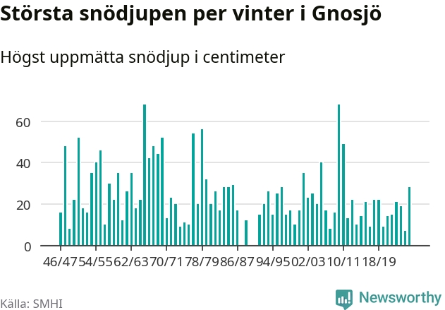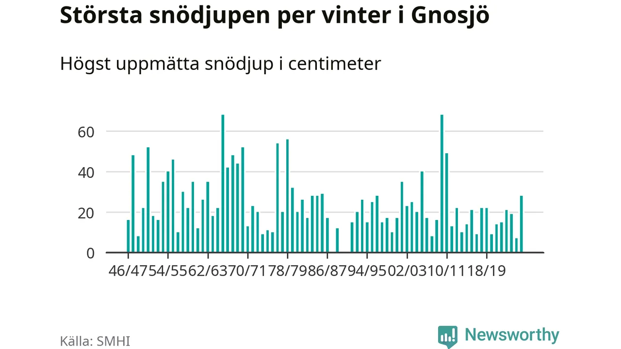 Men hur står sig det snödjupet historiskt sett? Newsworthy har tittat på det största snödjup som SMHI har uppmätt i Gnosjö kommun varje år sedan vintern 1946/47. 21 vintrar har det uppmätts större snödjup. Det ska sägas att det inte finns några noteringar för åren 1988, 1990 och 1991.