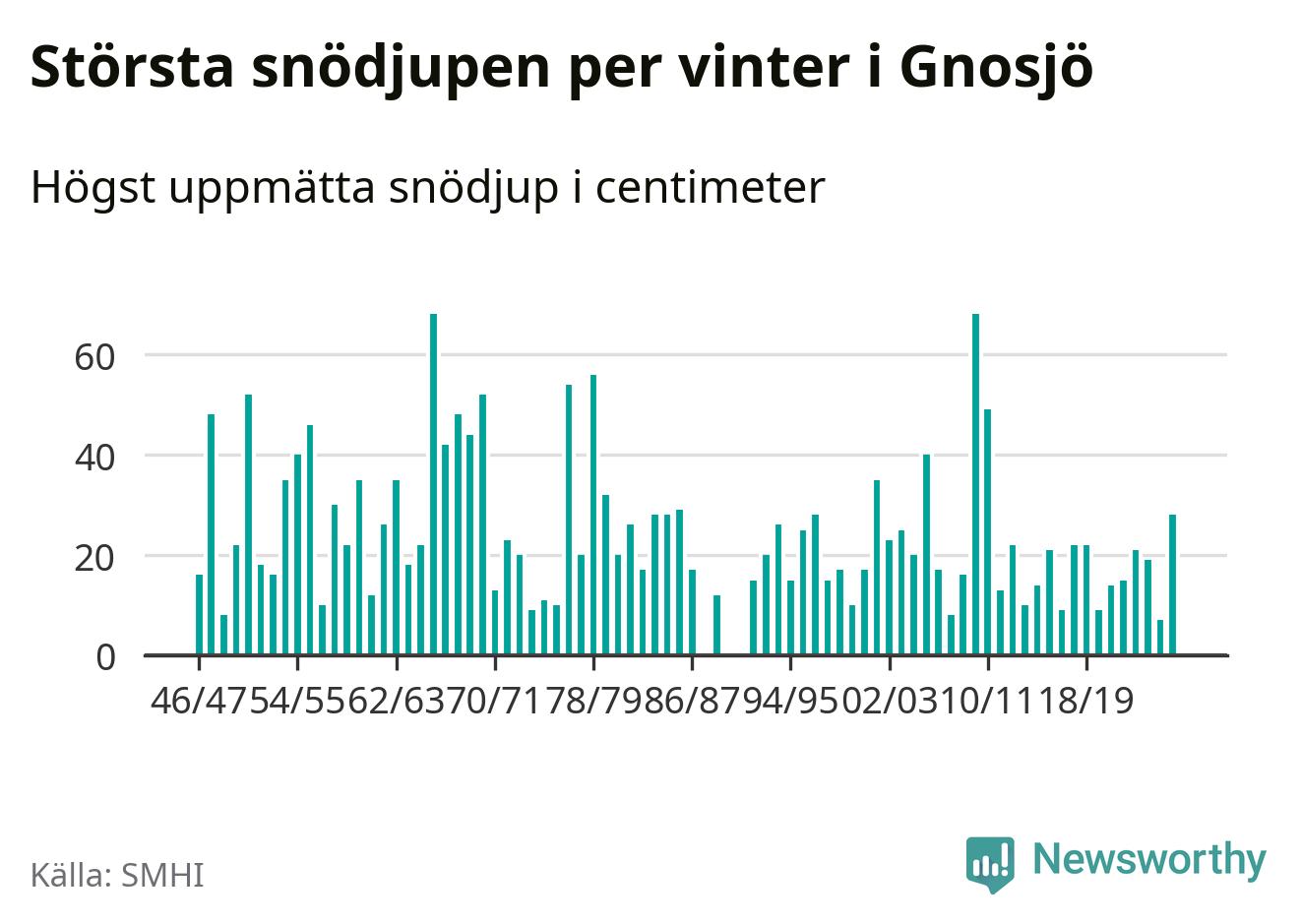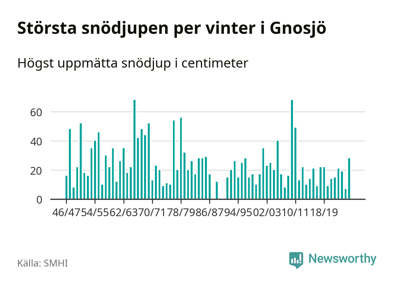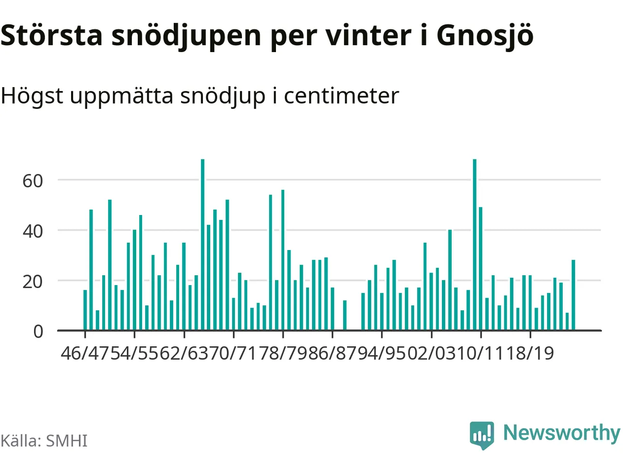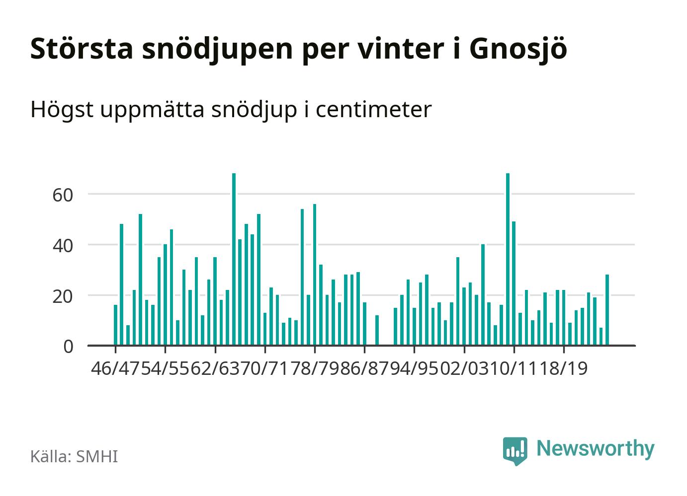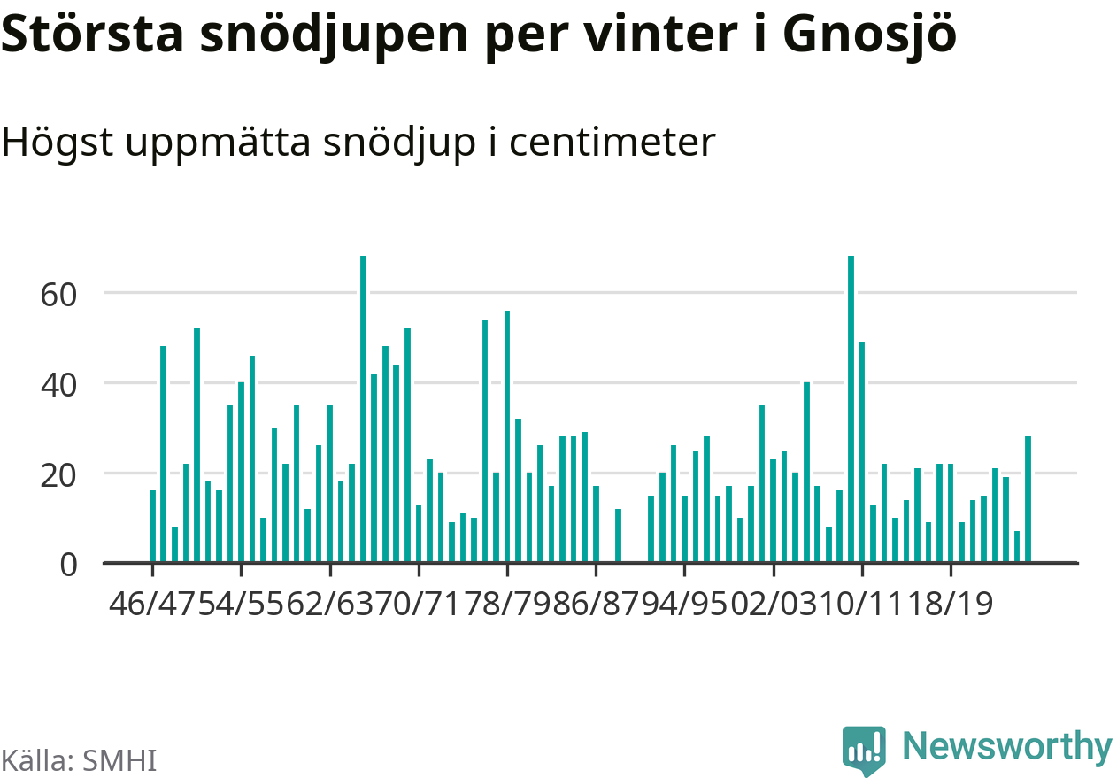 Men hur står sig det snödjupet historiskt sett? Newsworthy har tittat på det största snödjup som SMHI har uppmätt i Gnosjö kommun varje år sedan vintern 1946/47. 21 vintrar har det uppmätts större snödjup. Det ska sägas att det inte finns några noteringar för åren 1988, 1990 och 1991.