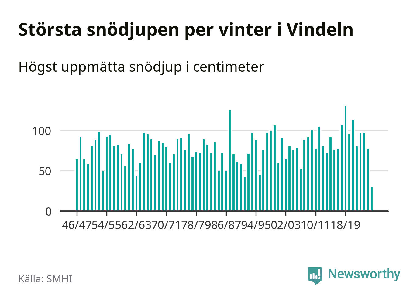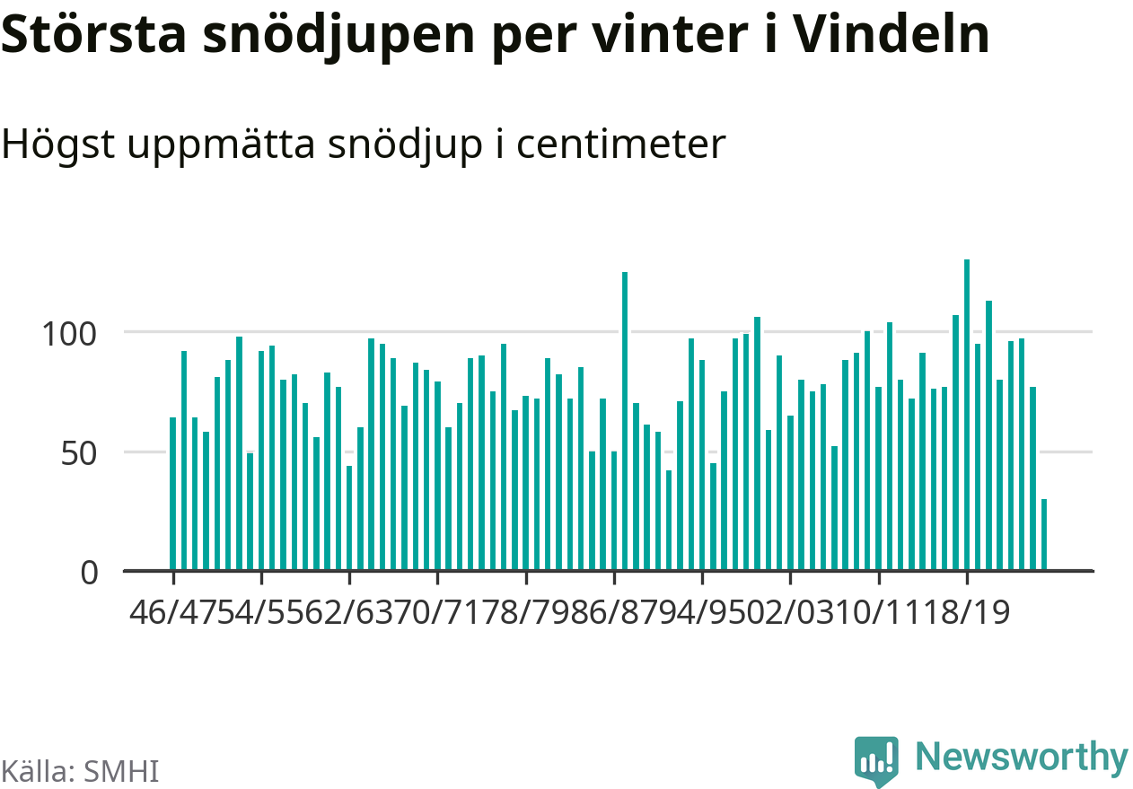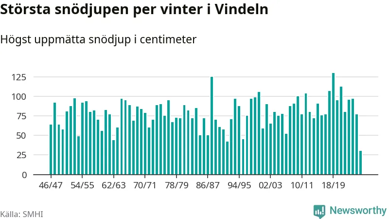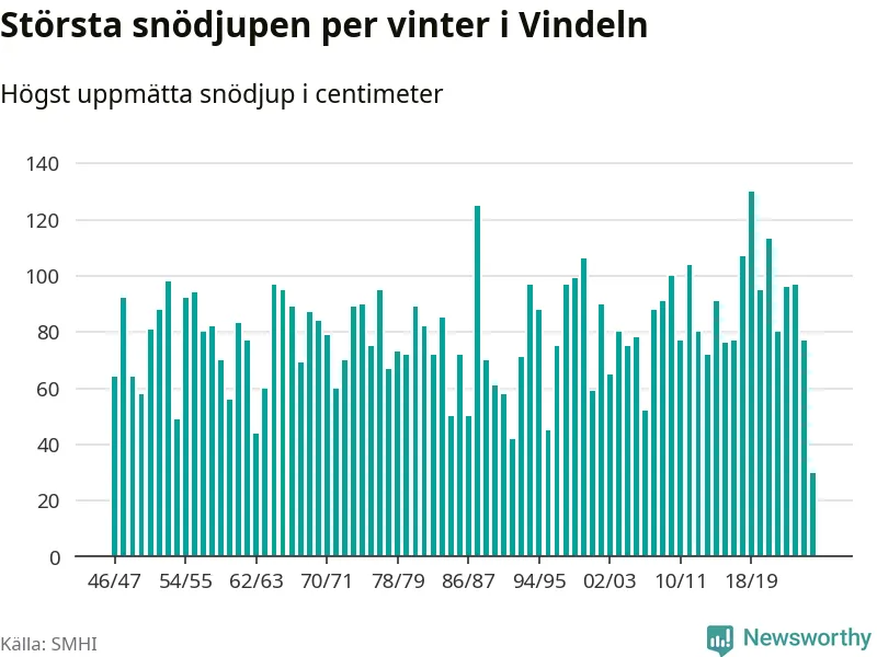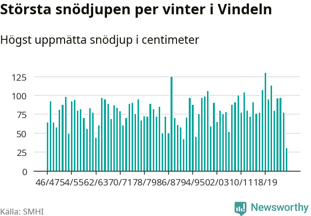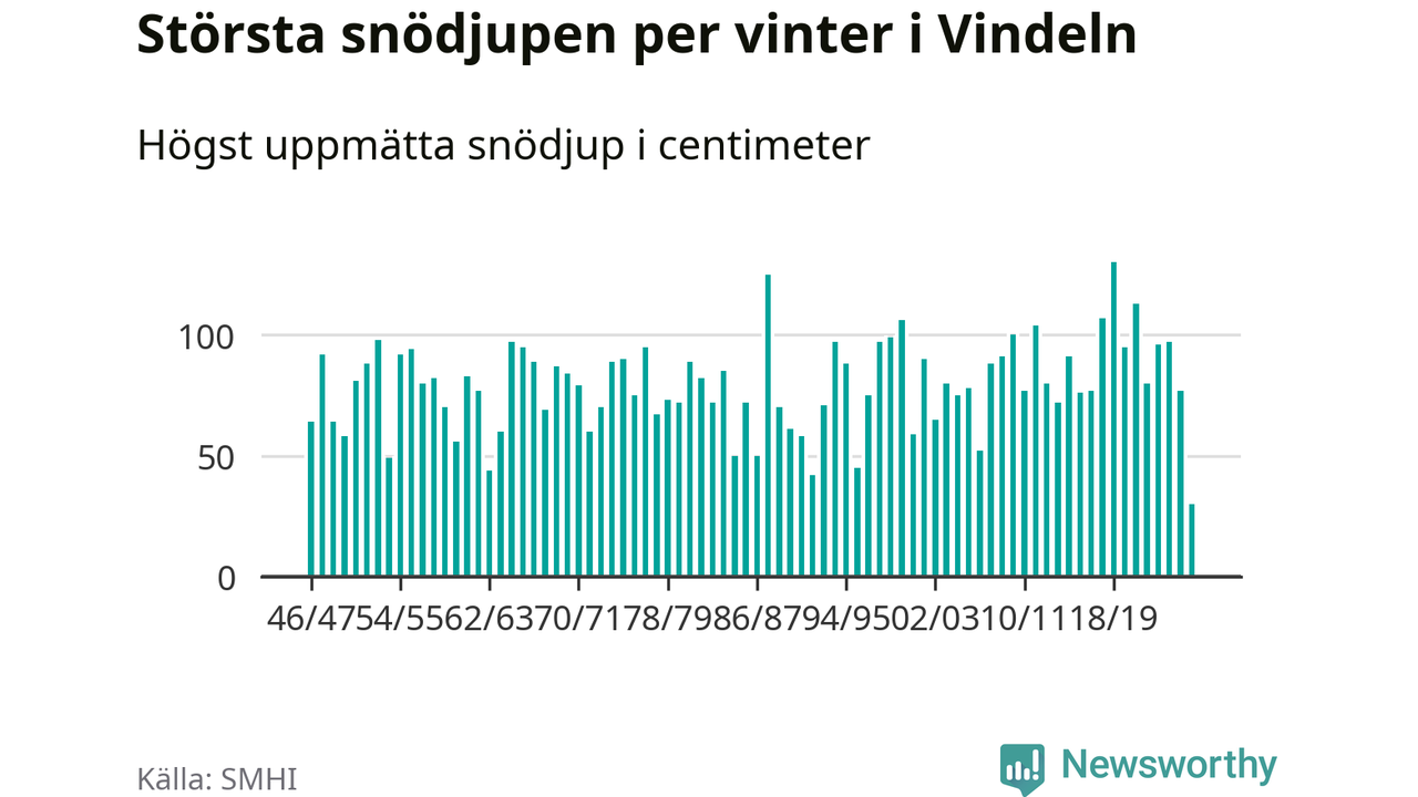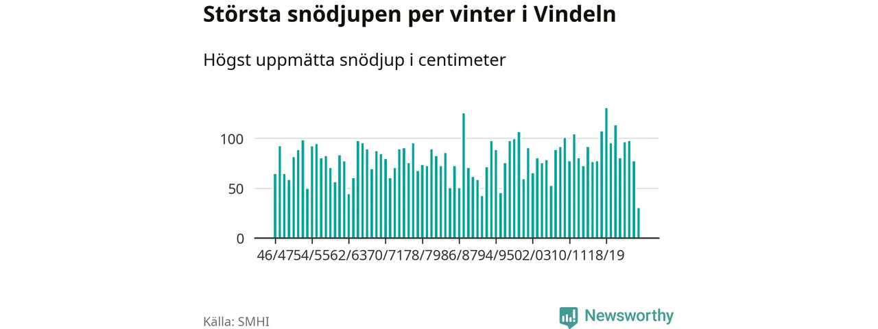 Men hur står sig det snödjupet historiskt sett? Newsworthy har tittat på det största snödjup som SMHI har uppmätt i Vindelns kommun varje år sedan vintern 1946/47 – och hittills tar sig årets vinter inte in bland de 25 vintrarna med störst uppmätt snödjup i kommunen.