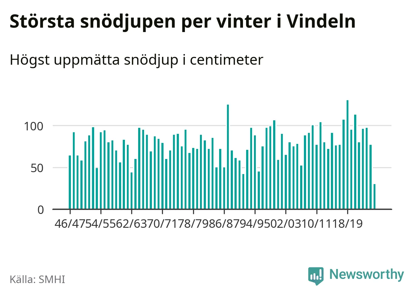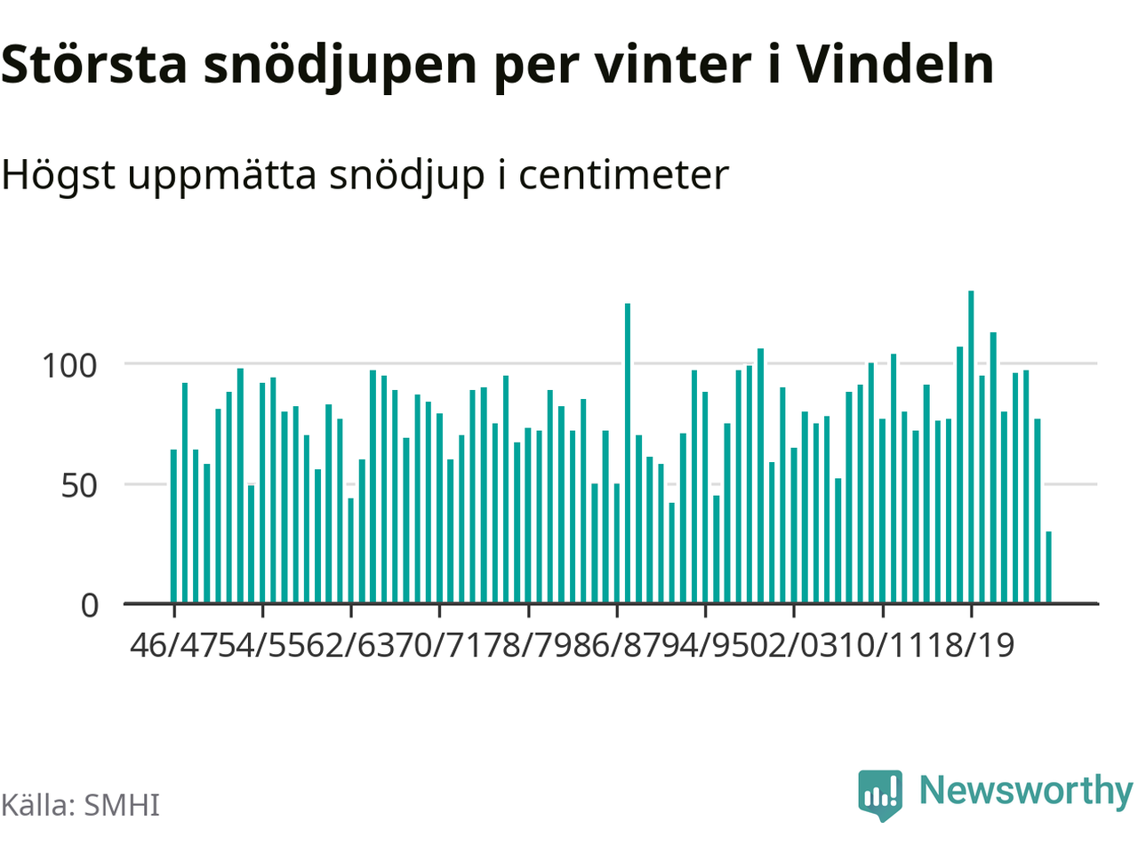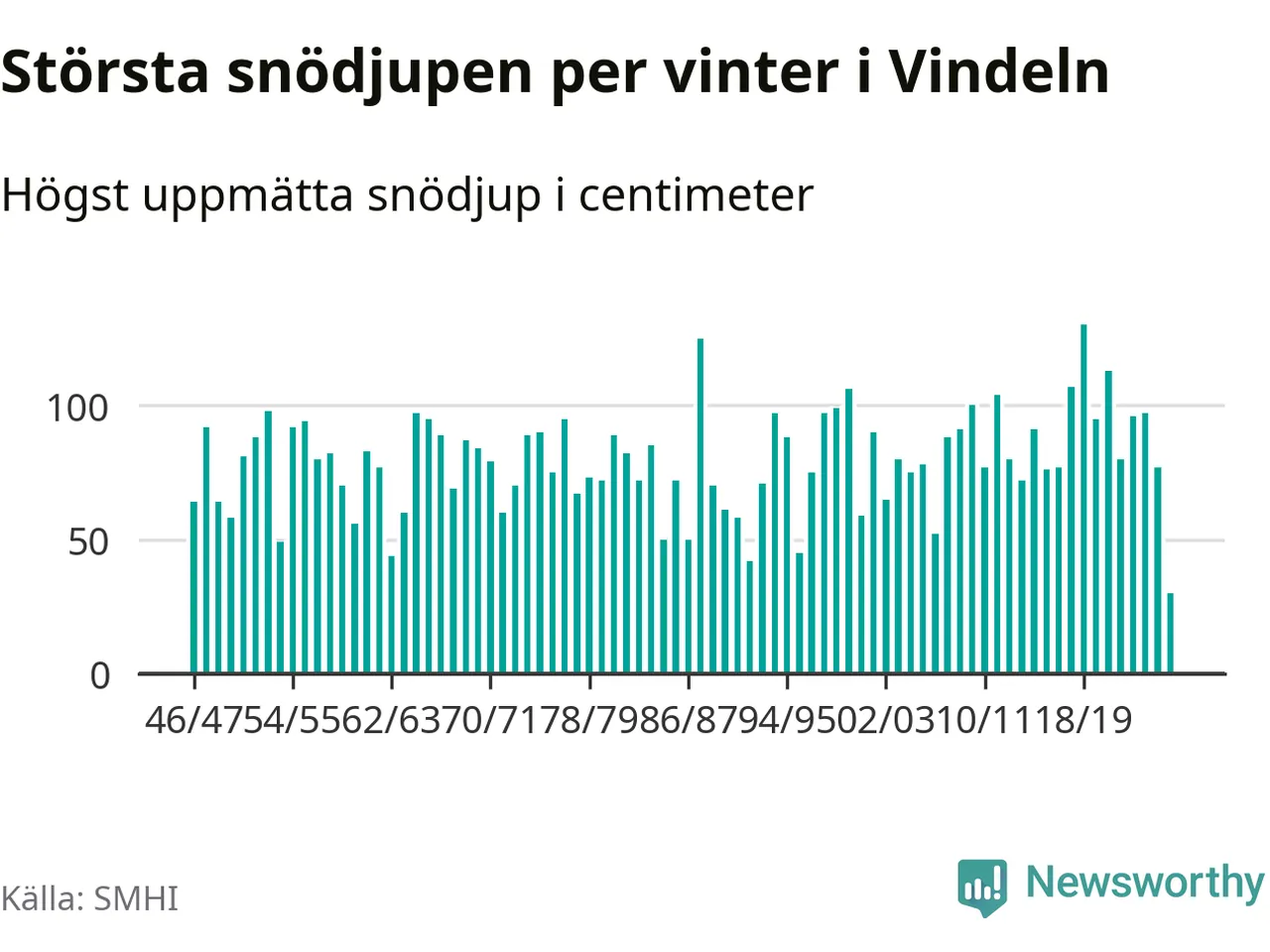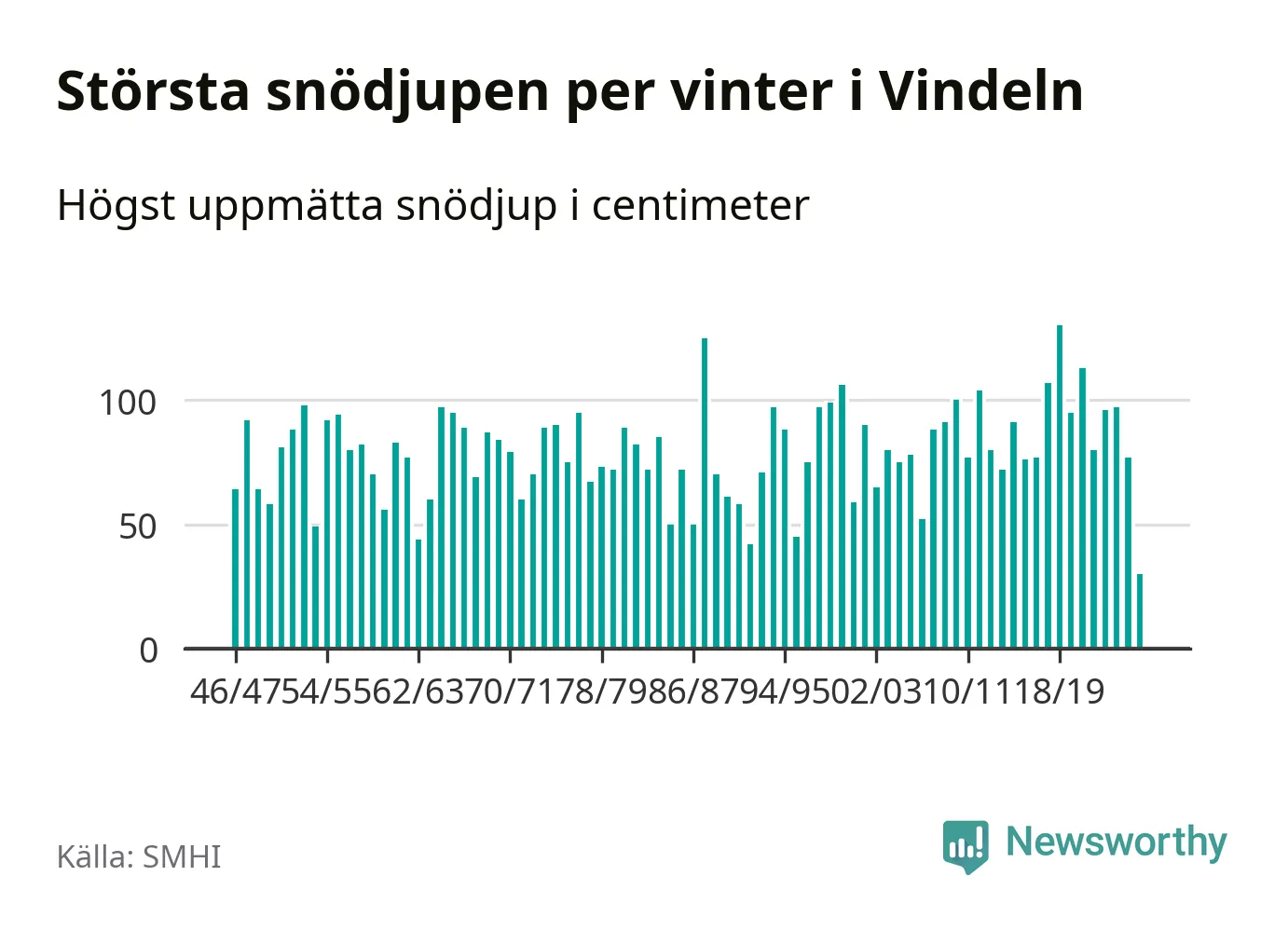 Men hur står sig det snödjupet historiskt sett? Newsworthy har tittat på det största snödjup som SMHI har uppmätt i Vindelns kommun varje år sedan vintern 1946/47 – och hittills tar sig årets vinter inte in bland de 25 vintrarna med störst uppmätt snödjup i kommunen.