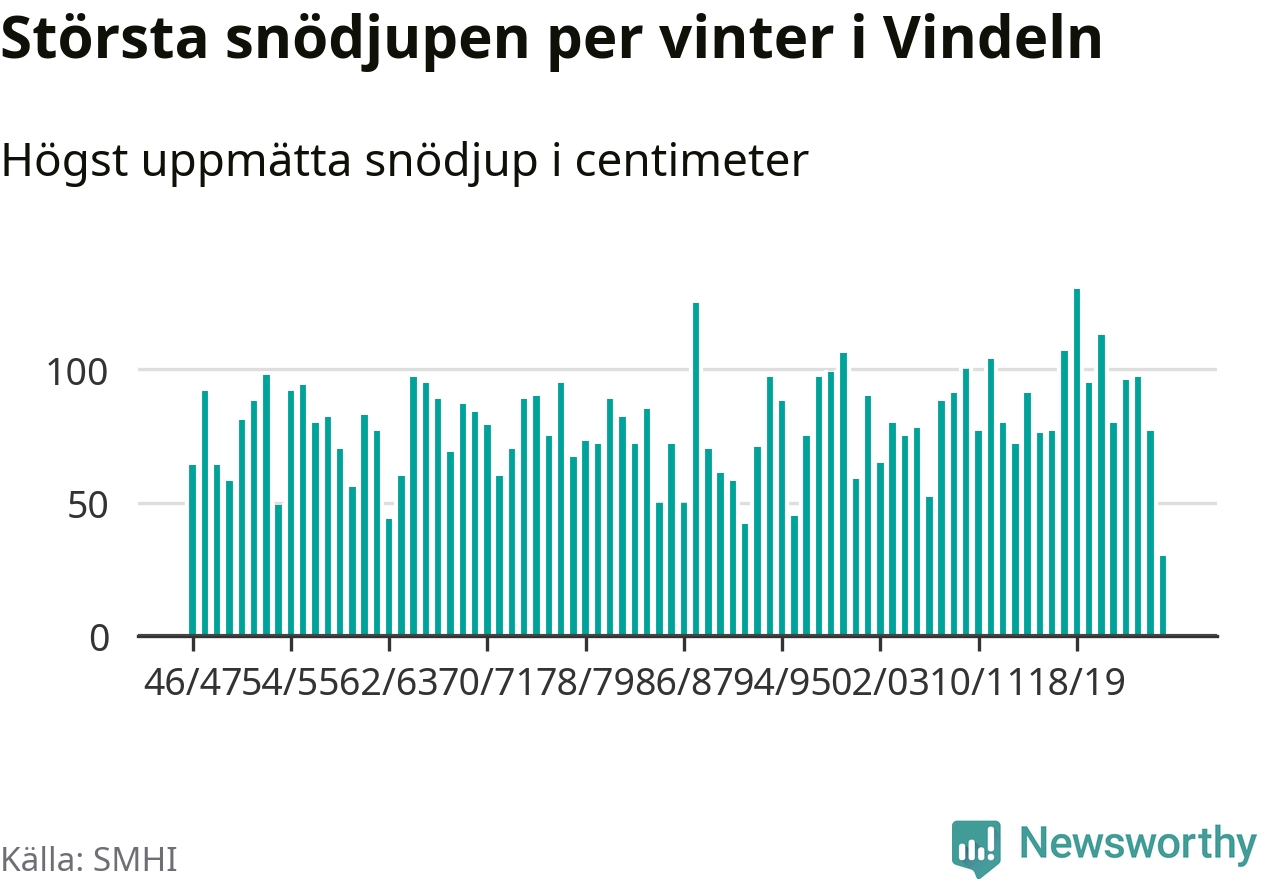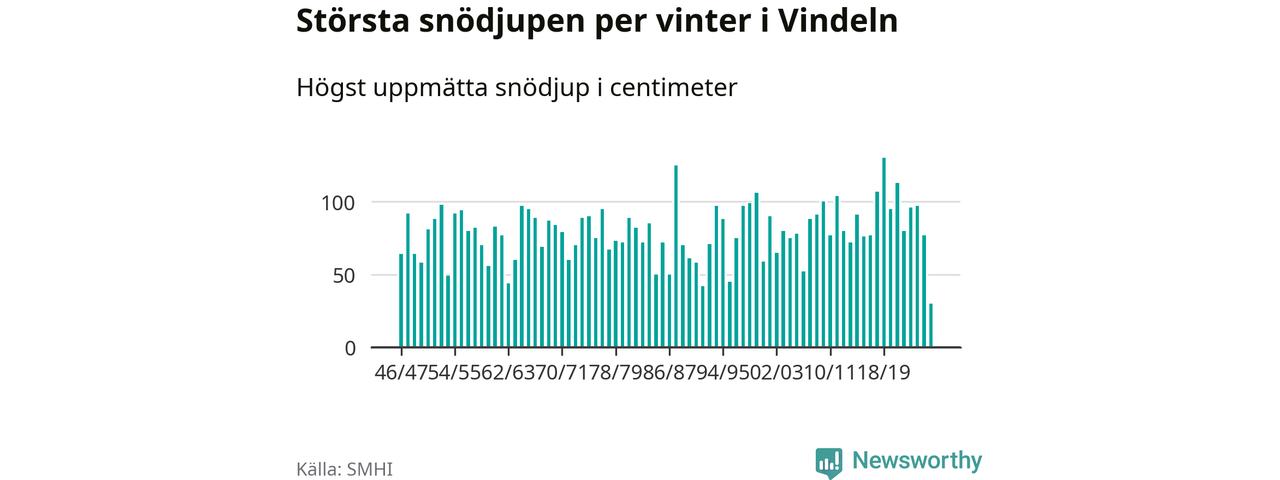 Det största snödjupet i kommunen uppmättes i mars 2019, 130 centimeter vid Vindeln-Sunnansjönäs. Årets hittills högsta notering är alltså 100 centimeter lägre.