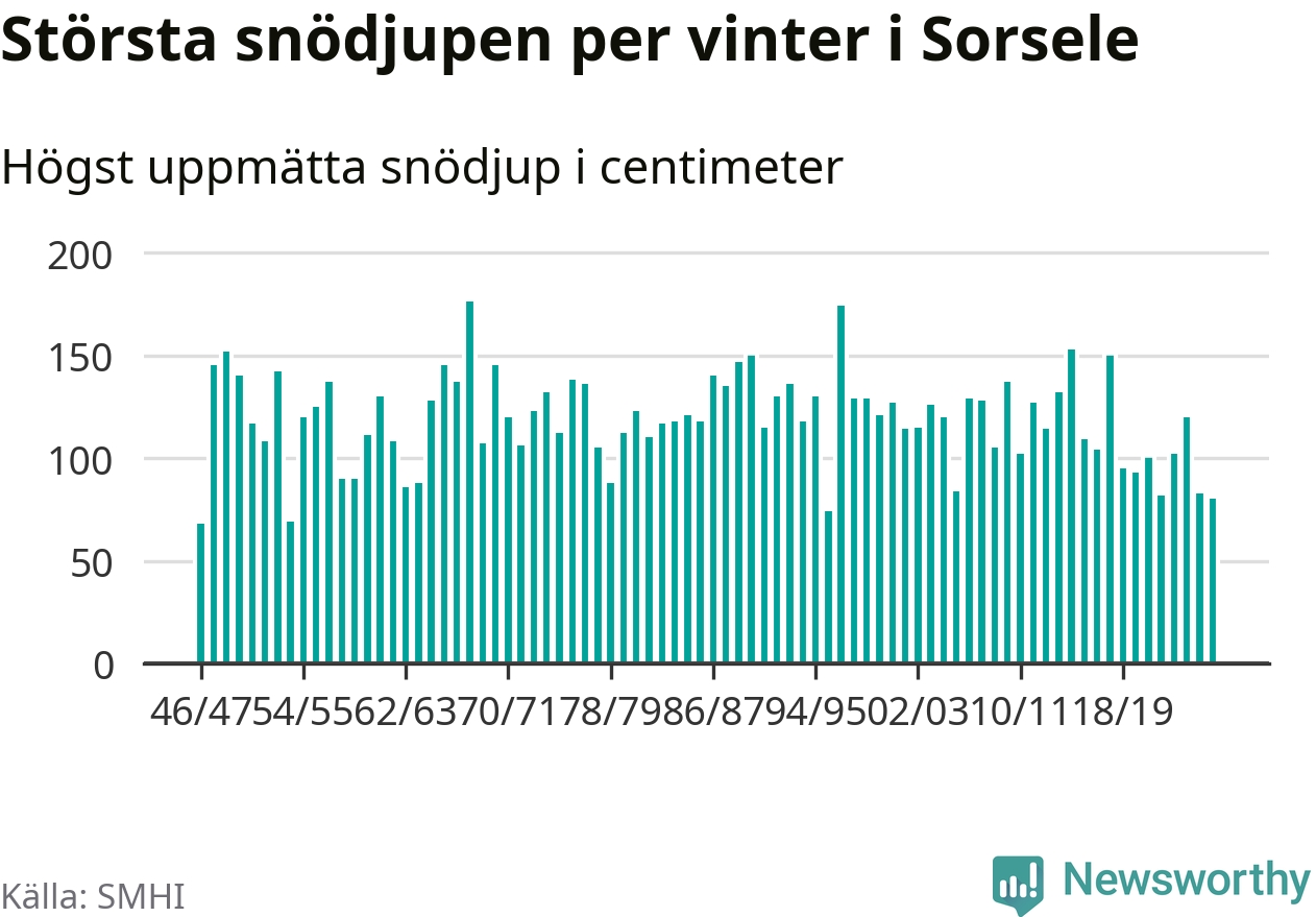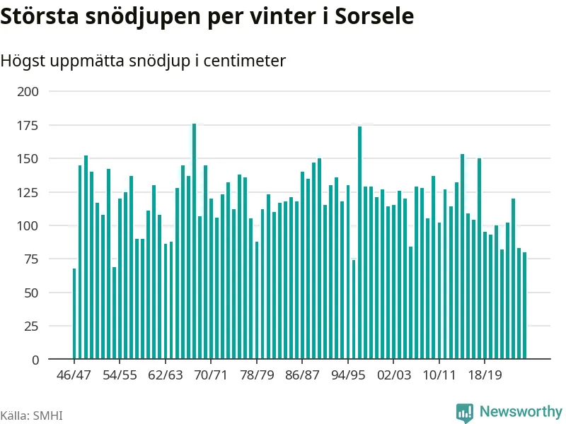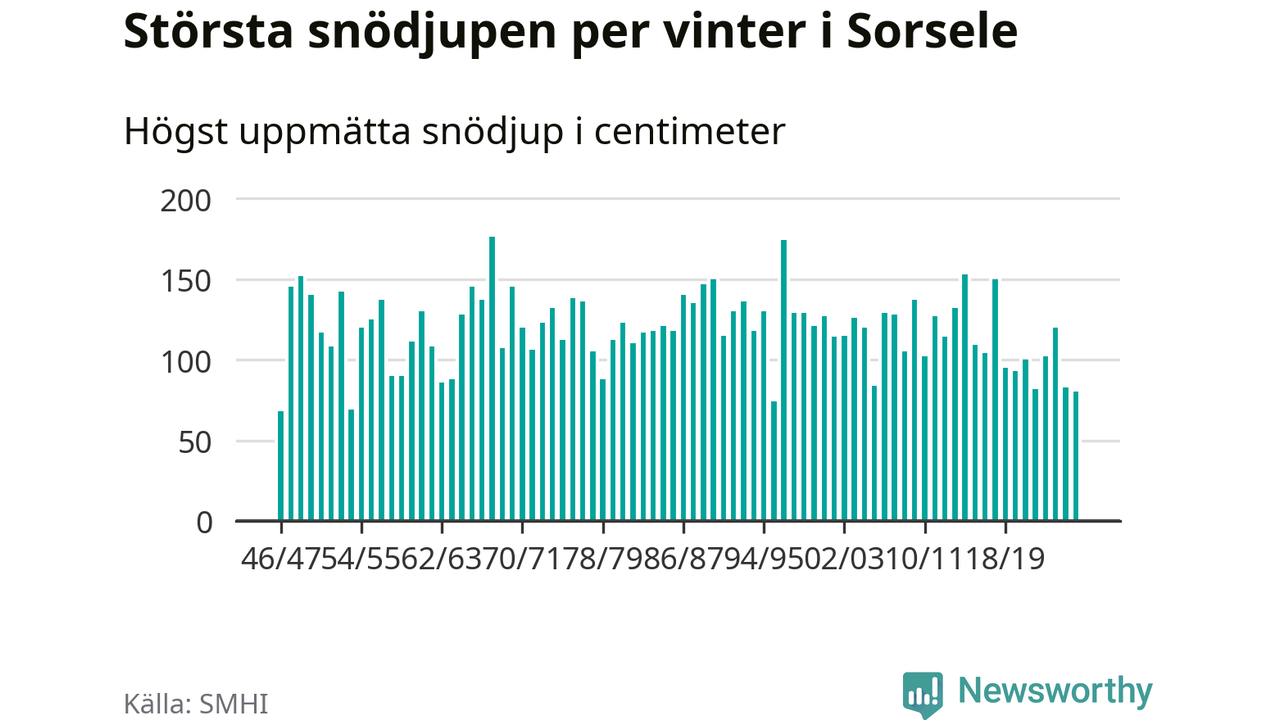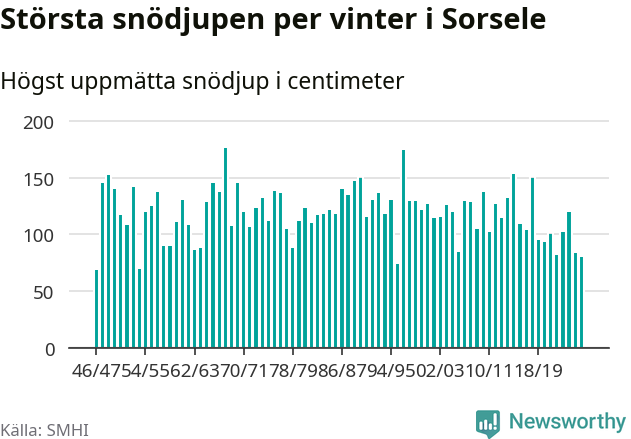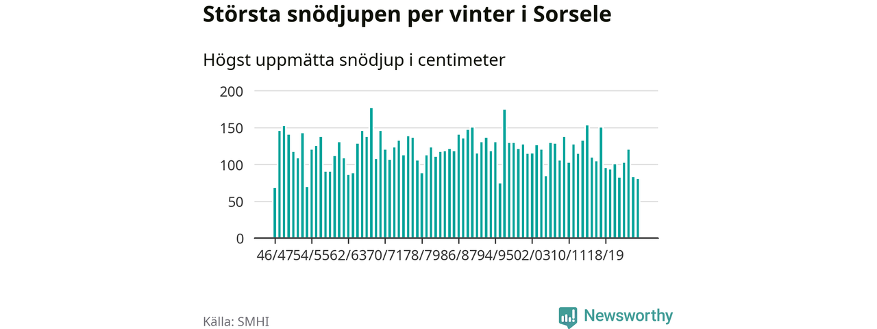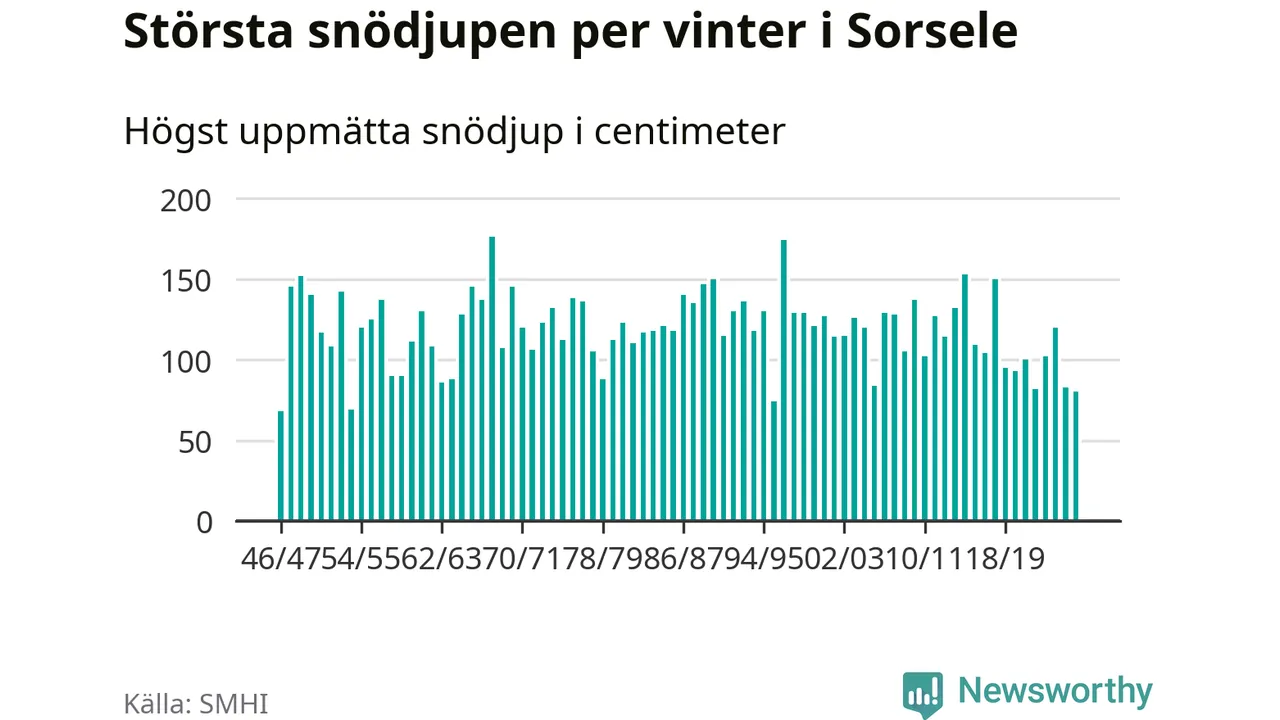Men hur står sig det snödjupet historiskt sett? Newsworthy har tittat på det största snödjup som SMHI har uppmätt i Sorsele kommun varje år sedan vintern 1946/47 – och hittills tar sig årets vinter inte in bland de 25 vintrarna med störst uppmätt snödjup i kommunen.
