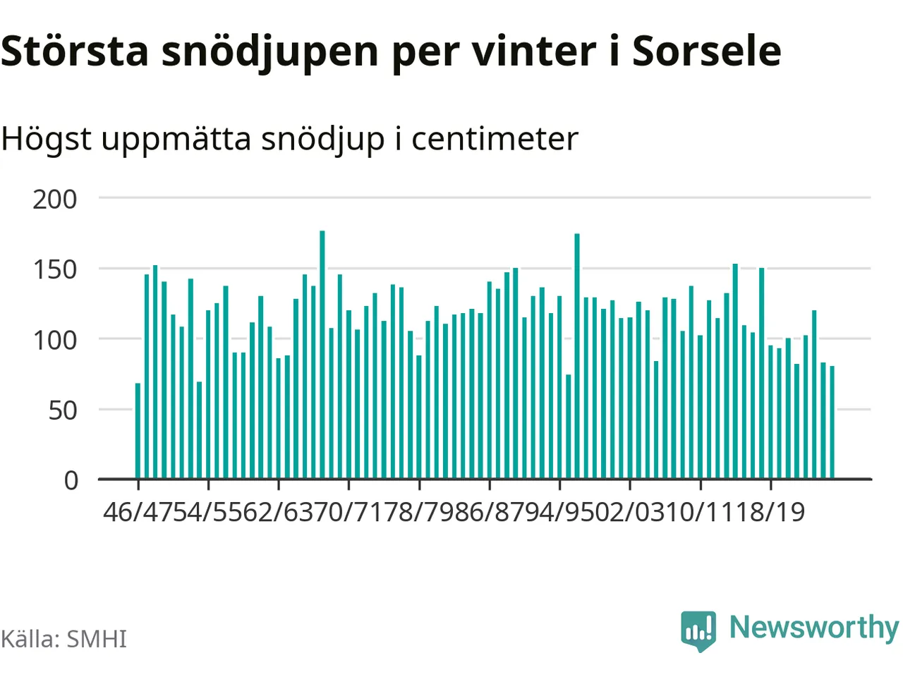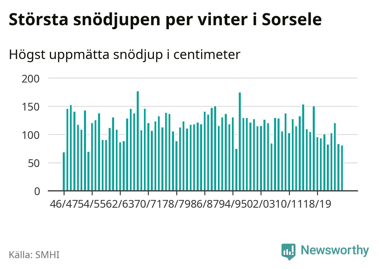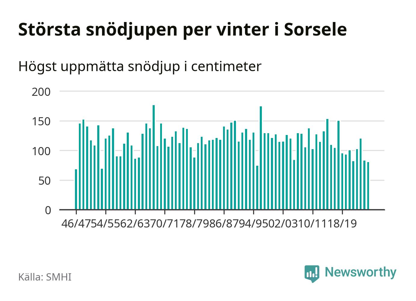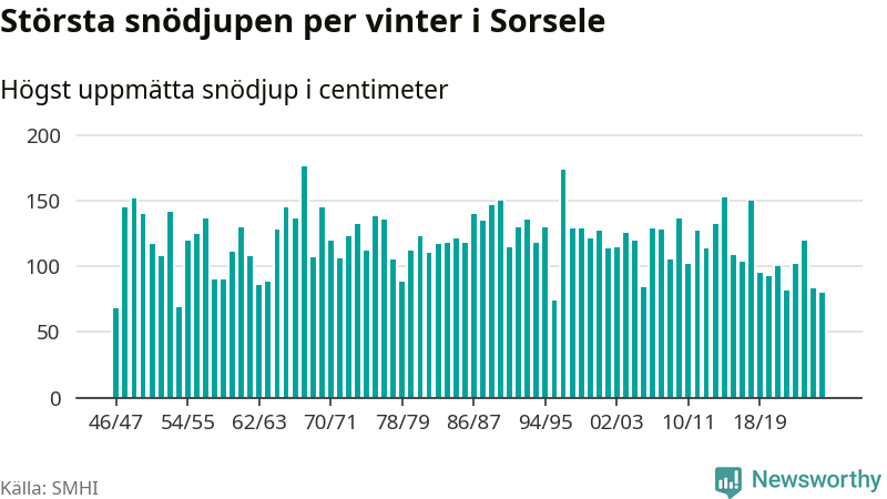 Men hur står sig det snödjupet historiskt sett? Newsworthy har tittat på det största snödjup som SMHI har uppmätt i Sorsele kommun varje år sedan vintern 1946/47 – och hittills tar sig årets vinter inte in bland de 25 vintrarna med störst uppmätt snödjup i kommunen.