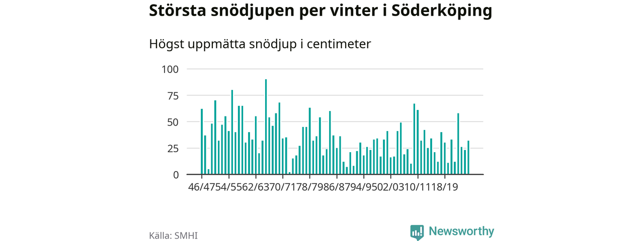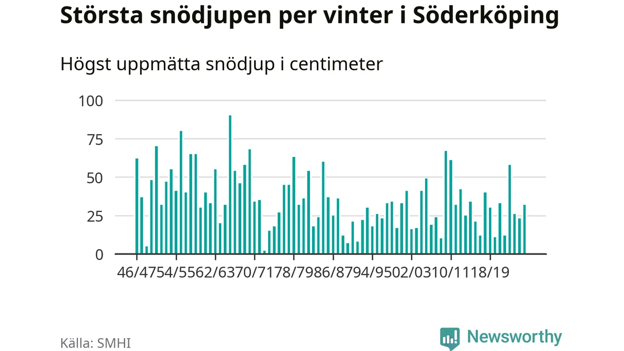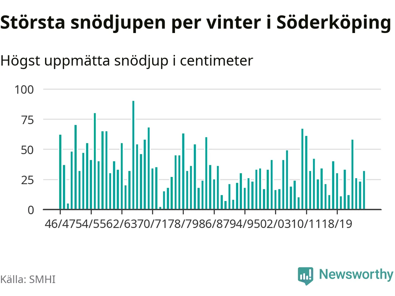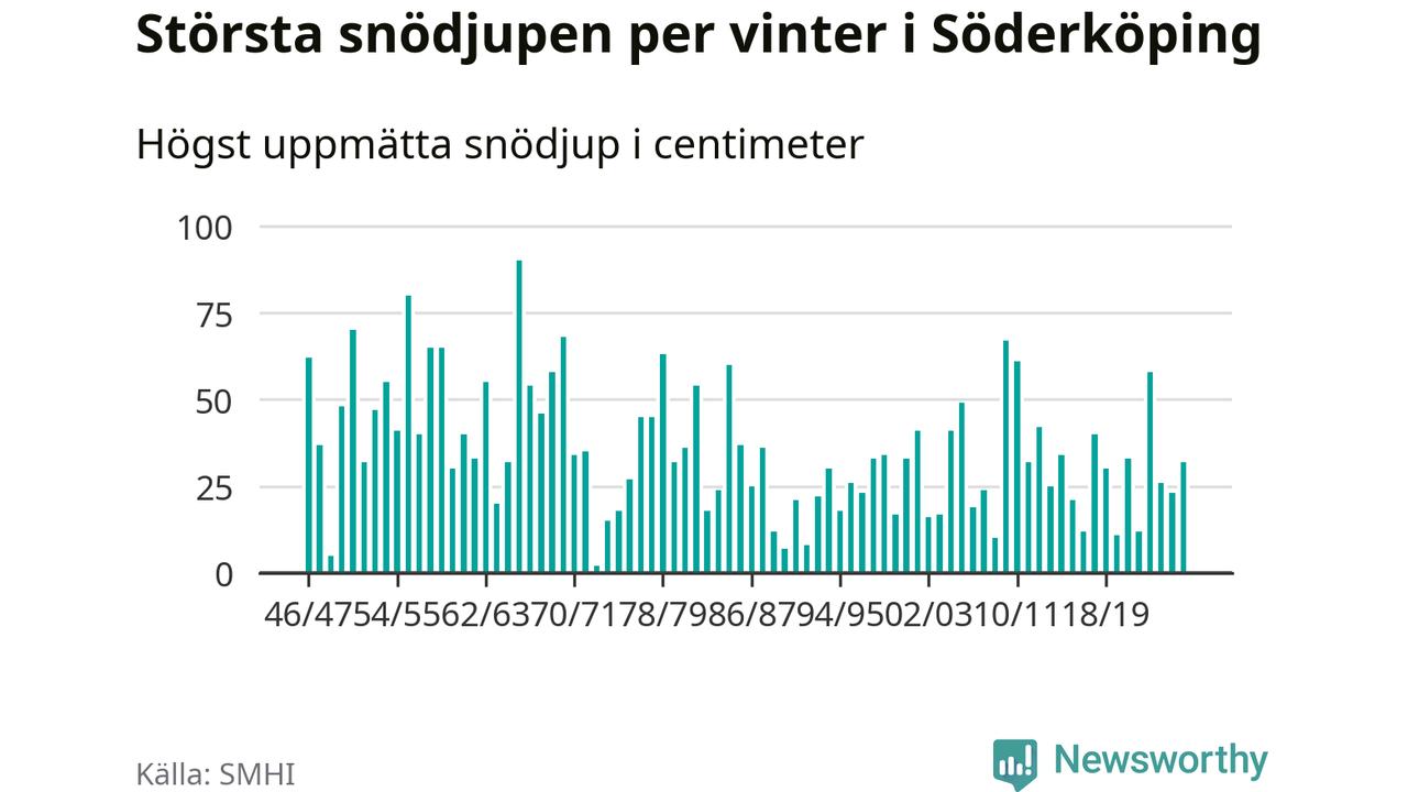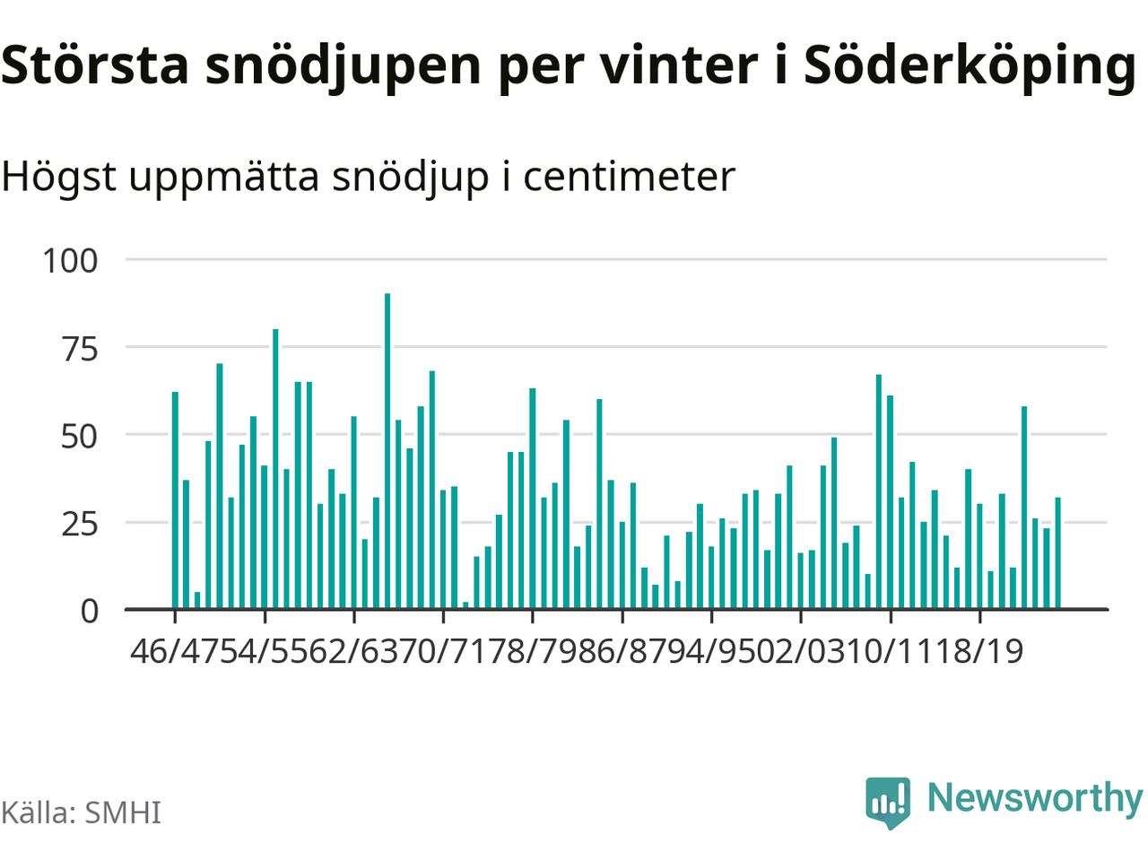 Men hur står sig det snödjupet historiskt sett? Newsworthy har tittat på det största snödjup som SMHI har uppmätt i Söderköpings kommun varje år sedan vintern 1946/47 – och hittills tar sig årets vinter inte in bland de 25 vintrarna med störst uppmätt snödjup i kommunen.
