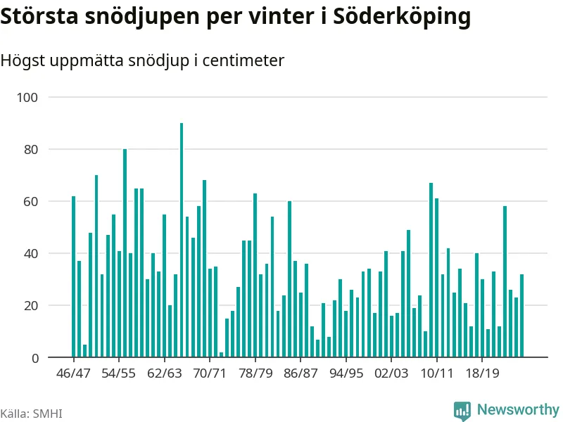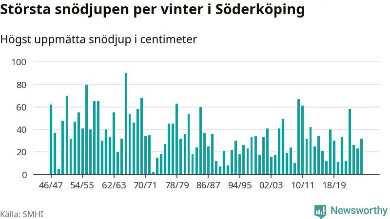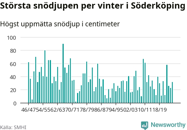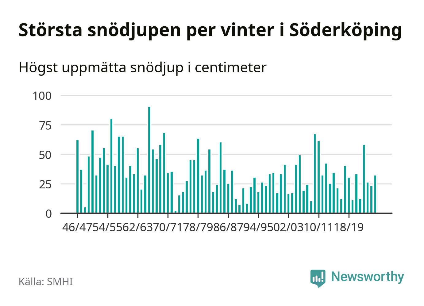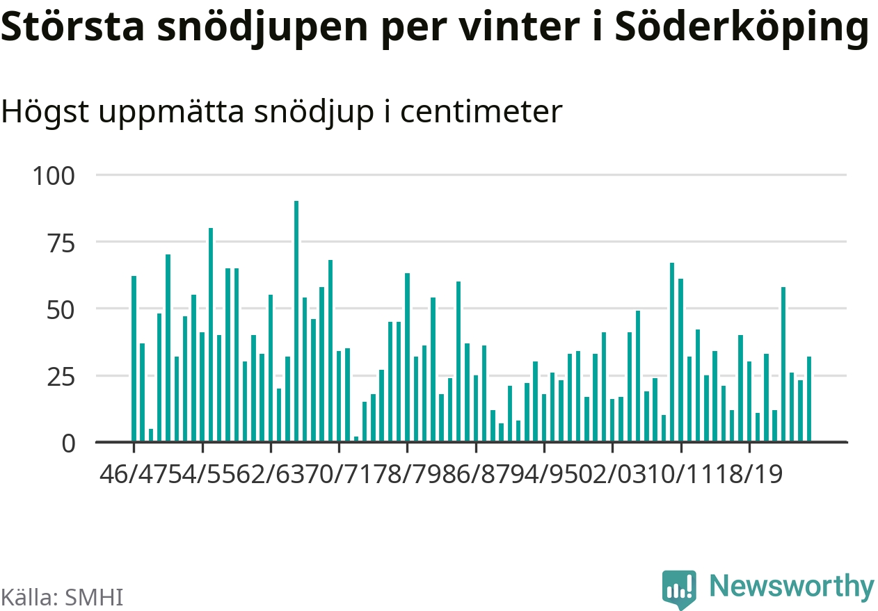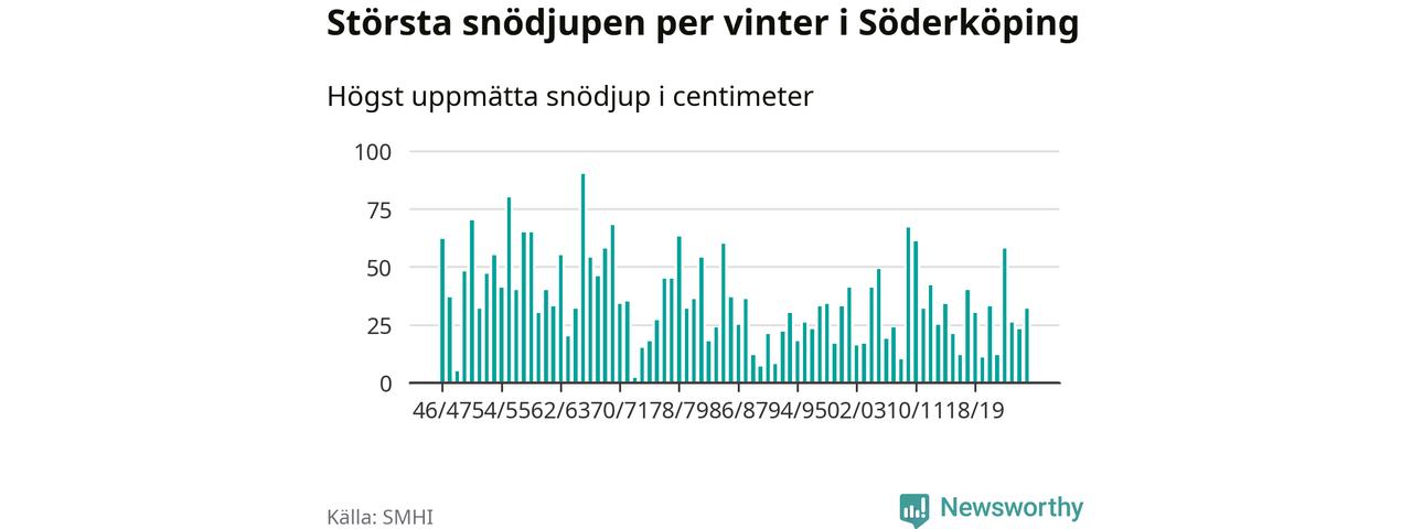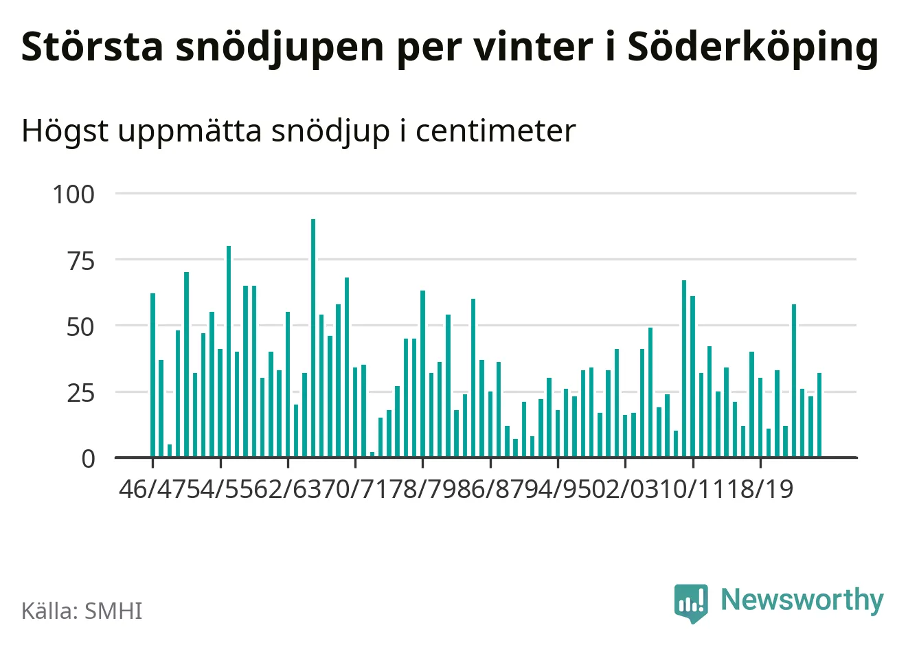Men hur står sig det snödjupet historiskt sett? Newsworthy har tittat på det största snödjup som SMHI har uppmätt i Söderköpings kommun varje år sedan vintern 1946/47 – och hittills tar sig årets vinter inte in bland de 25 vintrarna med störst uppmätt snödjup i kommunen.