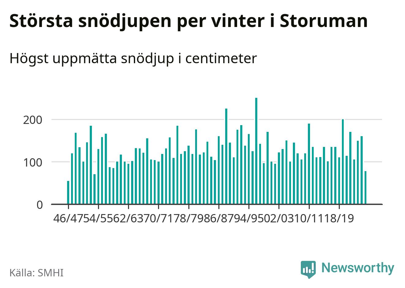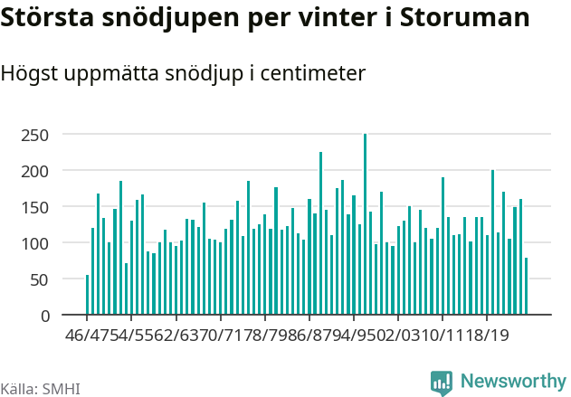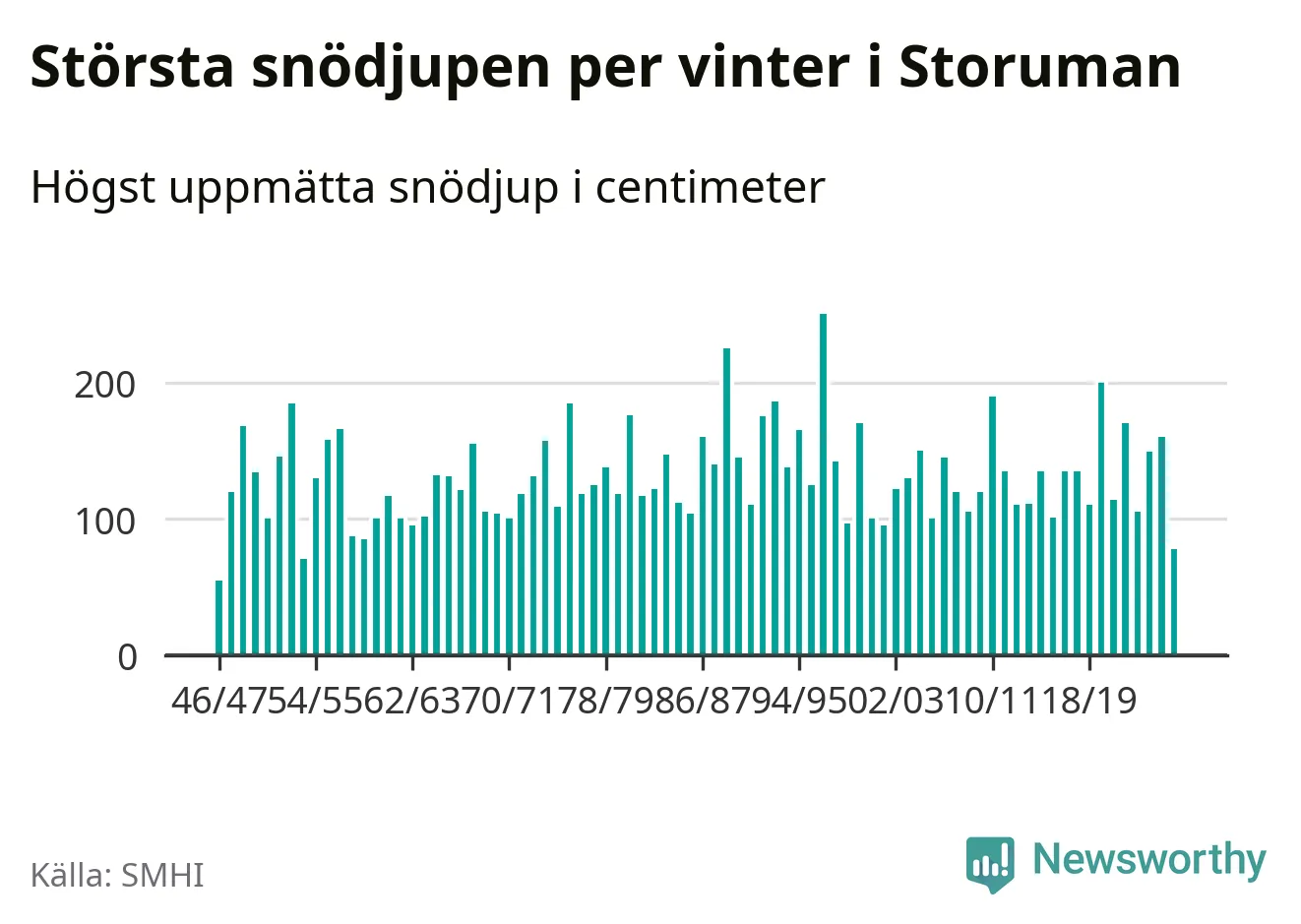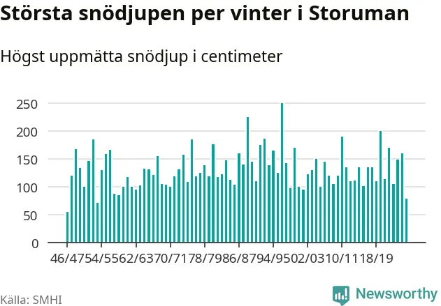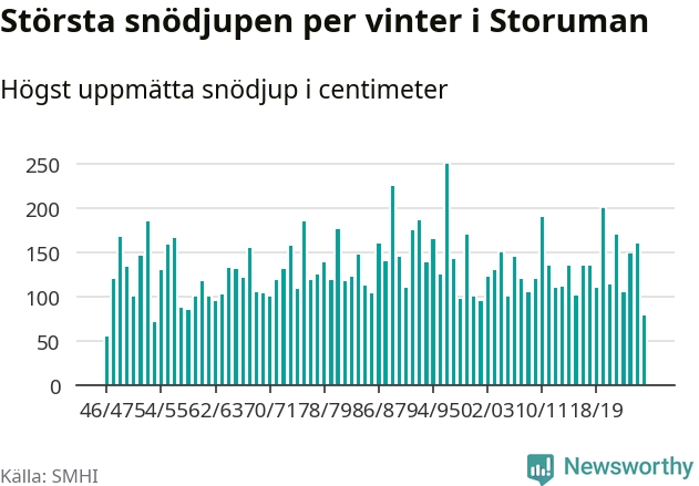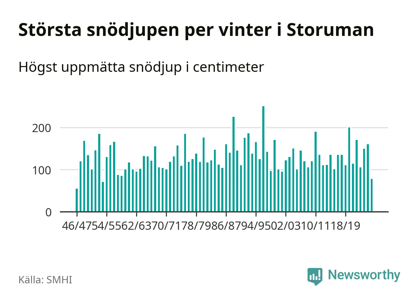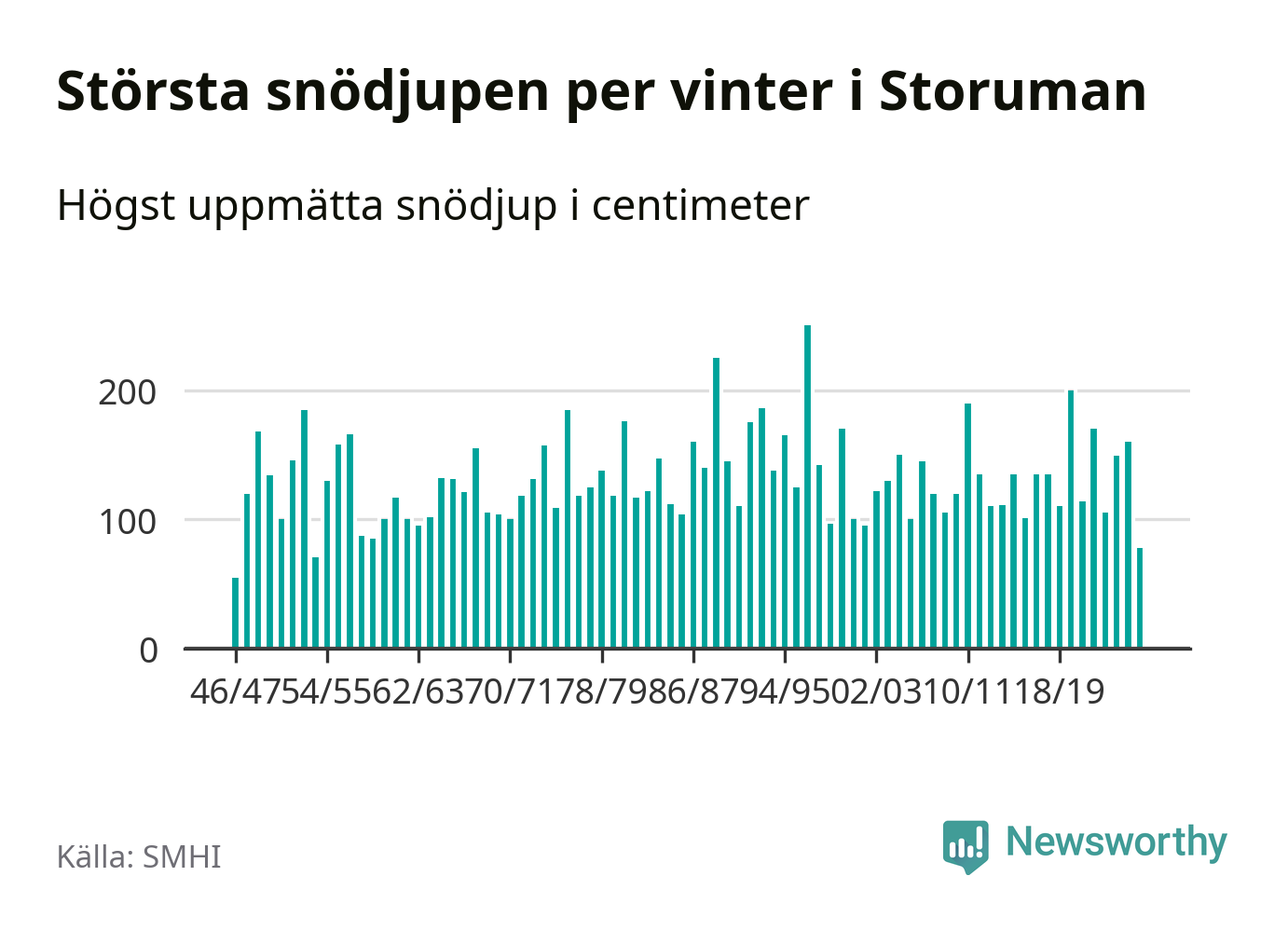 Men hur står sig det snödjupet historiskt sett? Newsworthy har tittat på det största snödjup som SMHI har uppmätt i Storumans kommun varje år sedan vintern 1946/47 – och hittills tar sig årets vinter inte in bland de 25 vintrarna med störst uppmätt snödjup i kommunen.