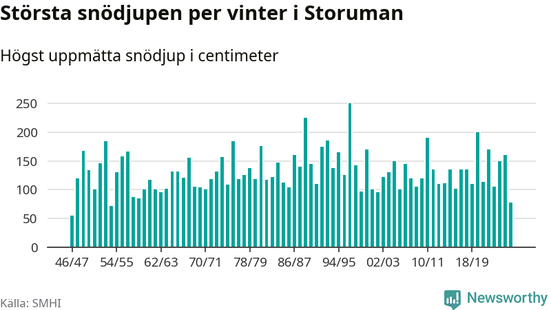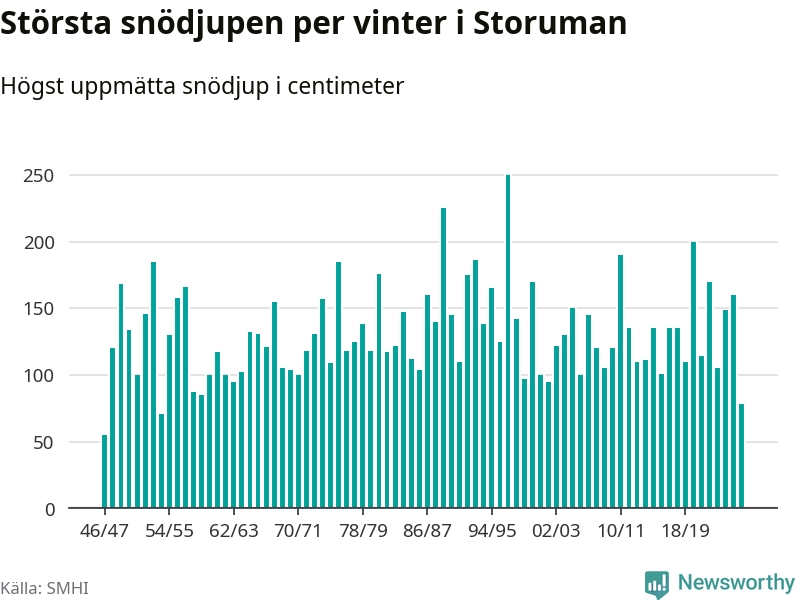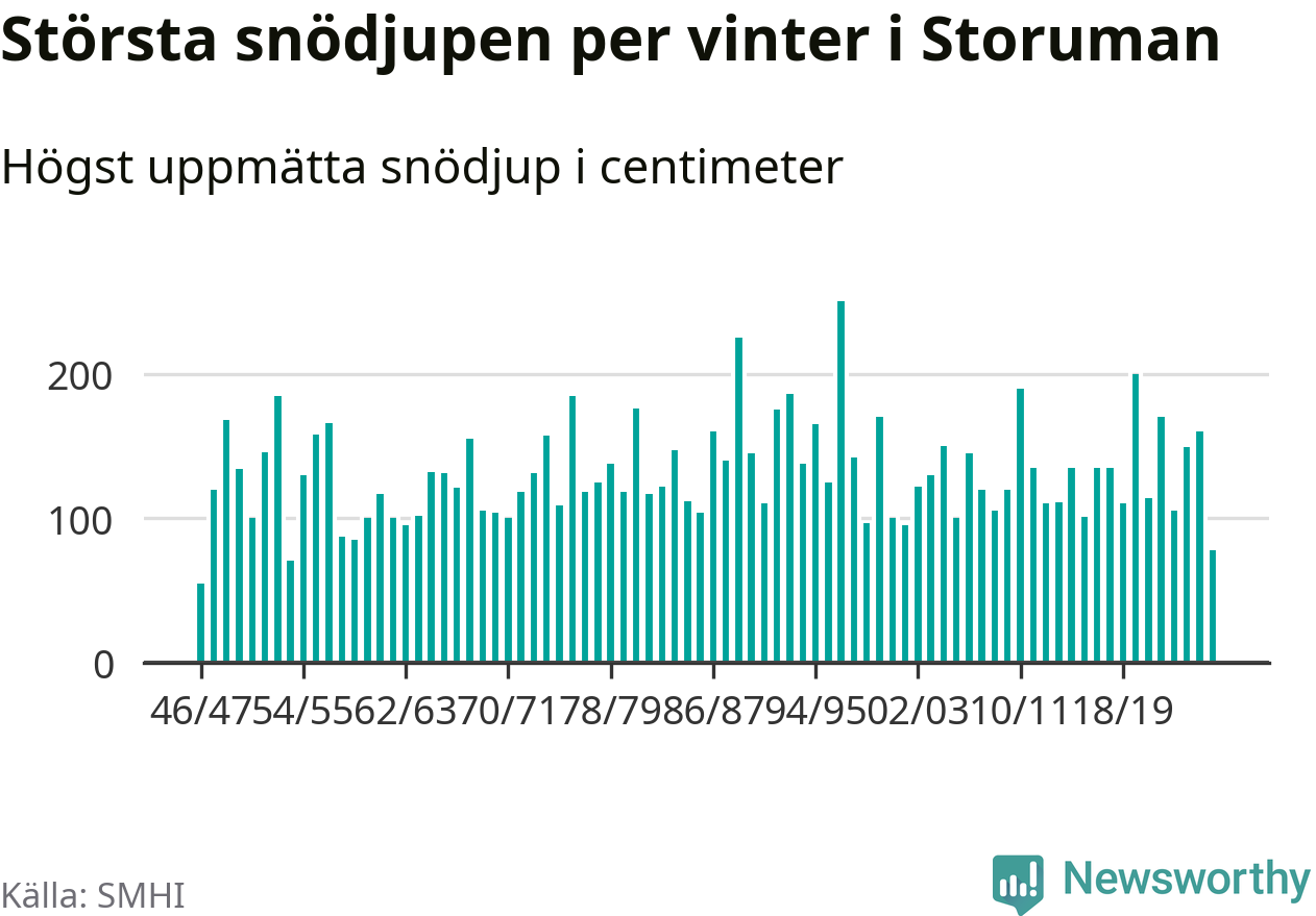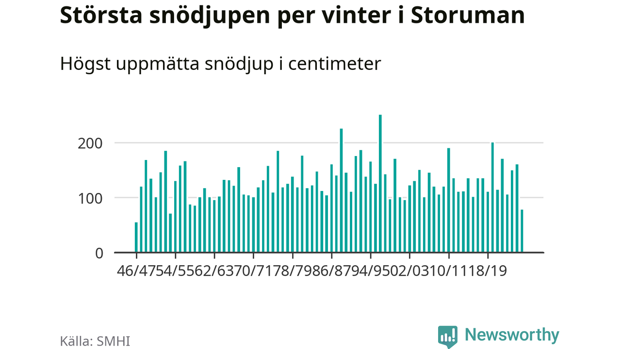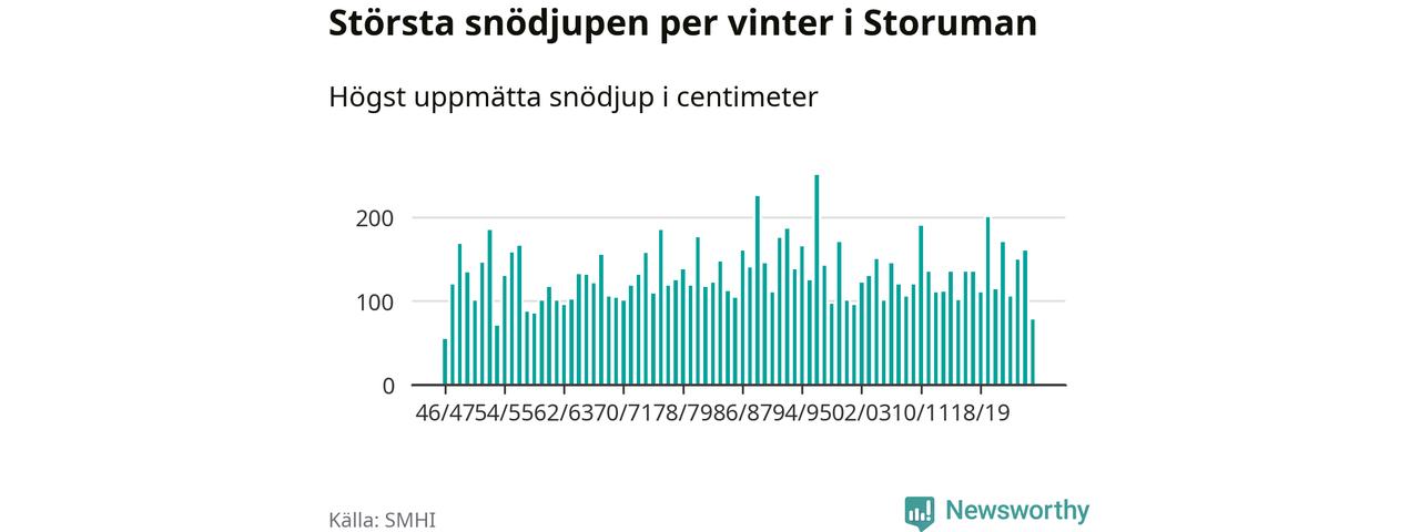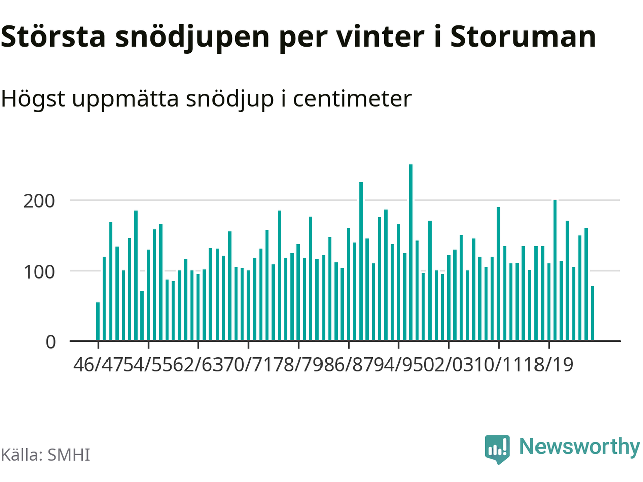 Men hur står sig det snödjupet historiskt sett? Newsworthy har tittat på det största snödjup som SMHI har uppmätt i Storumans kommun varje år sedan vintern 1946/47 – och hittills tar sig årets vinter inte in bland de 25 vintrarna med störst uppmätt snödjup i kommunen.