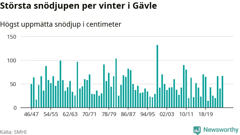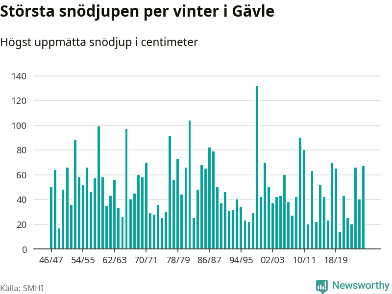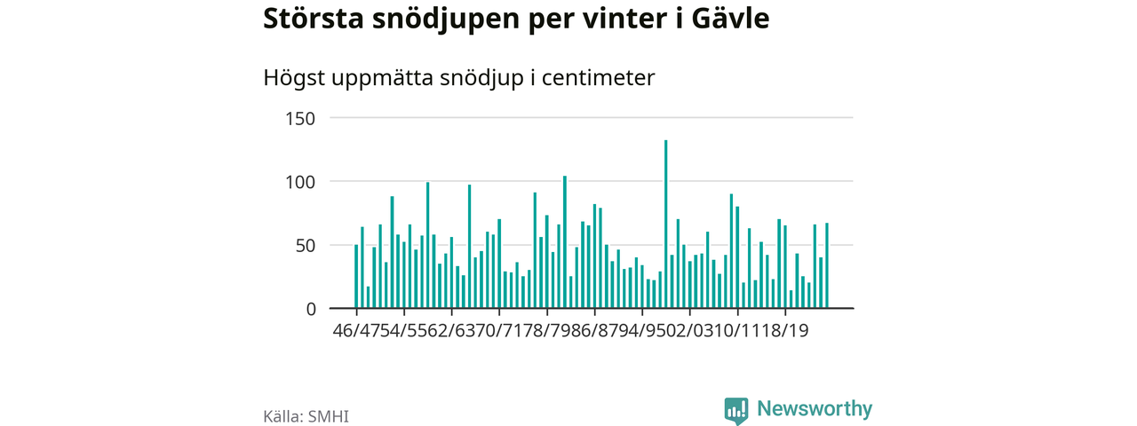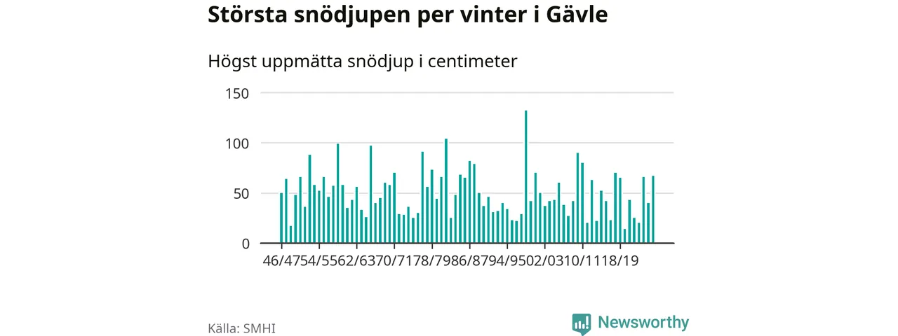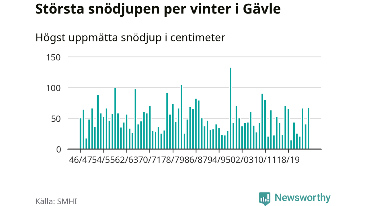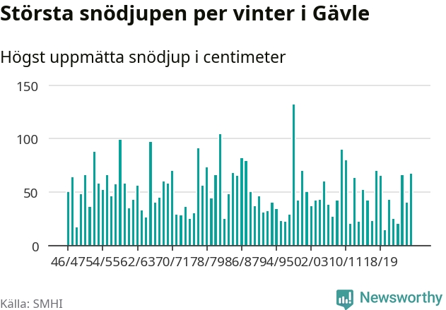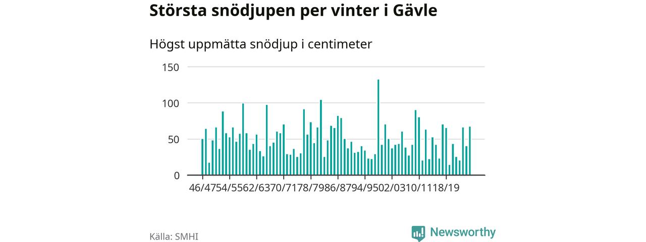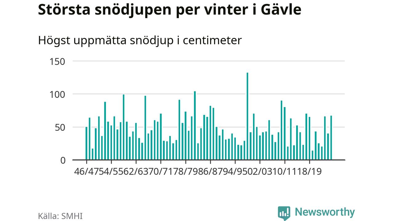 Men hur står sig det snödjupet historiskt sett? Newsworthy har tittat på det största snödjup som SMHI har uppmätt i Gävle kommun varje år sedan vintern 1946/47. 15 vintrar har det uppmätts större snödjup.