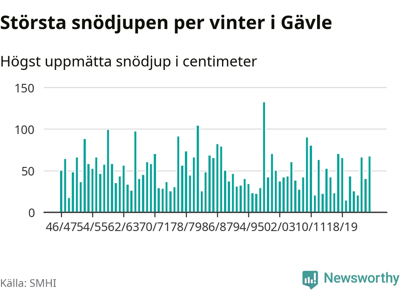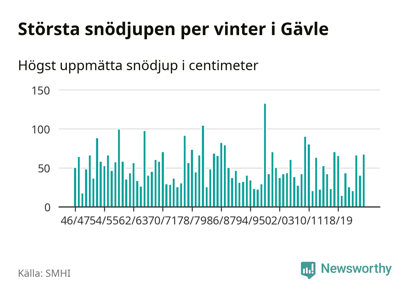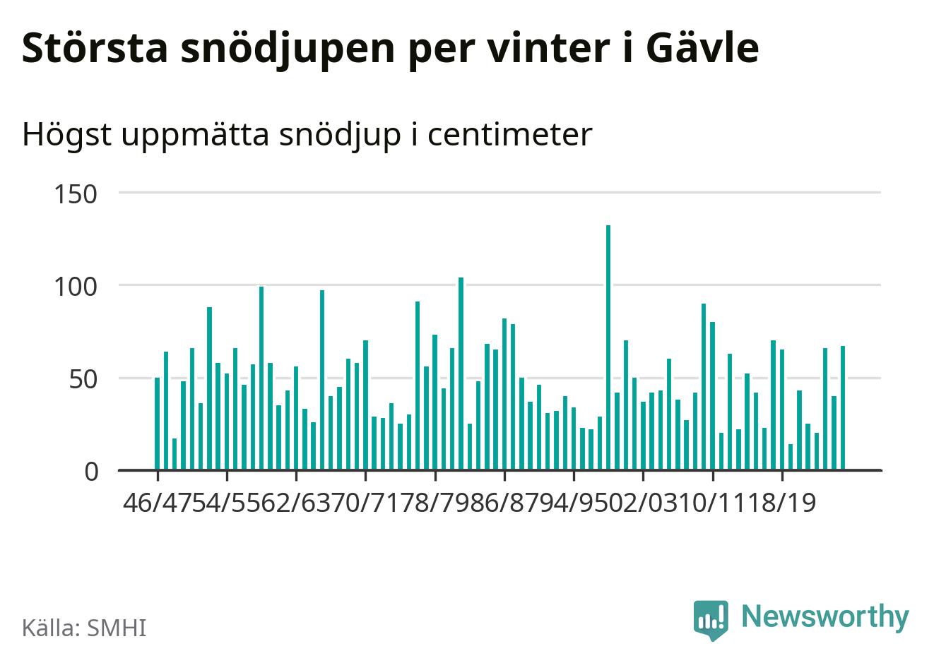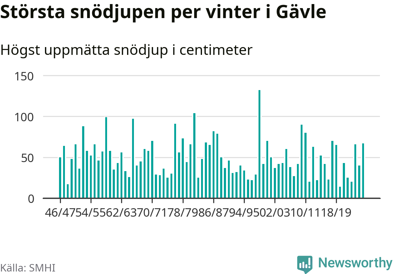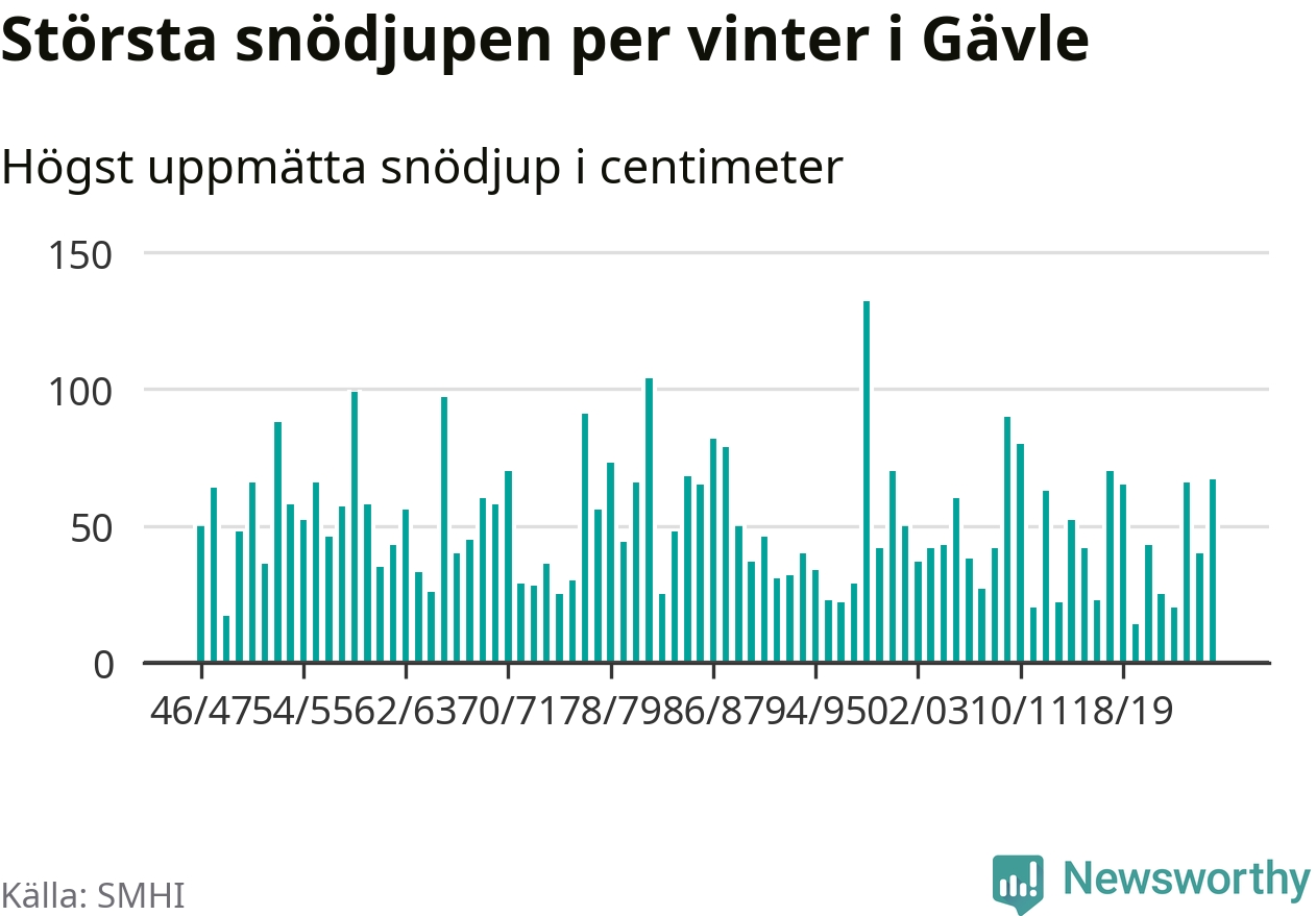 Men hur står sig det snödjupet historiskt sett? Newsworthy har tittat på det största snödjup som SMHI har uppmätt i Gävle kommun varje år sedan vintern 1946/47. 15 vintrar har det uppmätts större snödjup.