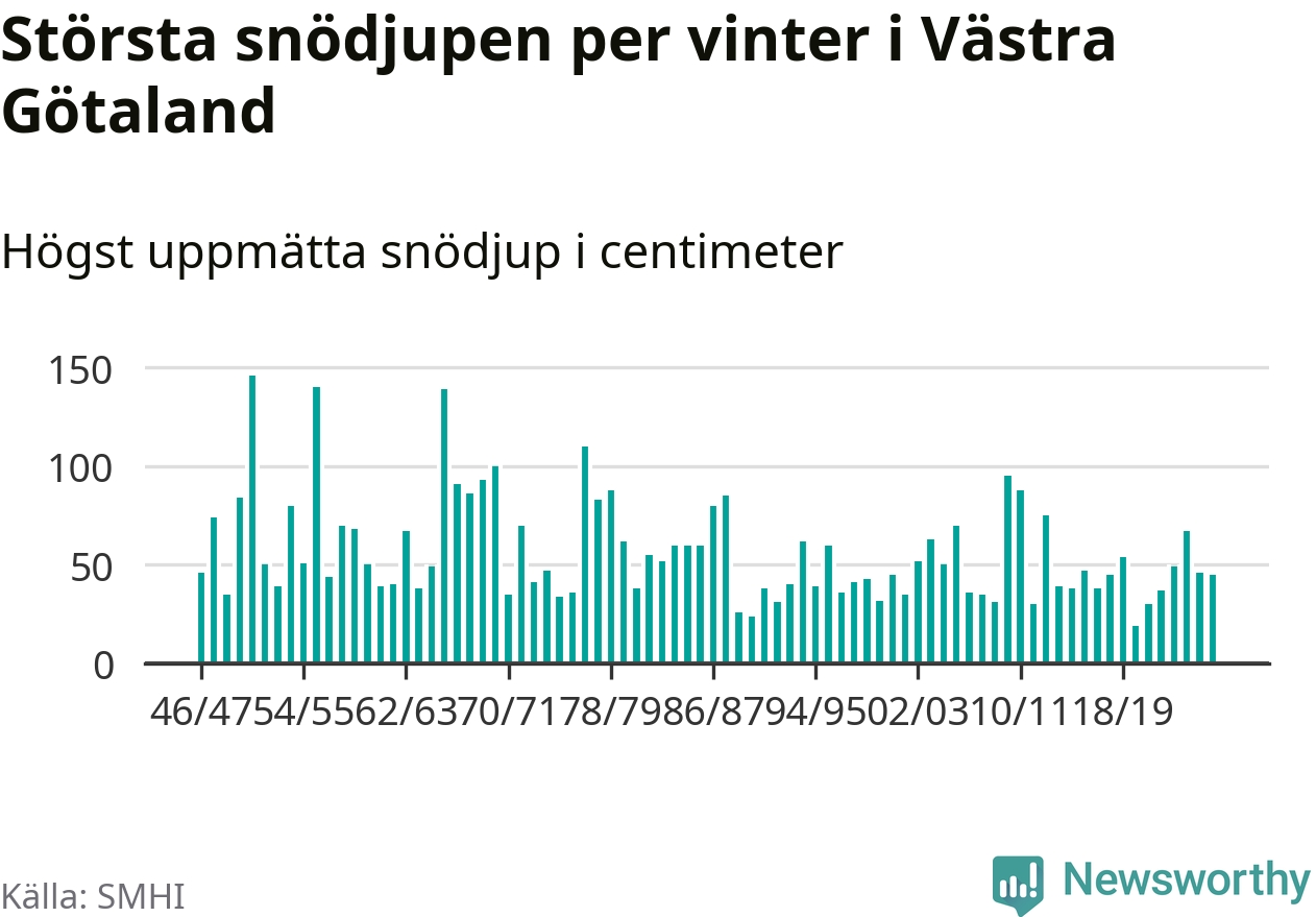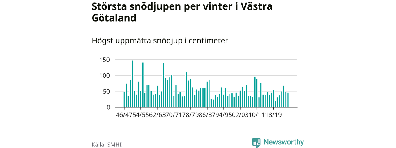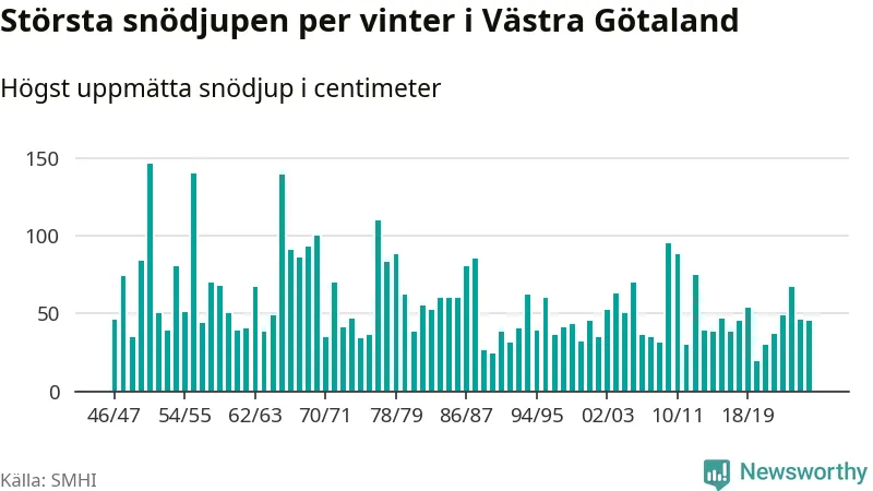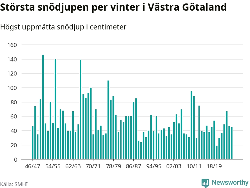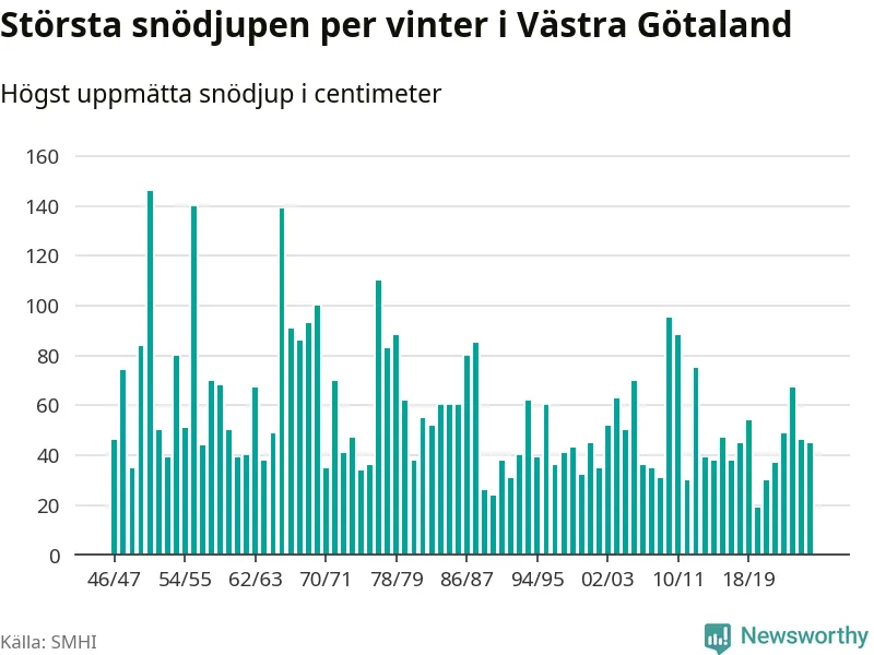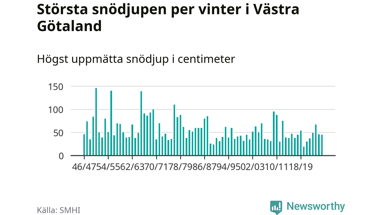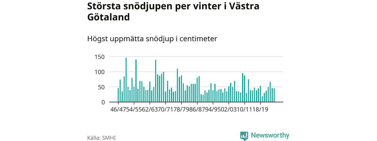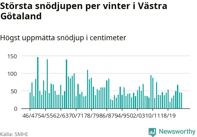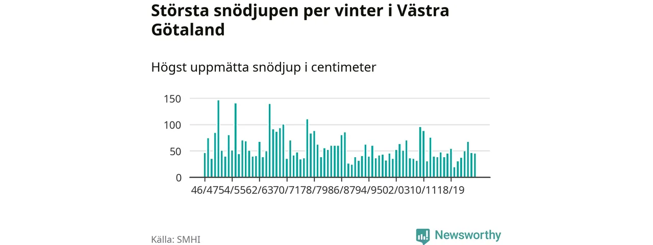 Men hur står sig det snödjupet historiskt sett? Newsworthy har tittat på det största snödjup som SMHI har uppmätt i Västra Götalands län varje år sedan vintern 1946/47 – och hittills tar sig årets vinter inte in bland de 25 vintrarna med störst uppmätt snödjup i länet.