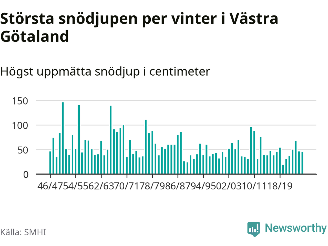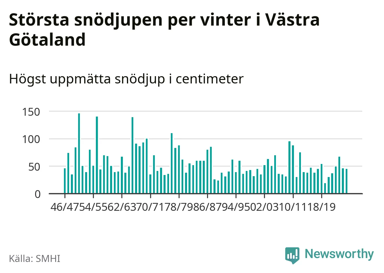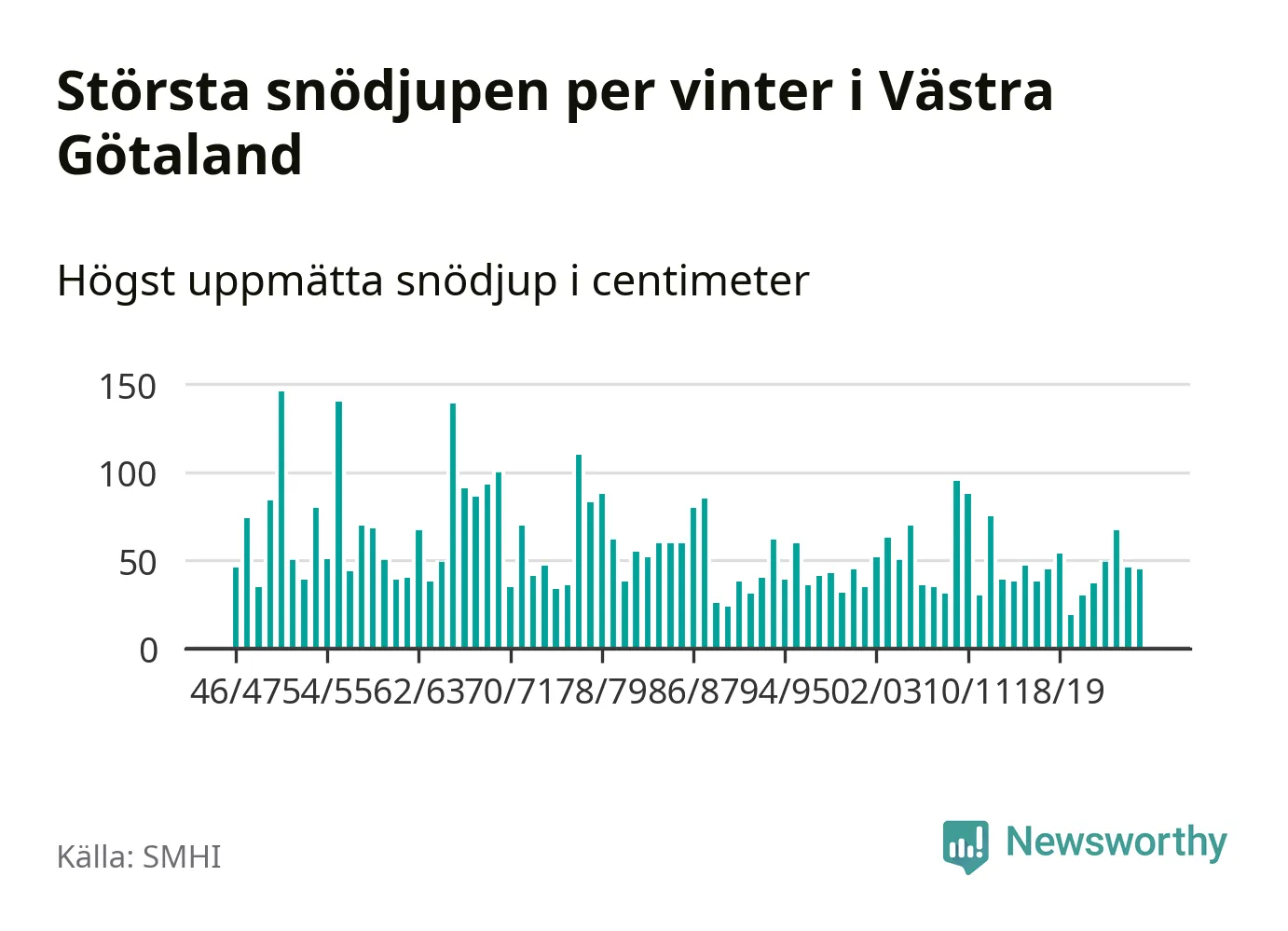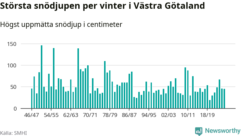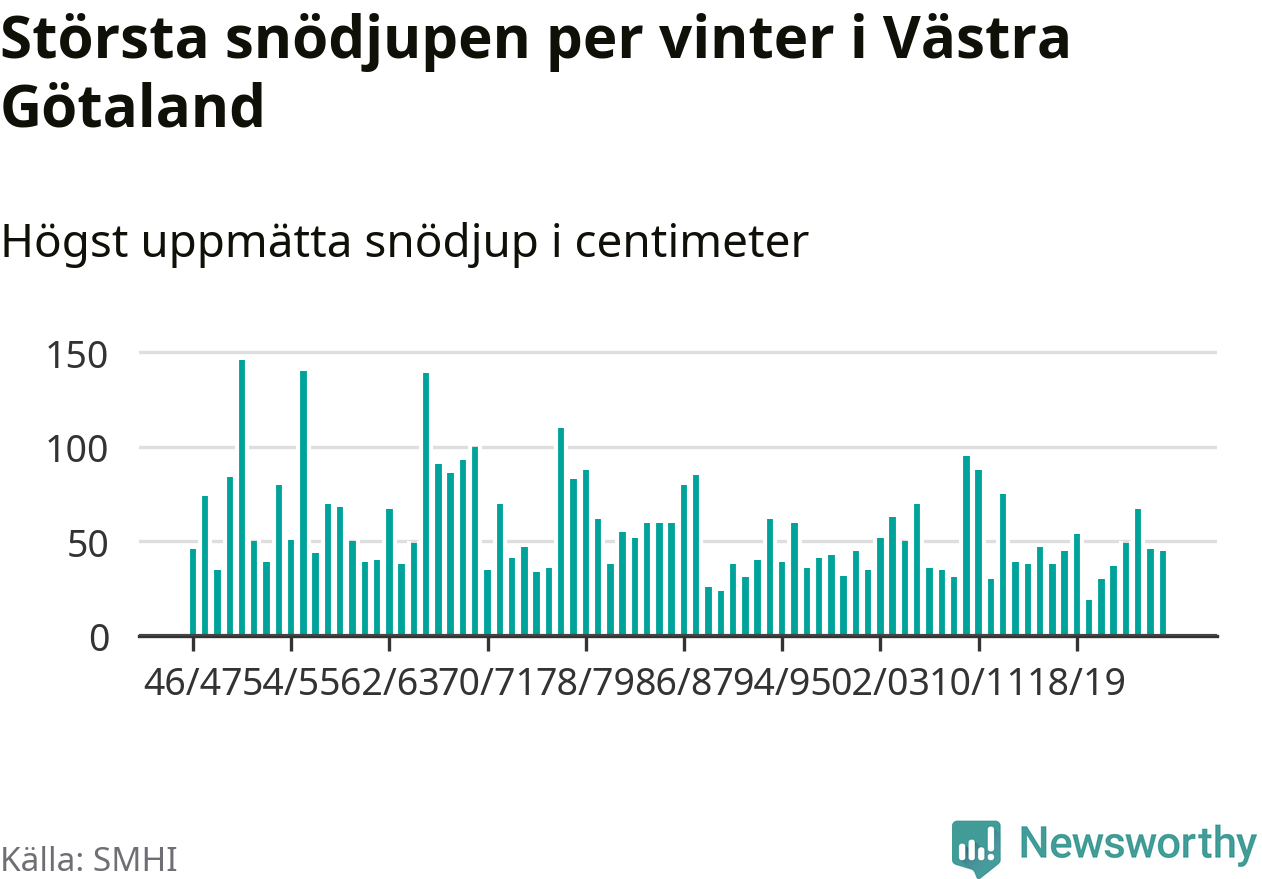Men hur står sig det snödjupet historiskt sett? Newsworthy har tittat på det största snödjup som SMHI har uppmätt i Västra Götalands län varje år sedan vintern 1946/47 – och hittills tar sig årets vinter inte in bland de 25 vintrarna med störst uppmätt snödjup i länet.