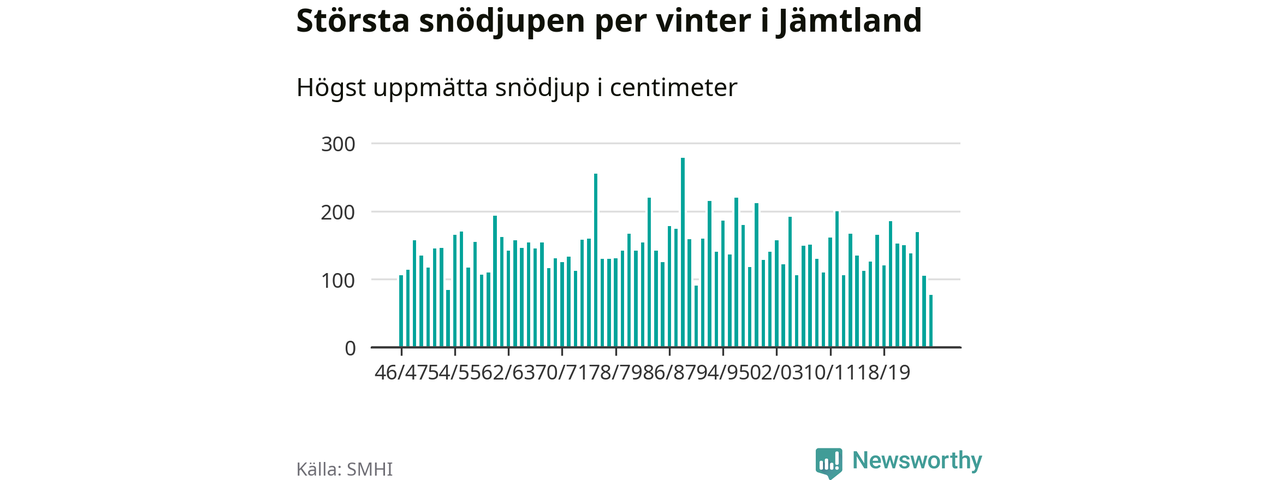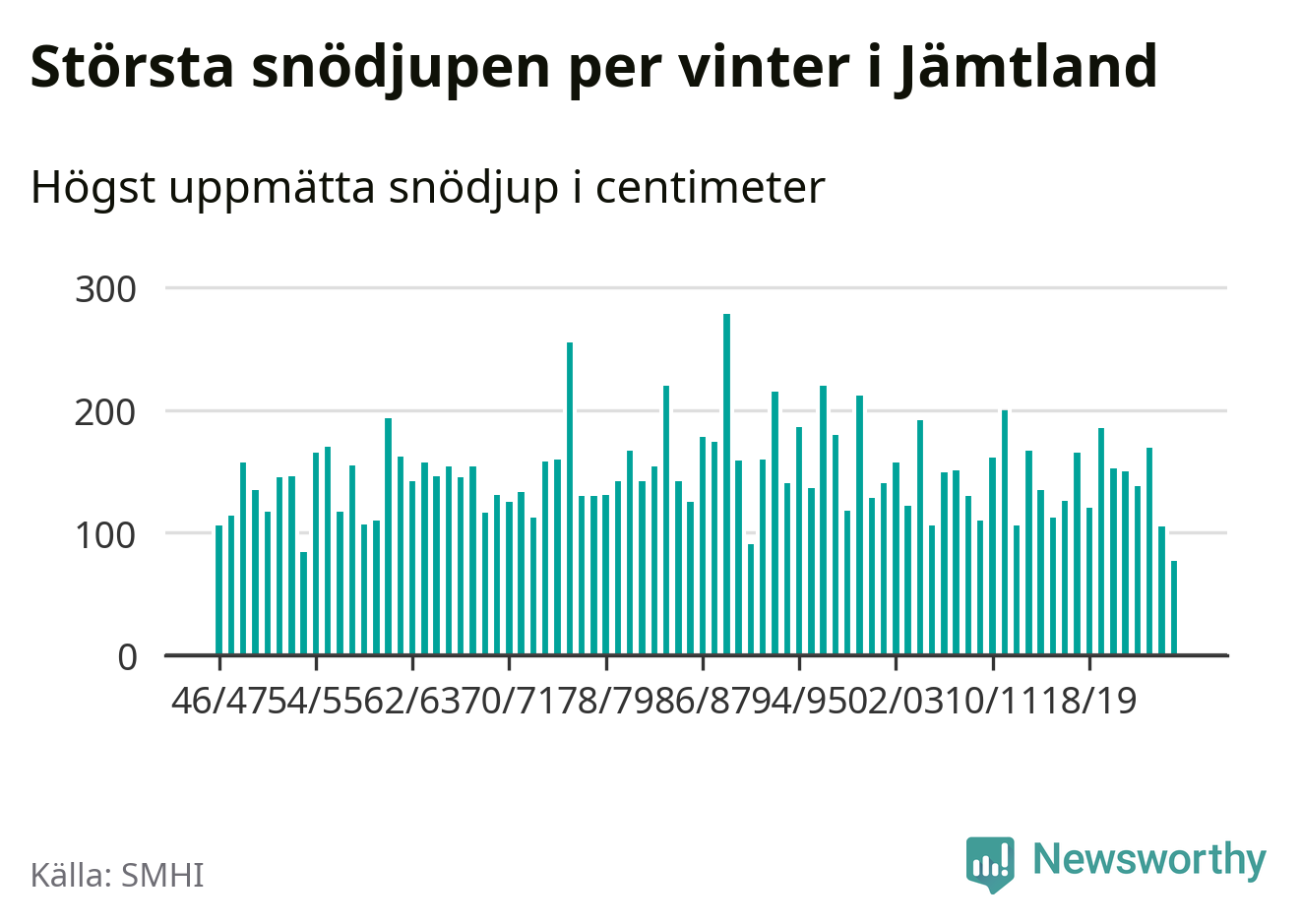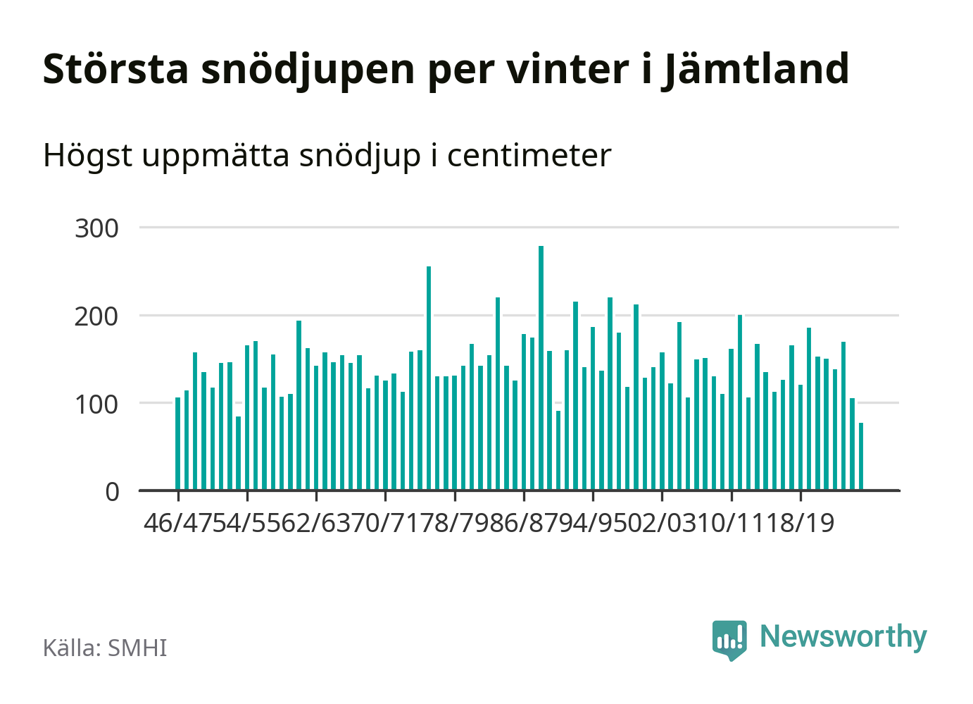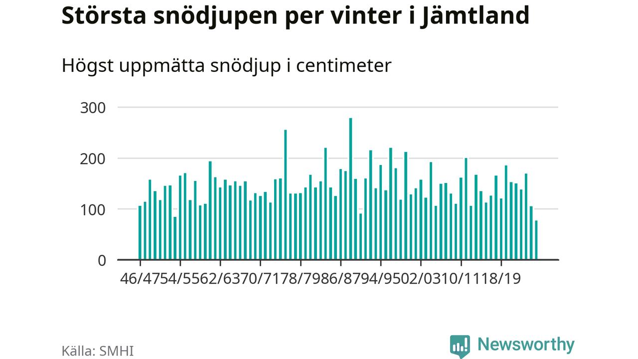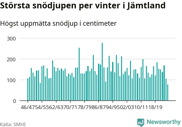 Men hur står sig det snödjupet historiskt sett? Newsworthy har tittat på det största snödjup som SMHI har uppmätt i Jämtlands län varje år sedan vintern 1946/47 – och hittills tar sig årets vinter inte in bland de 25 vintrarna med störst uppmätt snödjup i länet.
