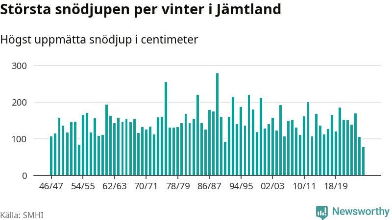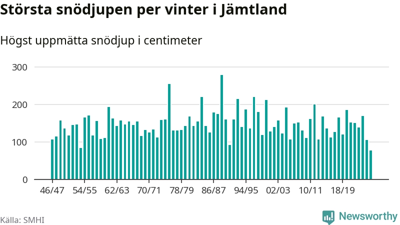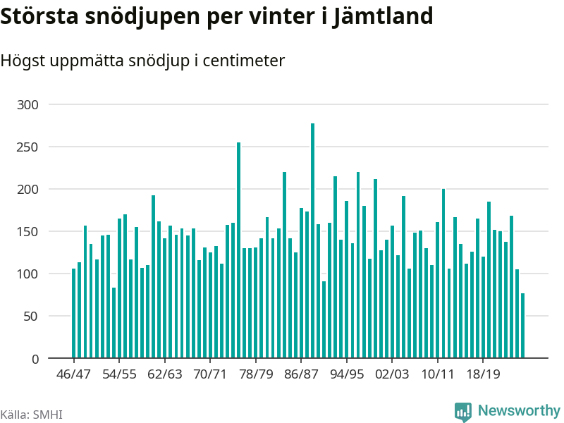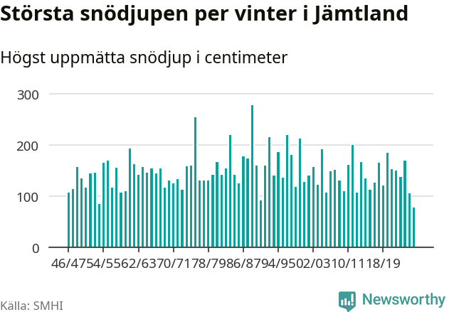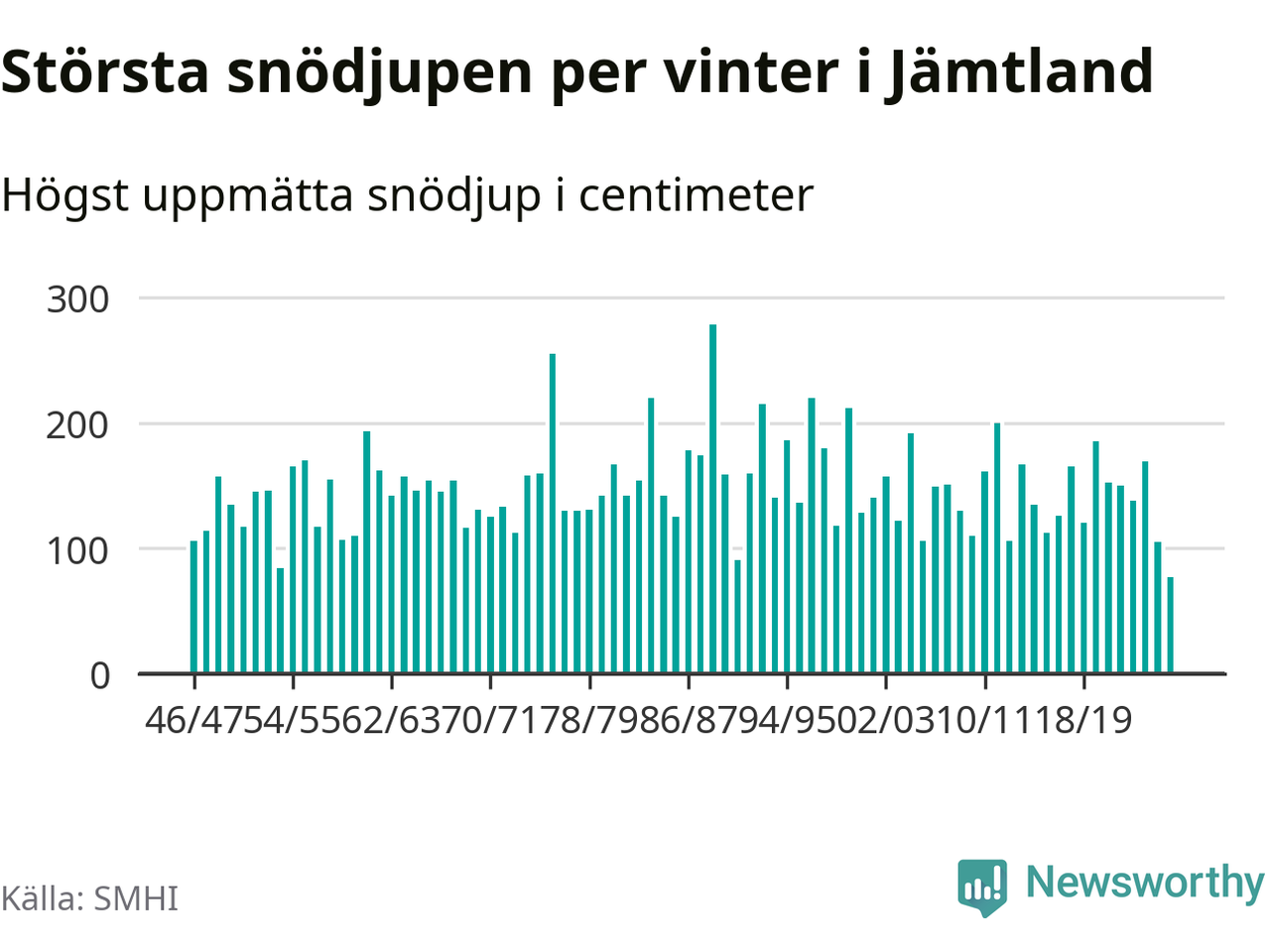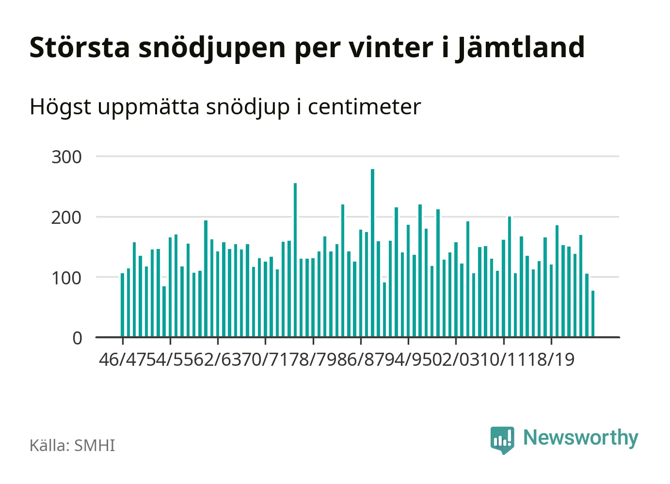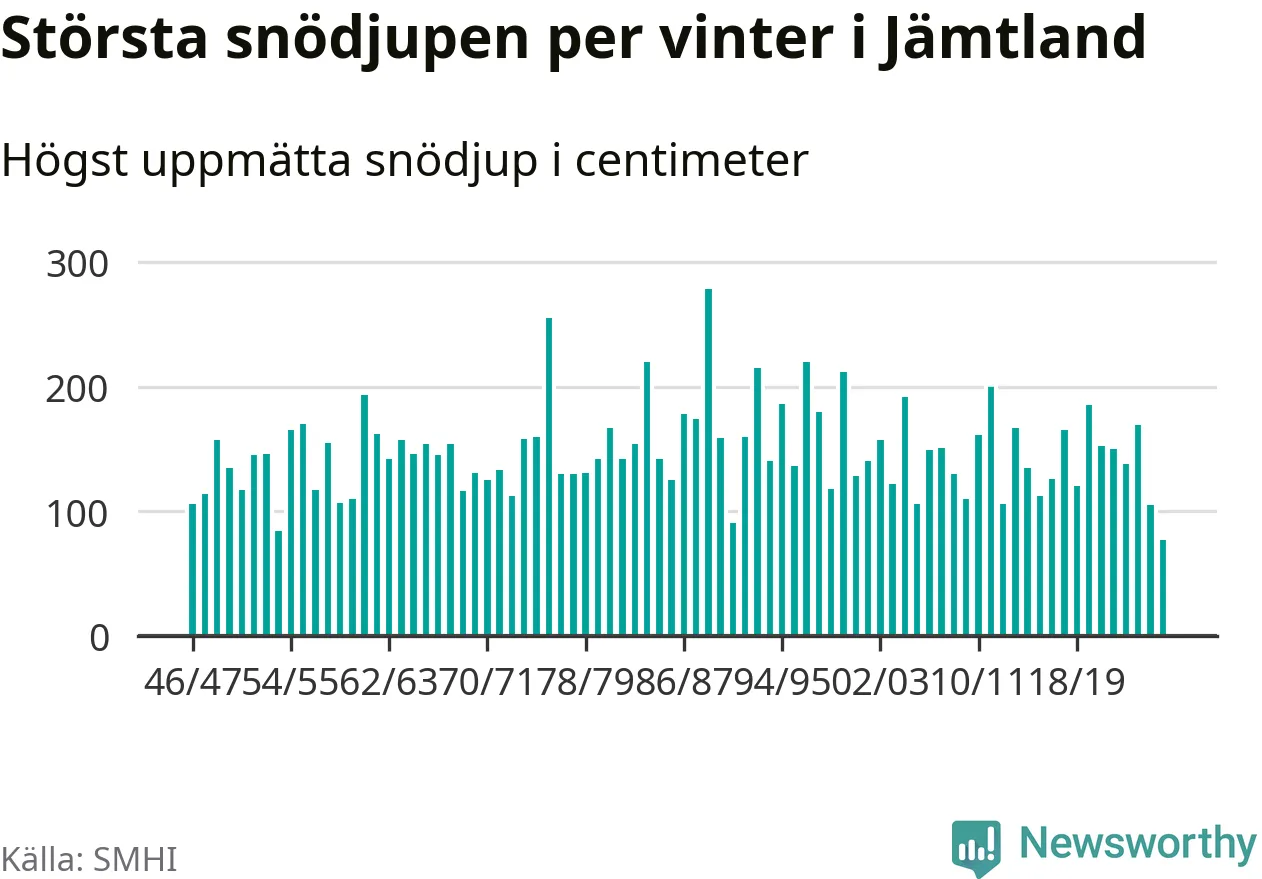 Men hur står sig det snödjupet historiskt sett? Newsworthy har tittat på det största snödjup som SMHI har uppmätt i Jämtlands län varje år sedan vintern 1946/47 – och hittills tar sig årets vinter inte in bland de 25 vintrarna med störst uppmätt snödjup i länet.